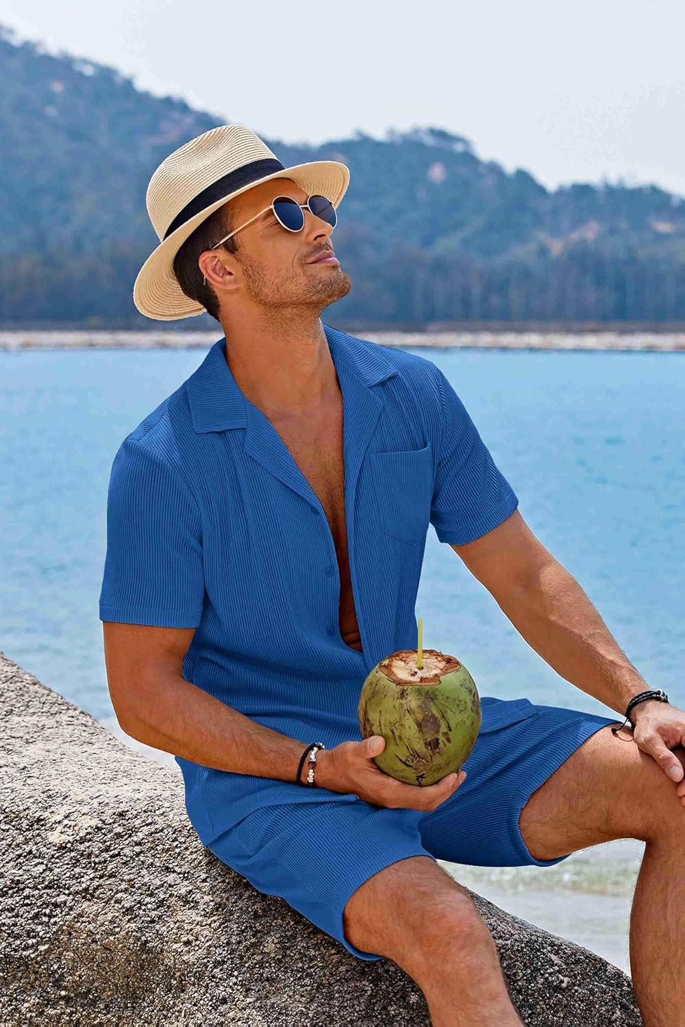 COOFANDY Men’s 2 Pieces Shirt Sets Short Sleeve Casual Button Down Hippie T-Shirts Shorts Sets Summer Fashion Beach Outfits(Lake Blue)