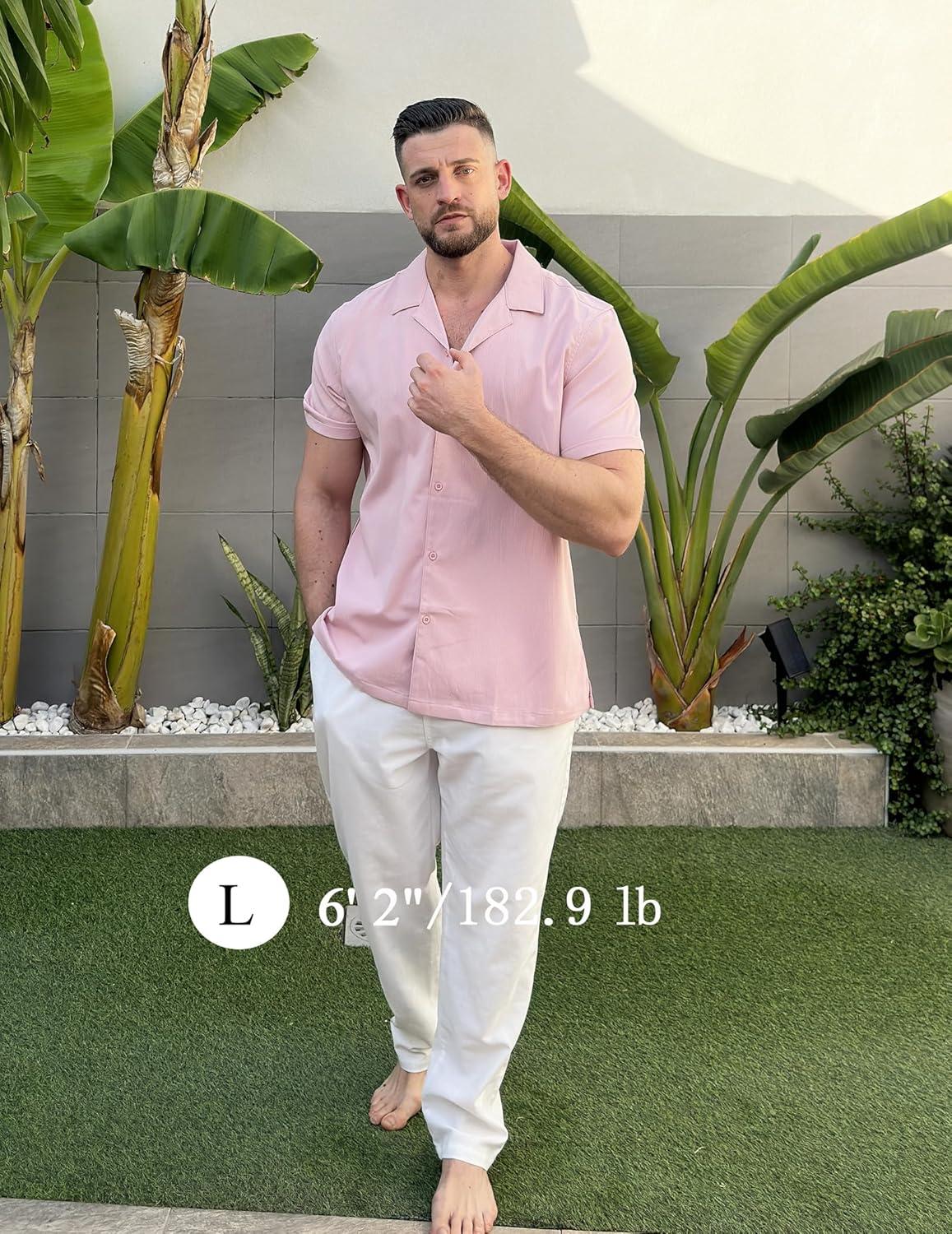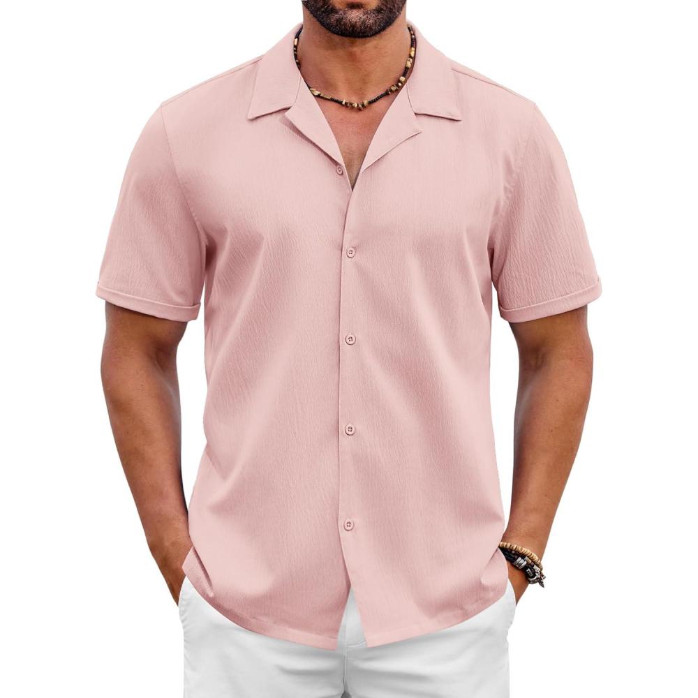 COOFANDY Mens 2025 Fashion Textured Shirts Short Sleeve Summer Beach Shirt Casual Button Down Shirts(Pink)