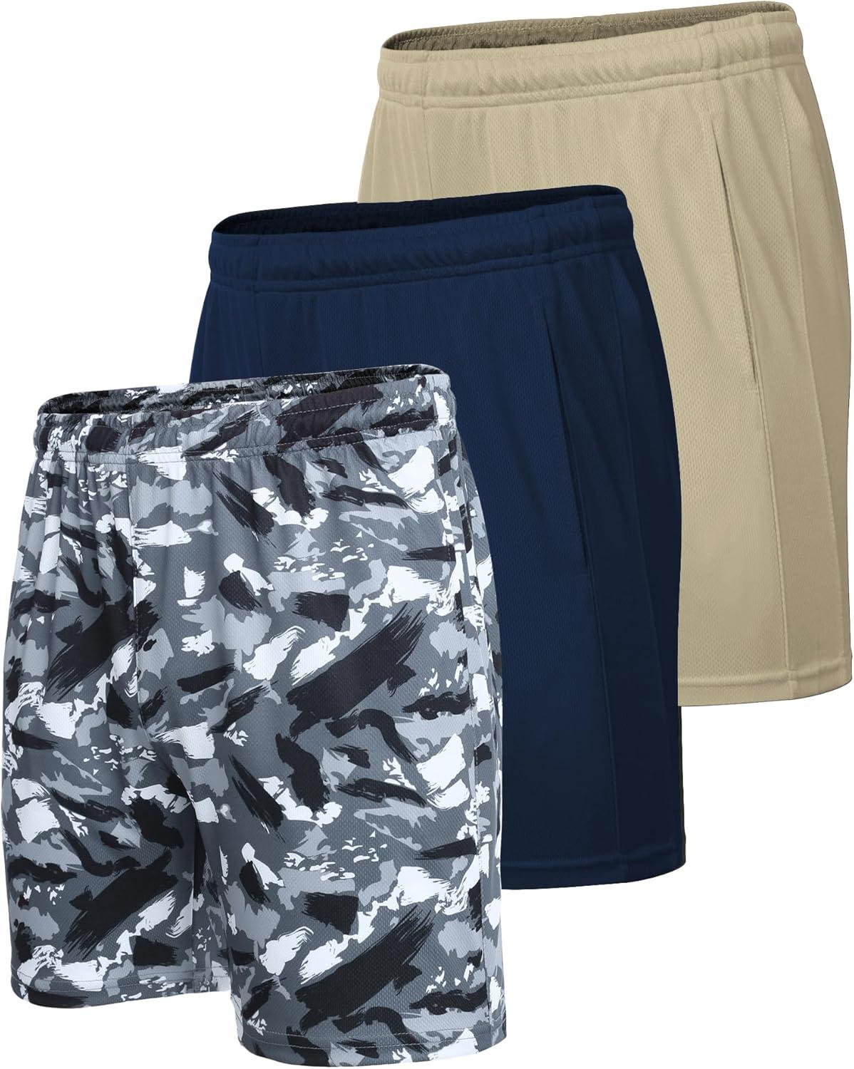 COOFANDY Men's 3 Pack Workout Gym Shorts Mesh Athletic Shorts Lightweight Bodybuilding Training Short Pants with Pockets(Camo / Khaki / Navy Blue)