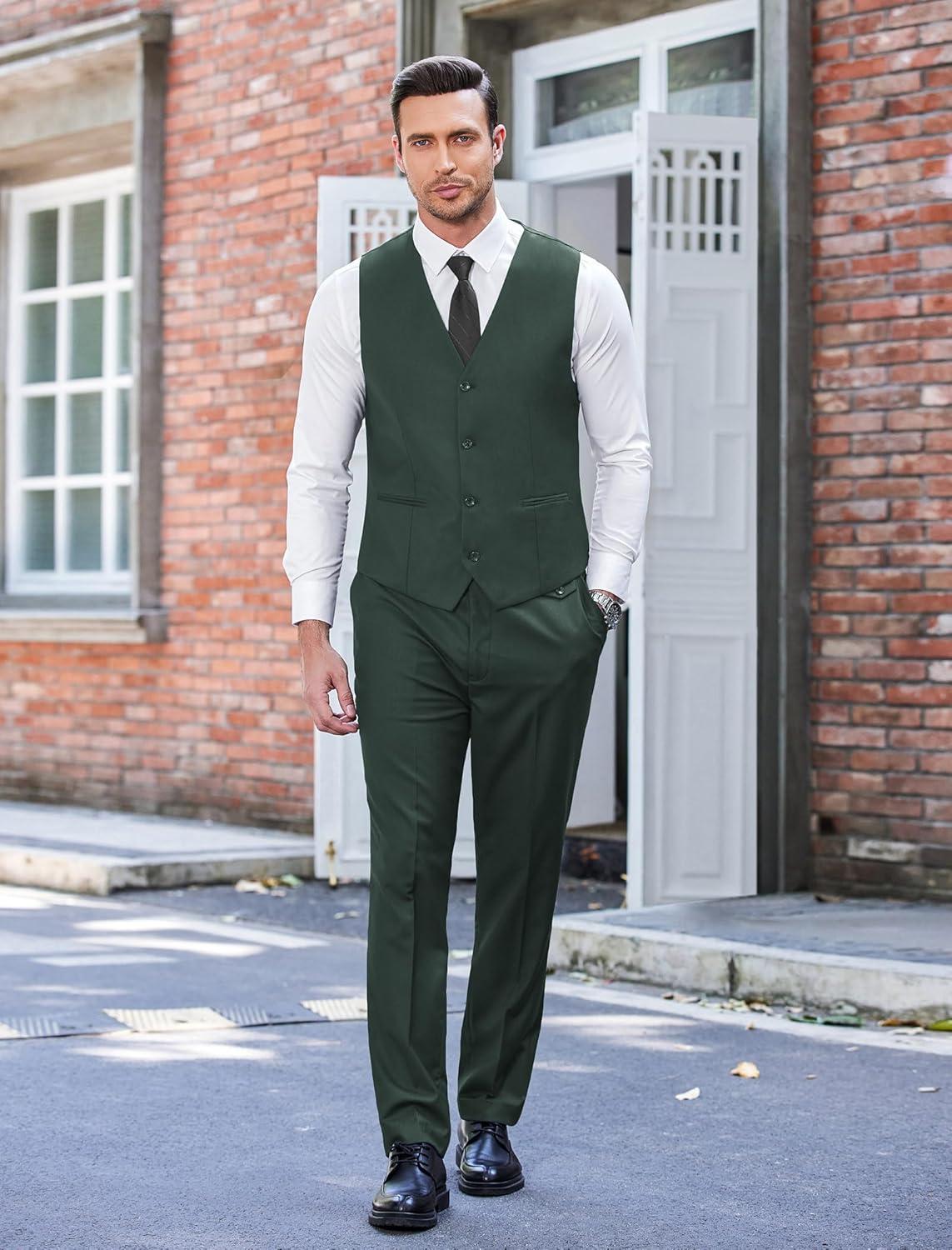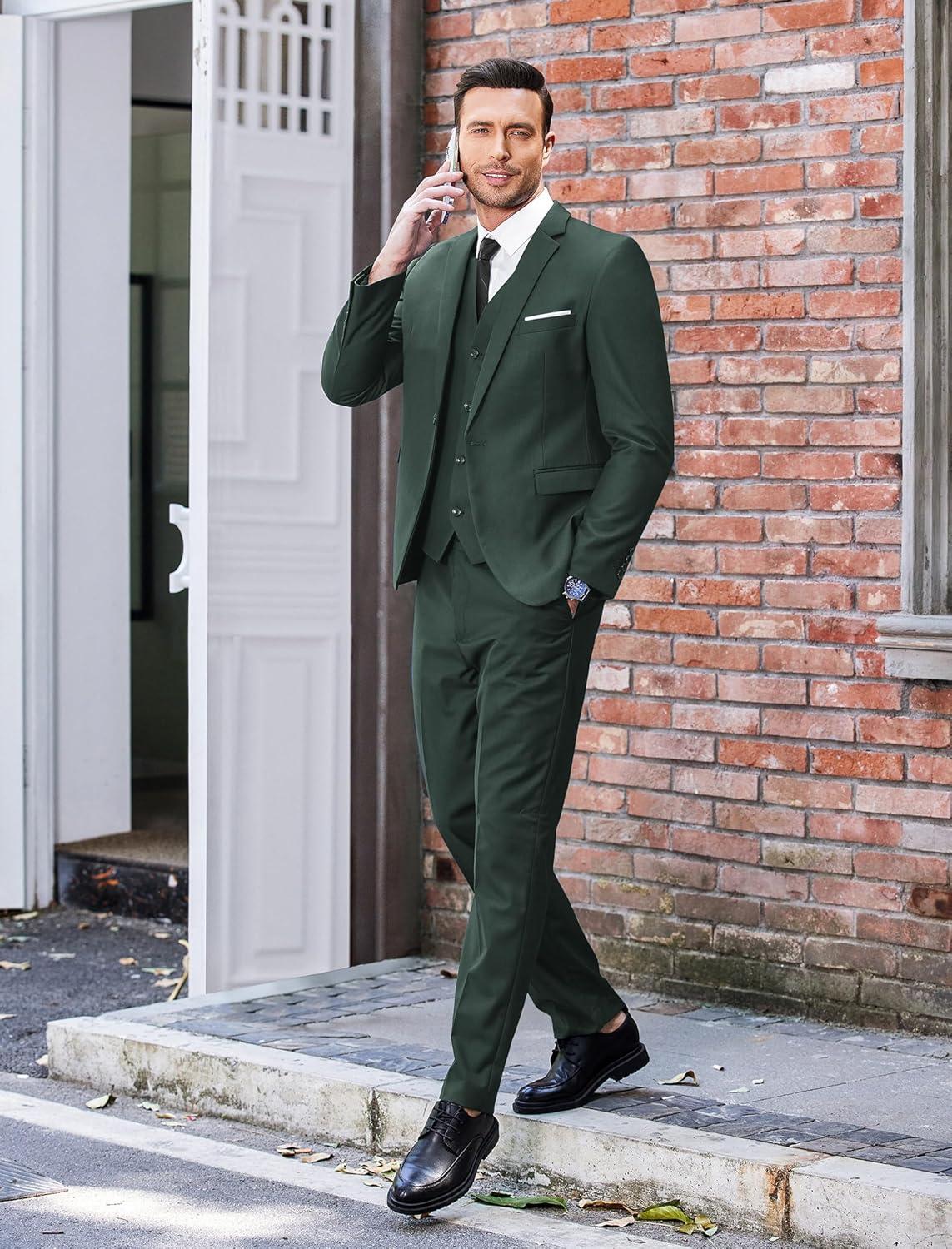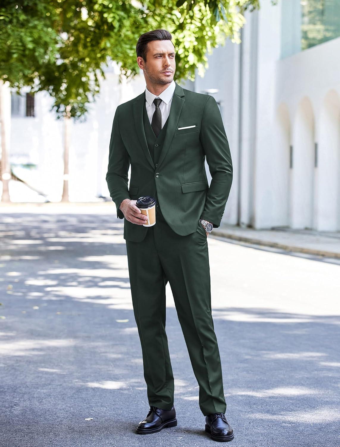COOFANDY Men's 3 Piece Wedding Suit Set One Button Slim Fit Jacket Blazer Vest Pants Set Groom Prom Tuxedo Suits(Dark Green)
