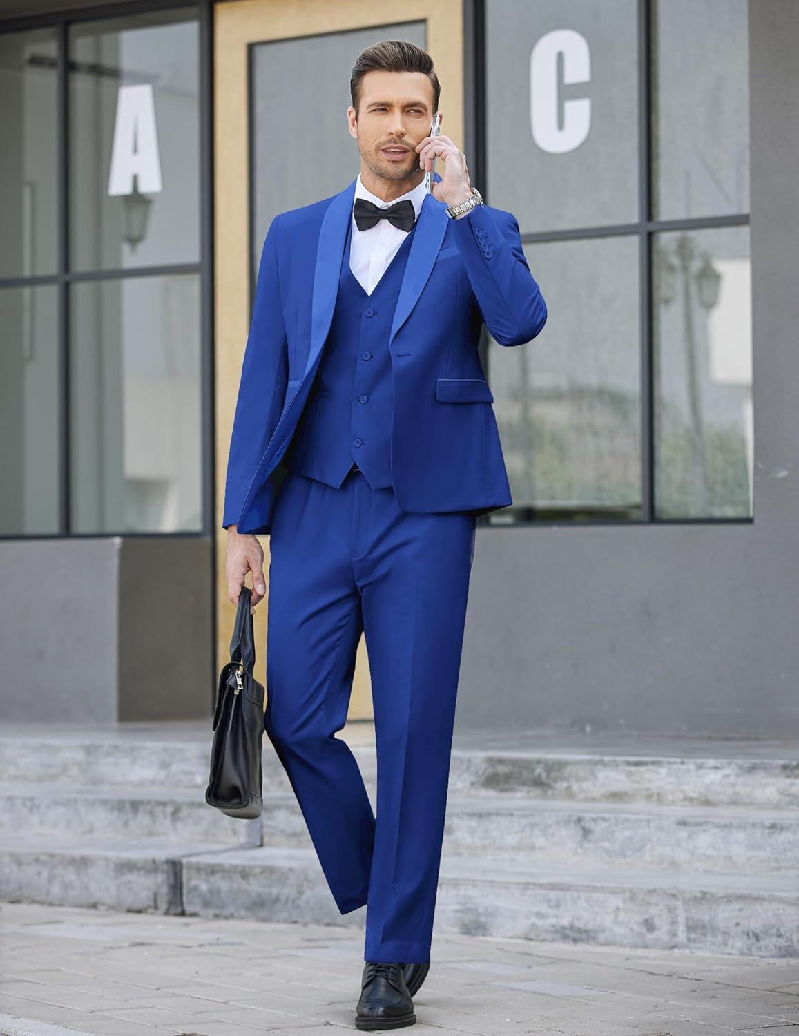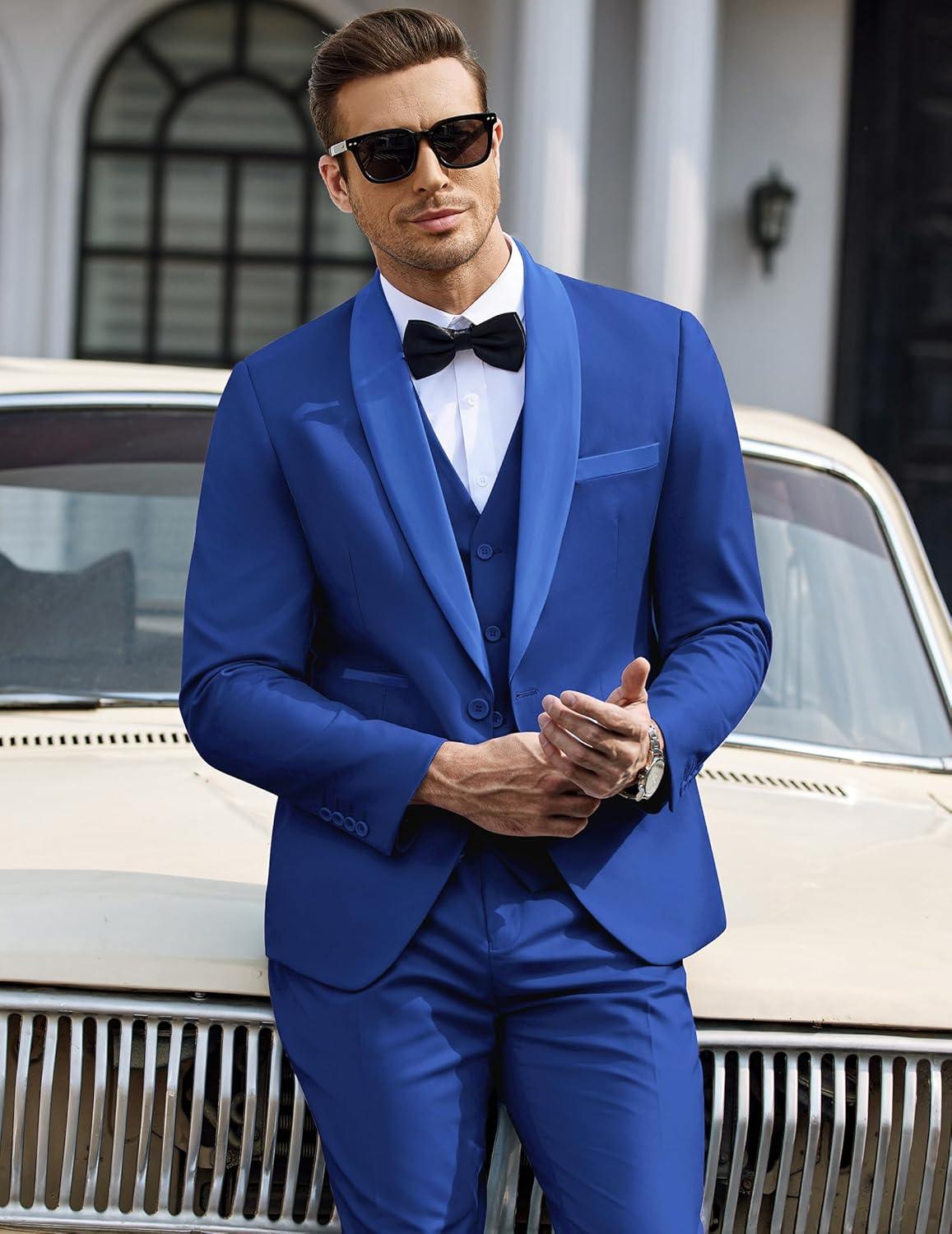 COOFANDY Men's 3 Pieces Suit Slim Fit Tuxedo Set One Button Shawl Lapel Dinner Prom Jacket Vest Pants with Tie(Blue)