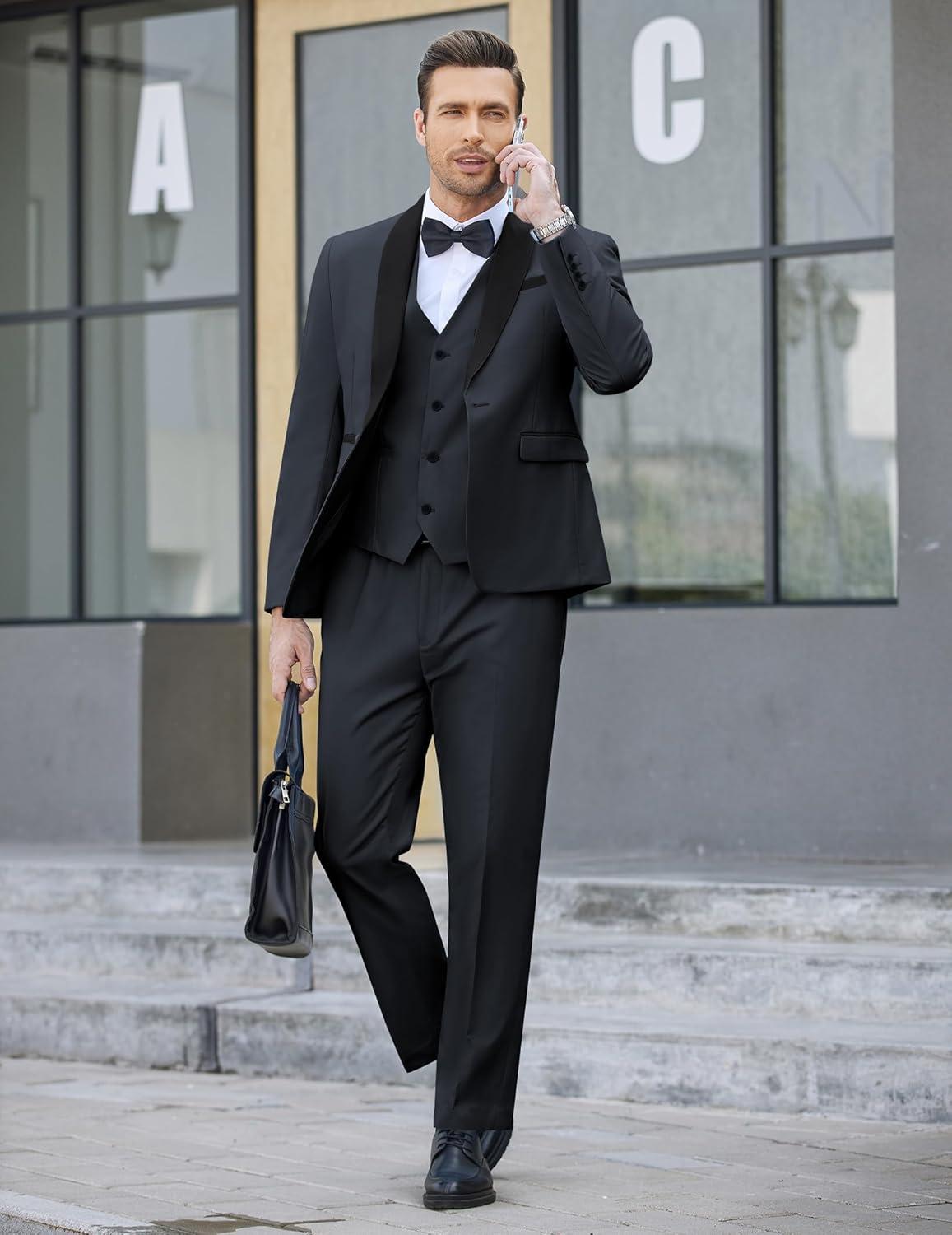 COOFANDY Men’s 3 Pieces Suit Slim Fit Tuxedo Set One Button Shawl Lapel Dinner Prom Jacket Vest Pants with Tie(Black)