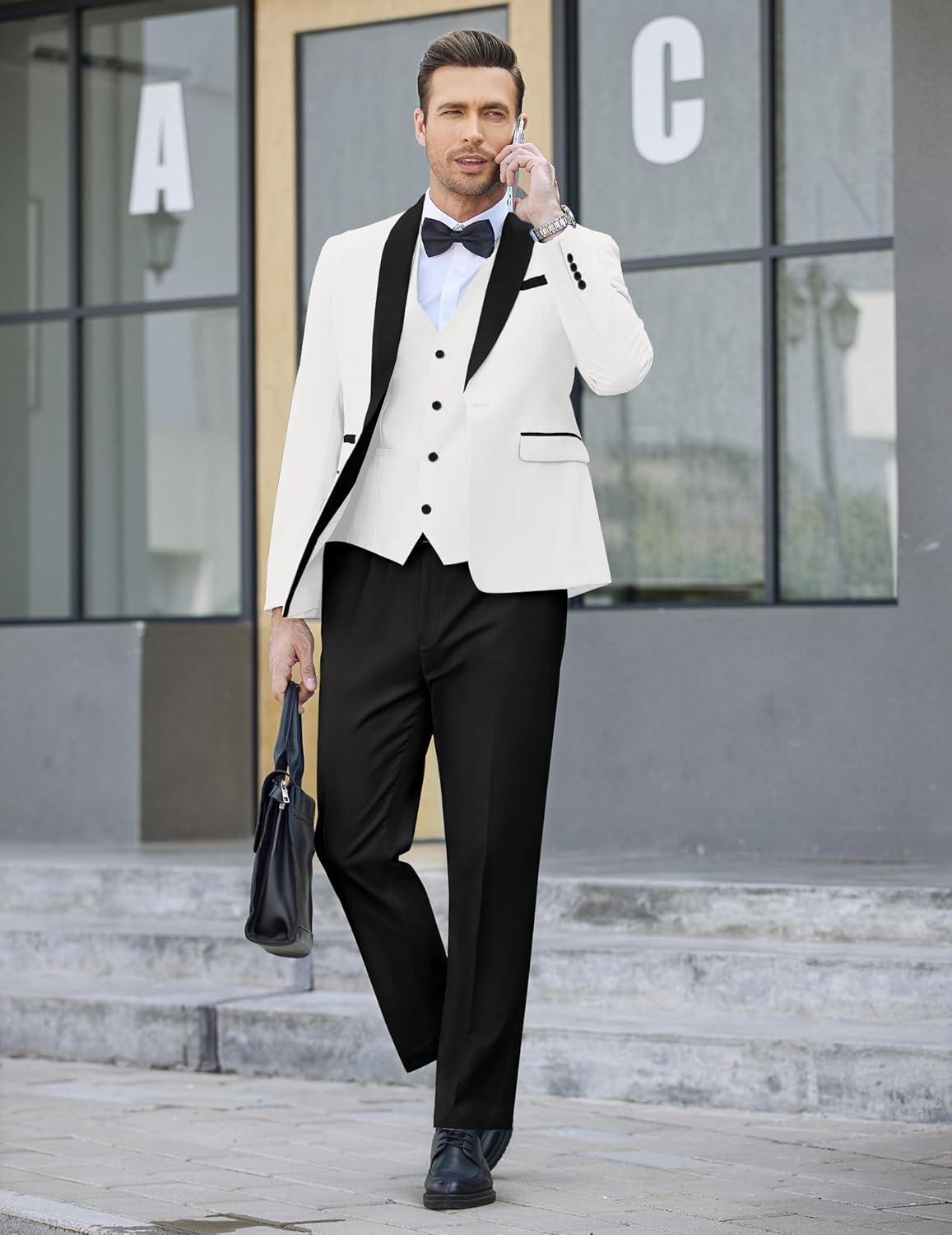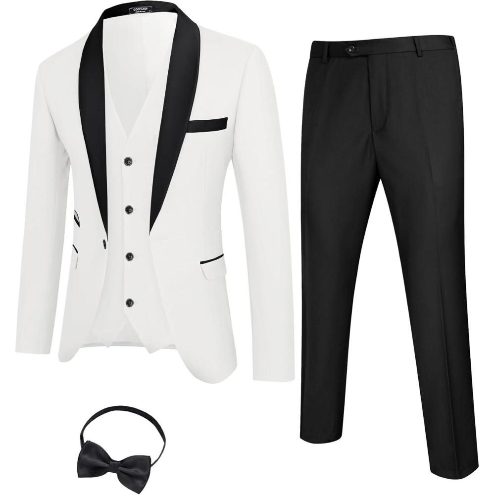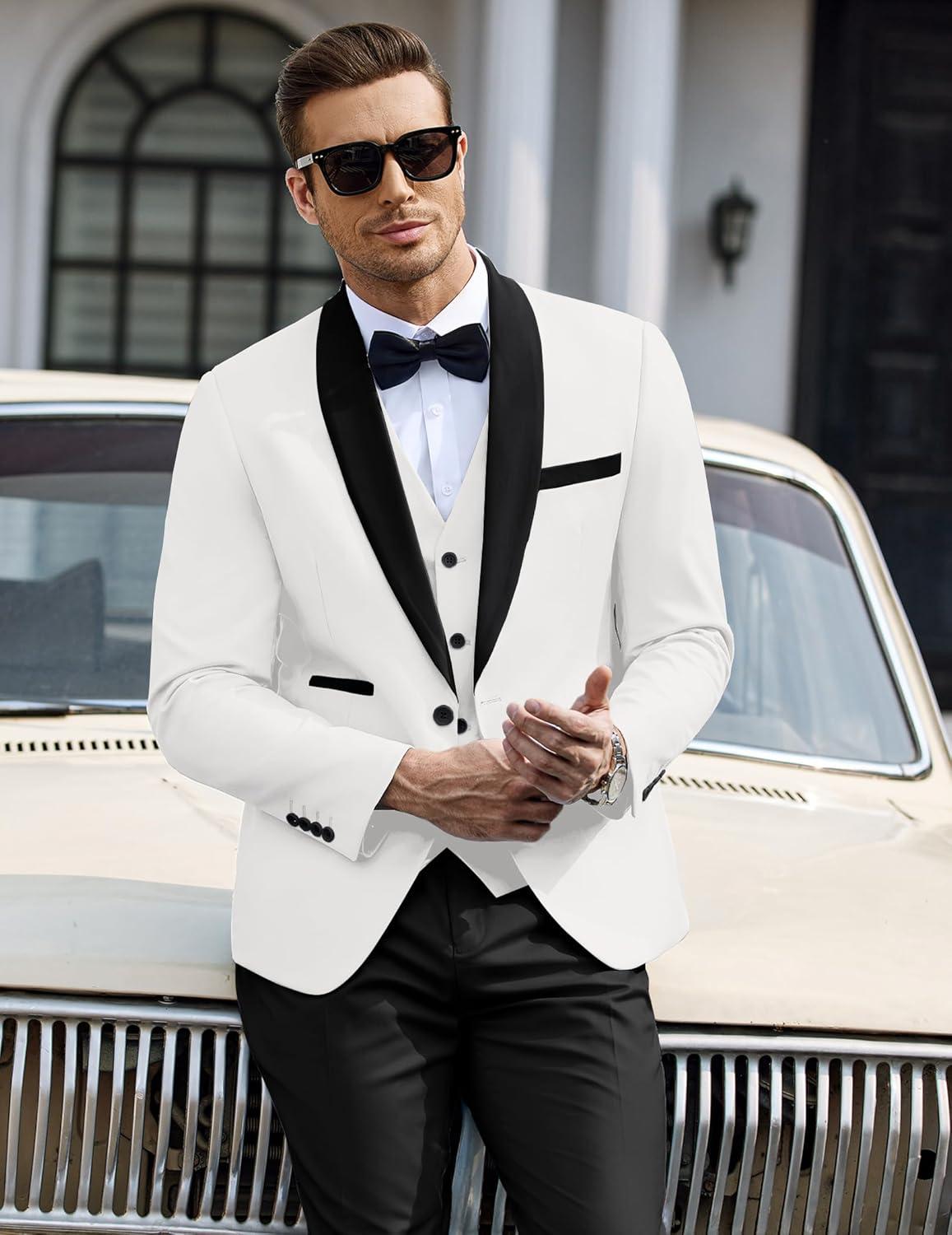 COOFANDY Men's 3 Pieces Suit Slim Fit Tuxedo Set One Button Shawl Lapel Dinner Prom Jacket Vest Pants with Tie(White/Black)