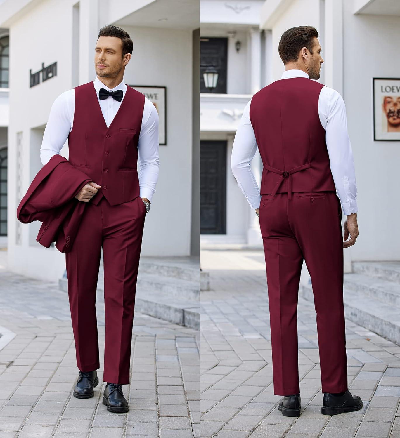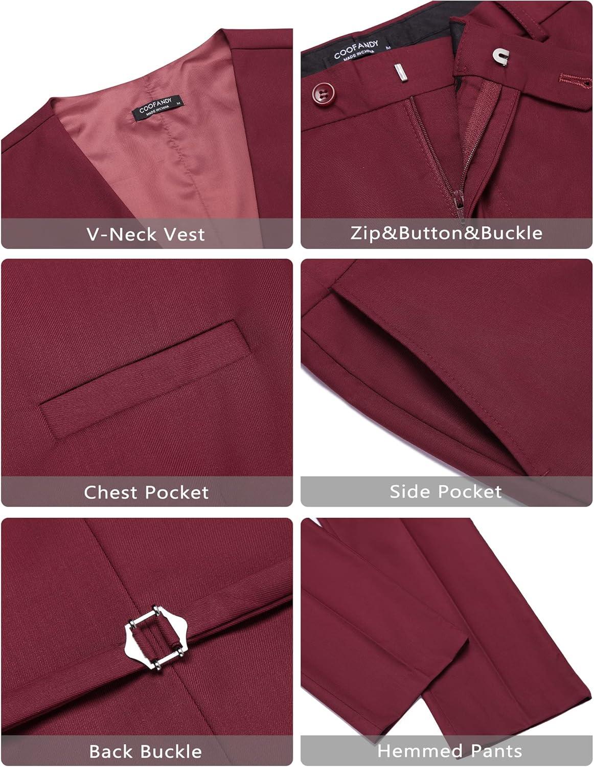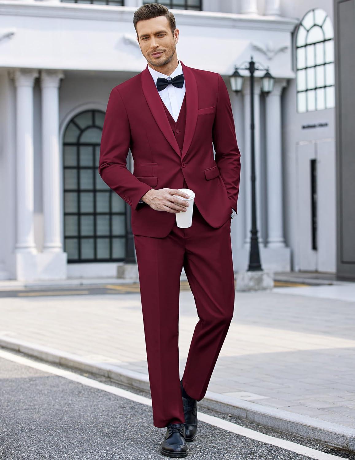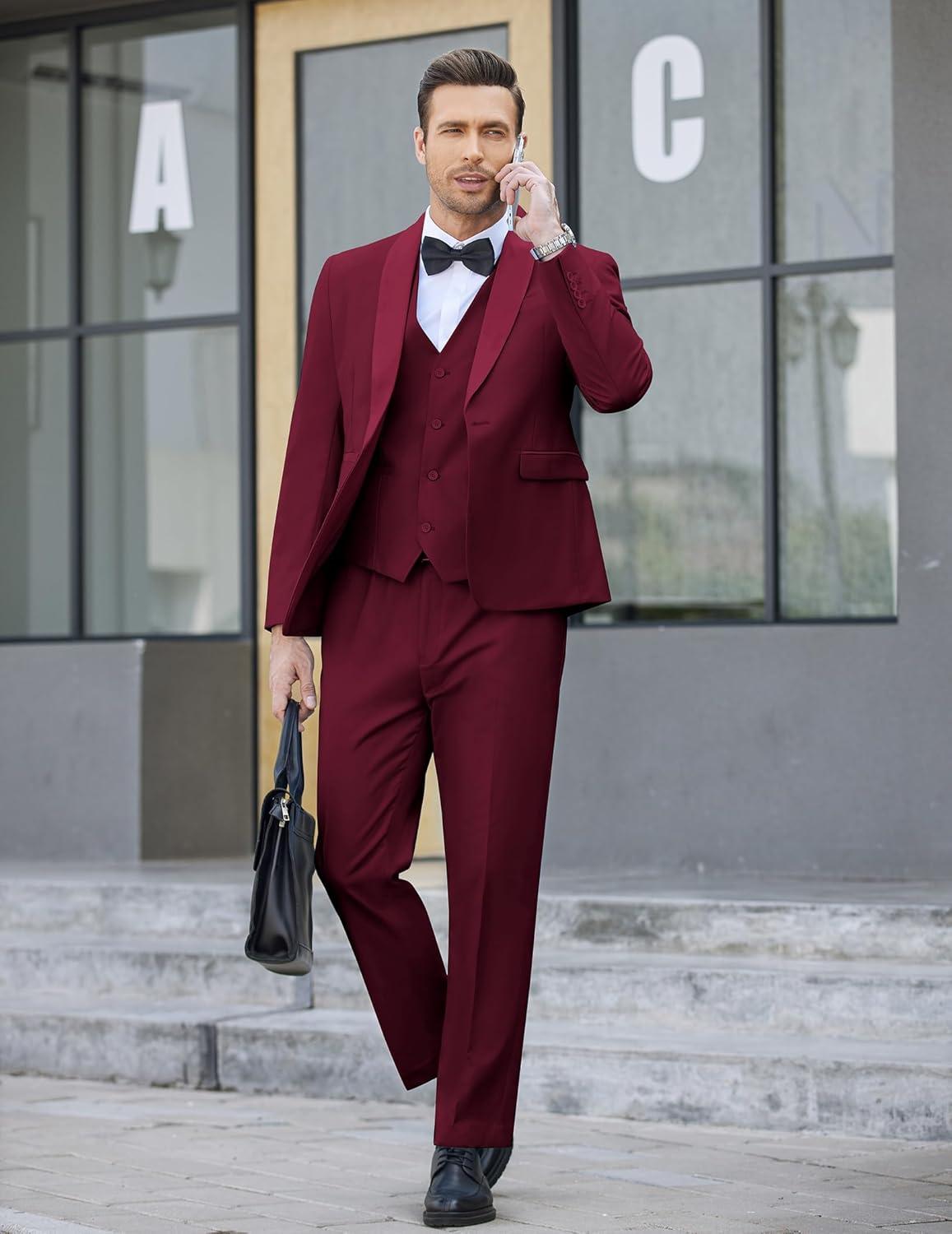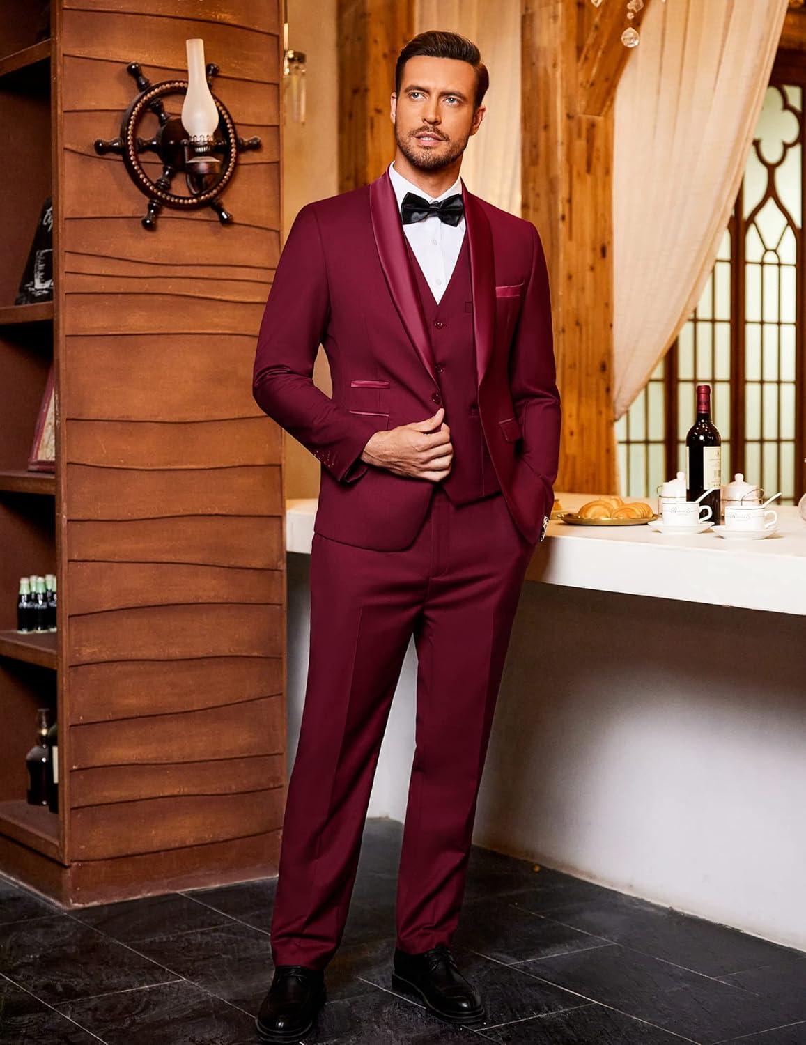 COOFANDY Men’s 3 Pieces Suit Slim Fit Tuxedo Set One Button Shawl Lapel Dinner Prom Jacket Vest Pants with Tie(Wine Red)