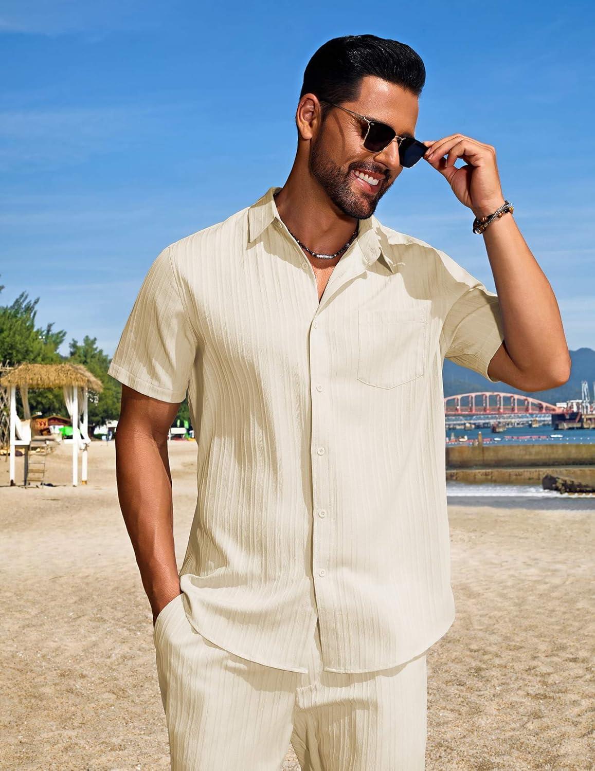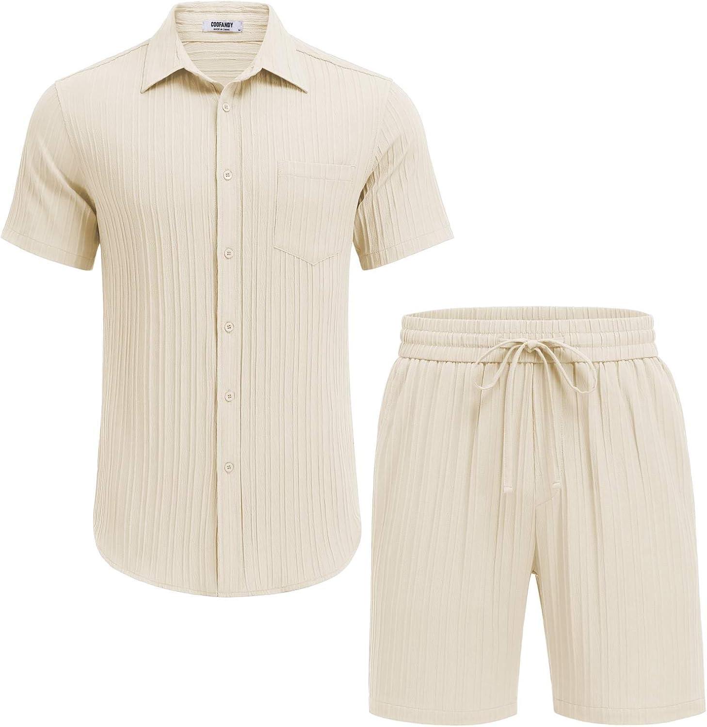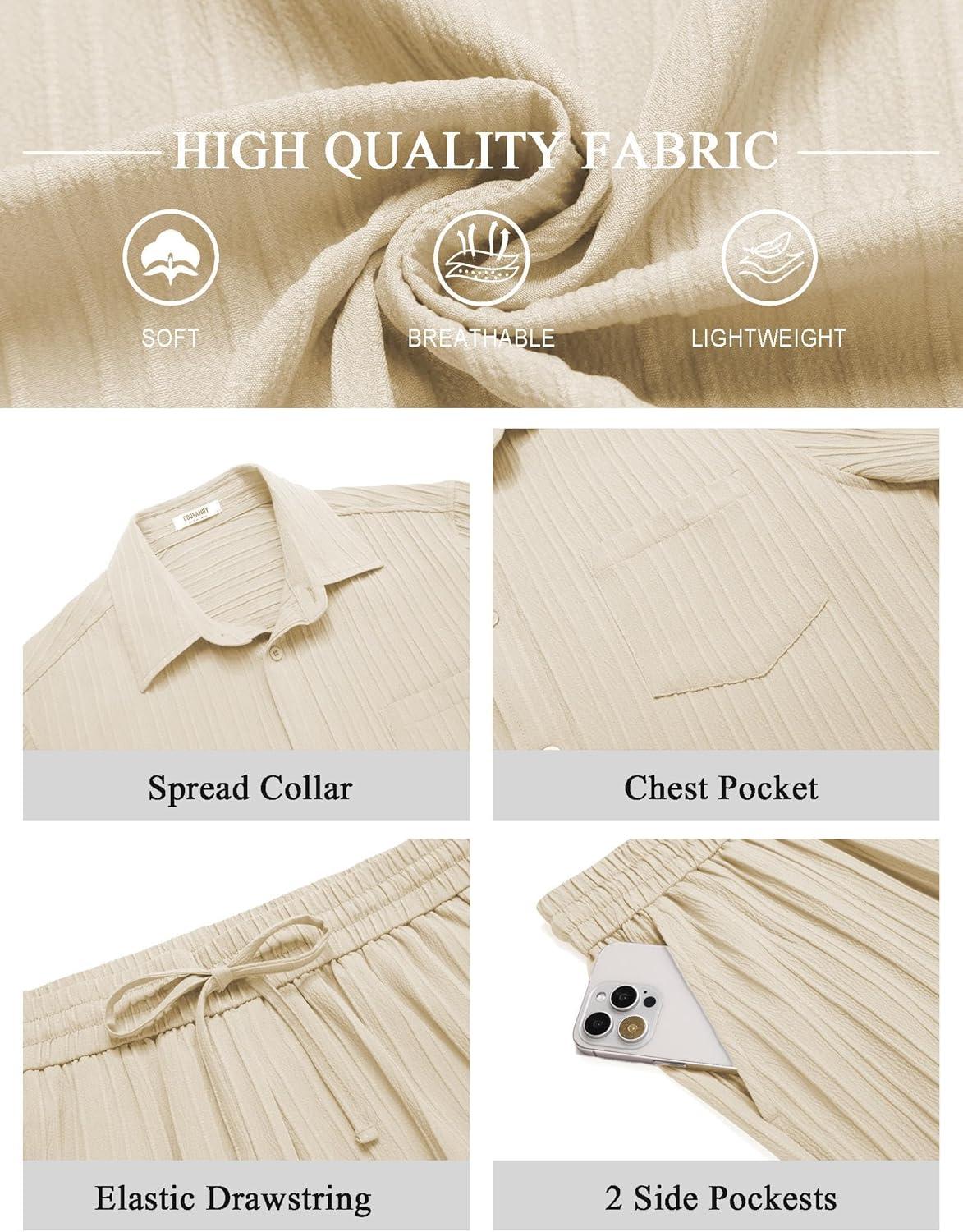 COOFANDY Mens Beach Outfits 2 Piece Sets Casual Short Sleeve Button Down Summer Textured Shirt(Beige)