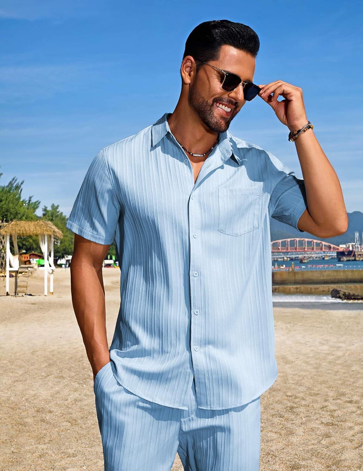 COOFANDY Mens Beach Outfits 2 Piece Sets Casual Short Sleeve Button Down Summer Textured Shirt(Light Blue)