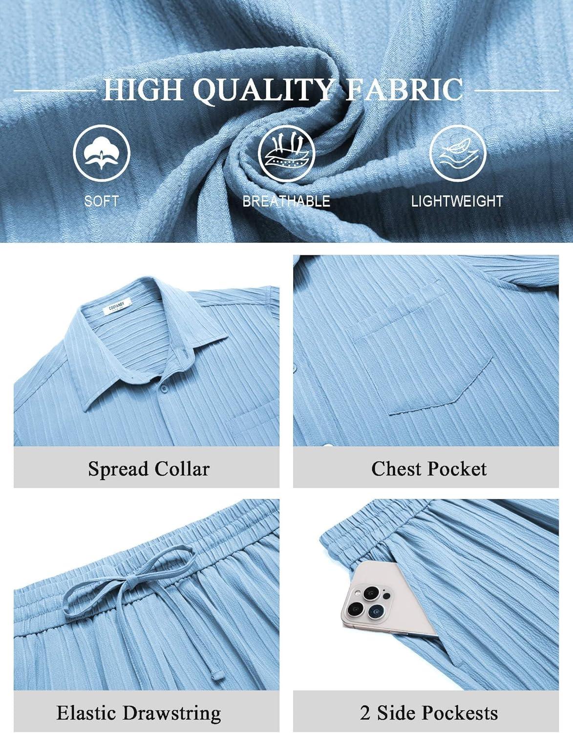 COOFANDY Mens Beach Outfits 2 Piece Sets Casual Short Sleeve Button Down Summer Textured Shirt(Blue)
