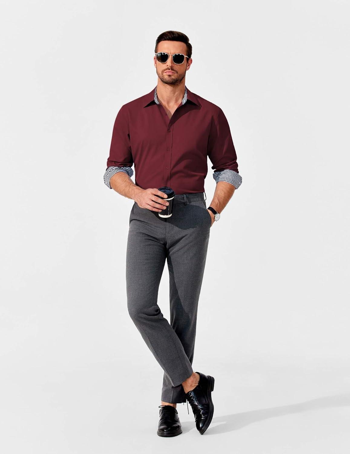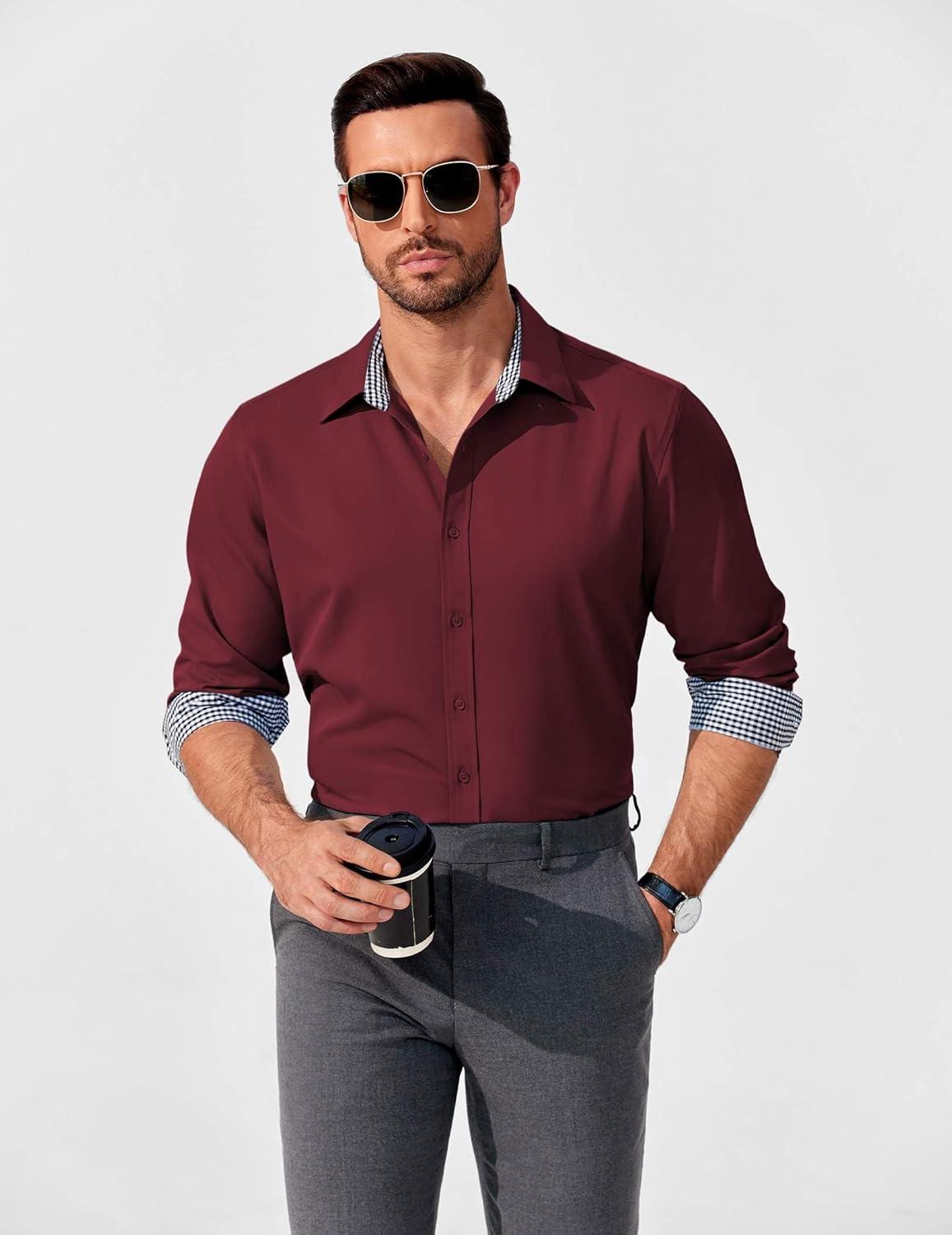 COOFANDY Men’s Business Dress Shirt Long Sleeve Slim Fit Casual Button Down Shirt(03_wine Red Solid)