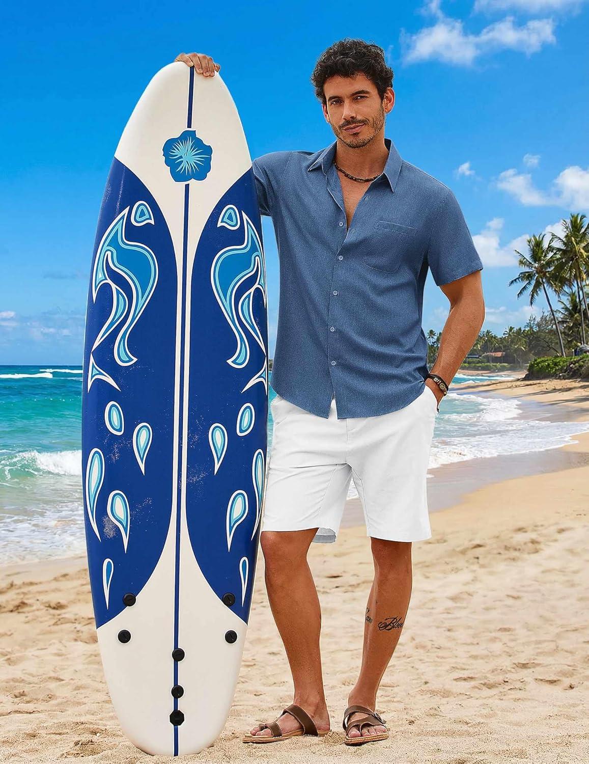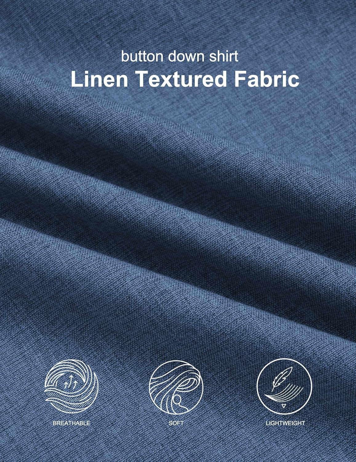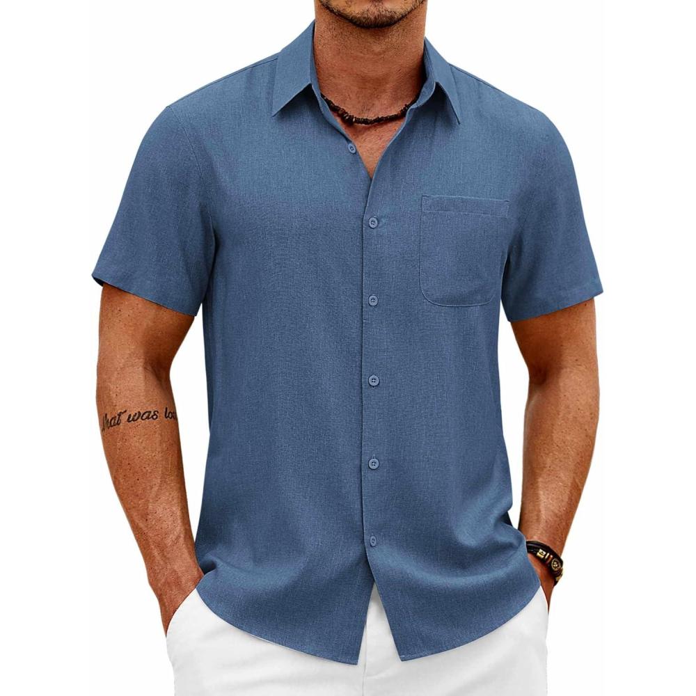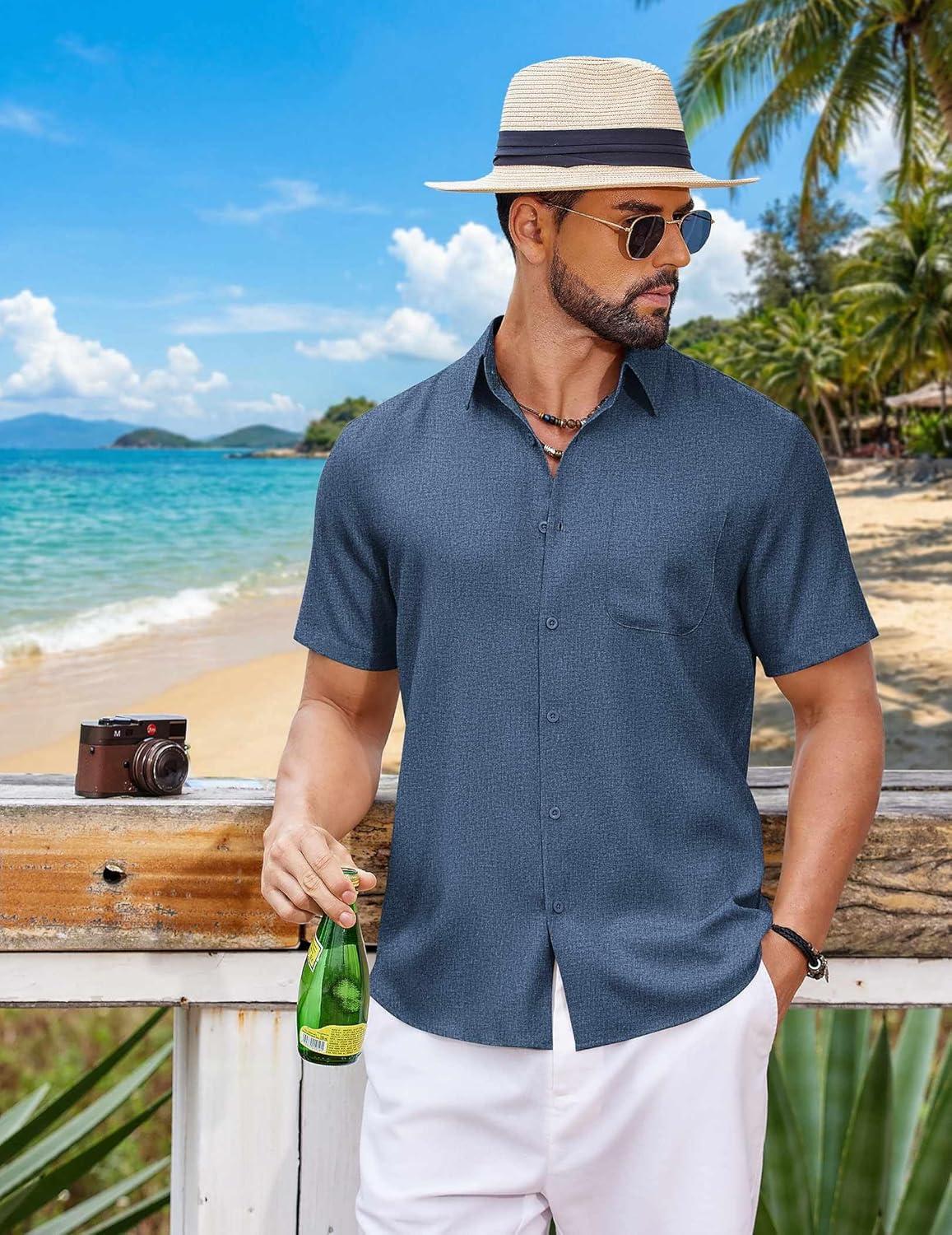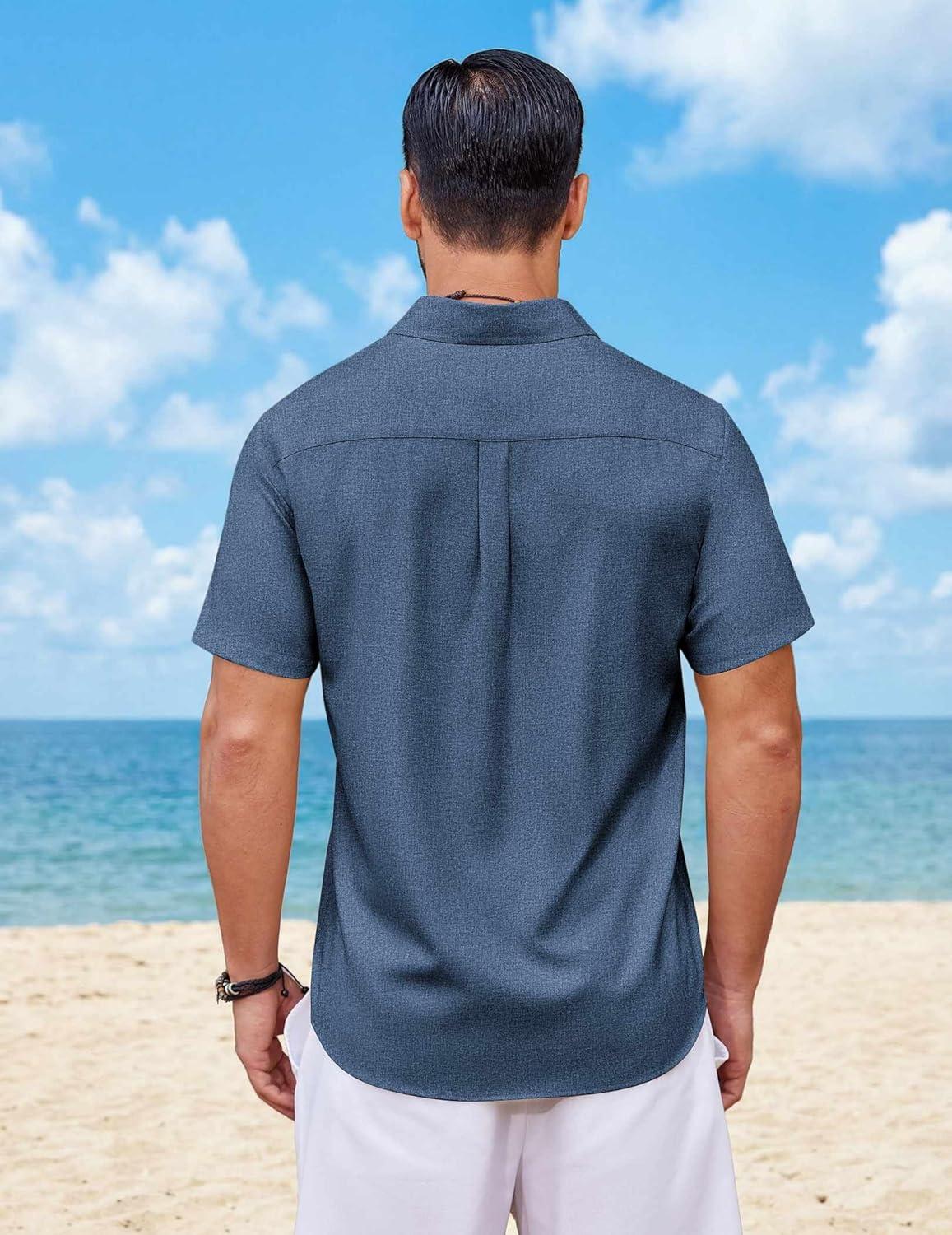 COOFANDY Mens Button Down Shirt Short Sleeve Casual Shirts Summer Beach Wedding Linen Shirt with Pocket(Blue)