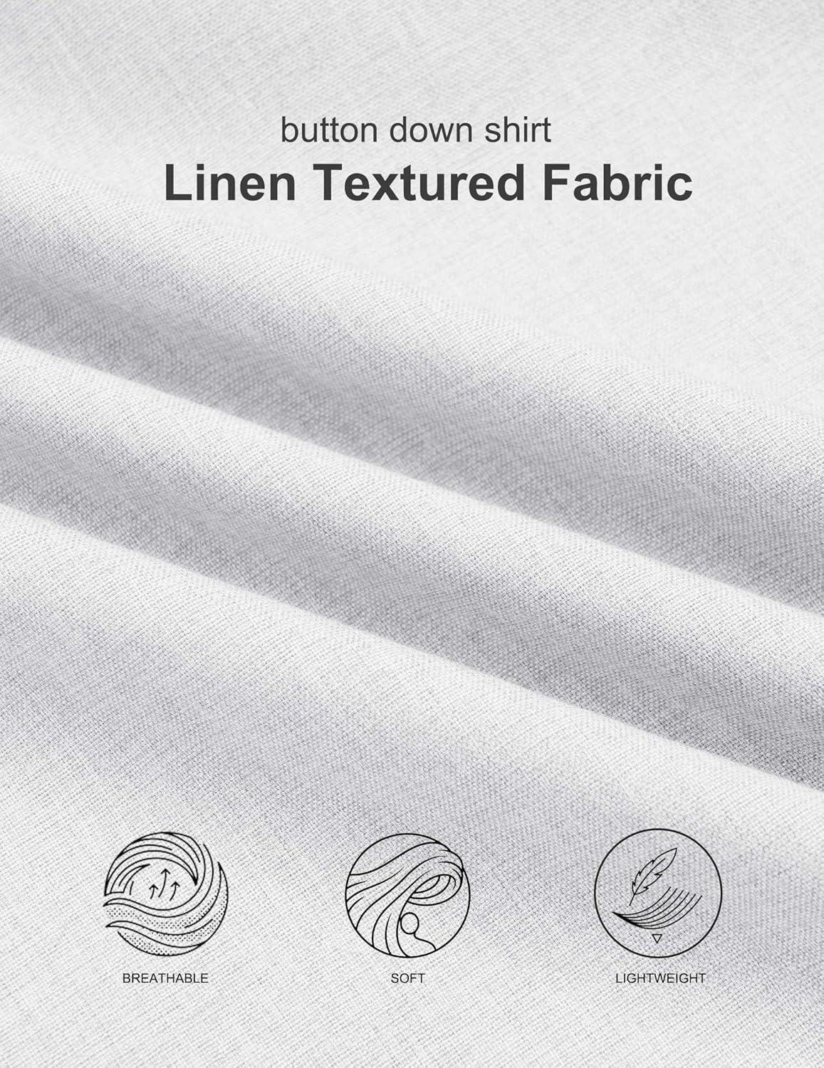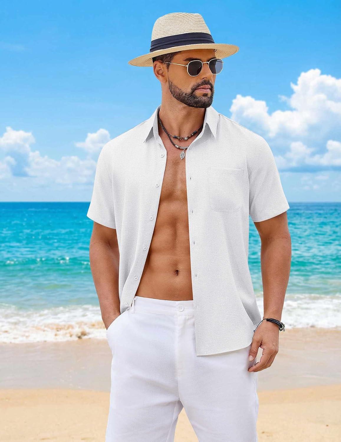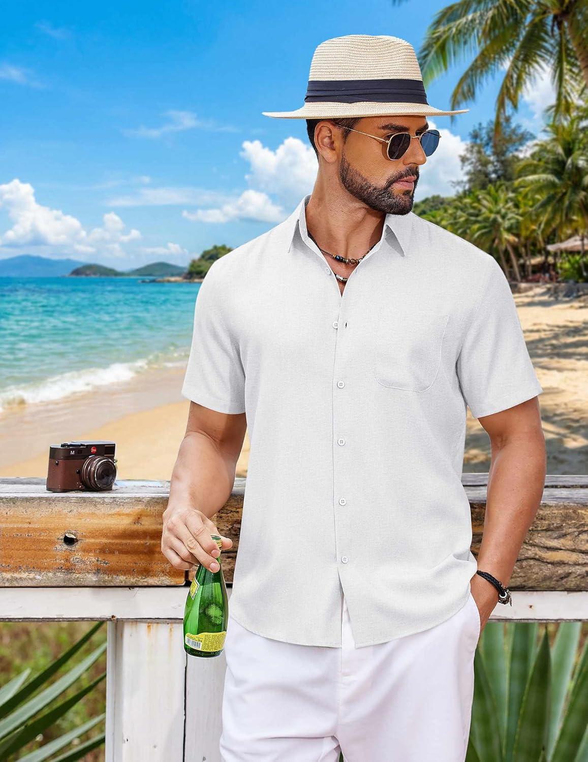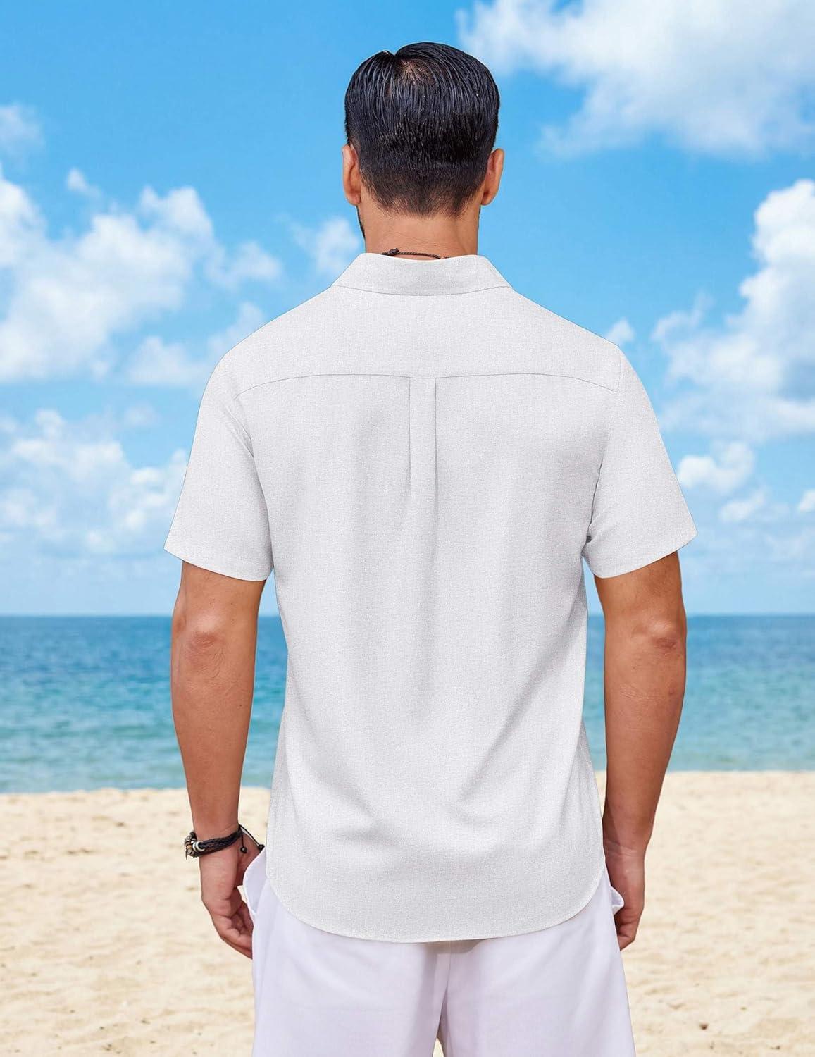 COOFANDY Mens Button Down Shirt Short Sleeve Casual Shirts Summer Beach Wedding Linen Shirt with Pocket(White)