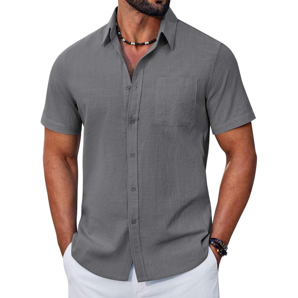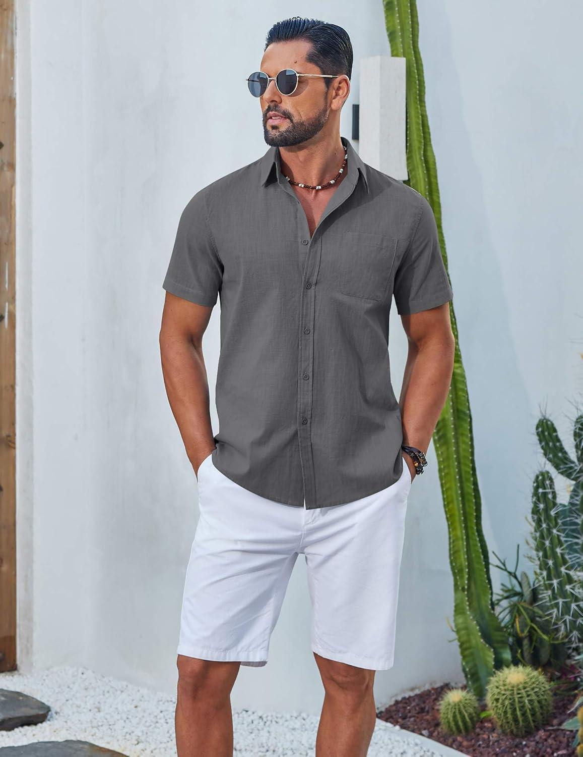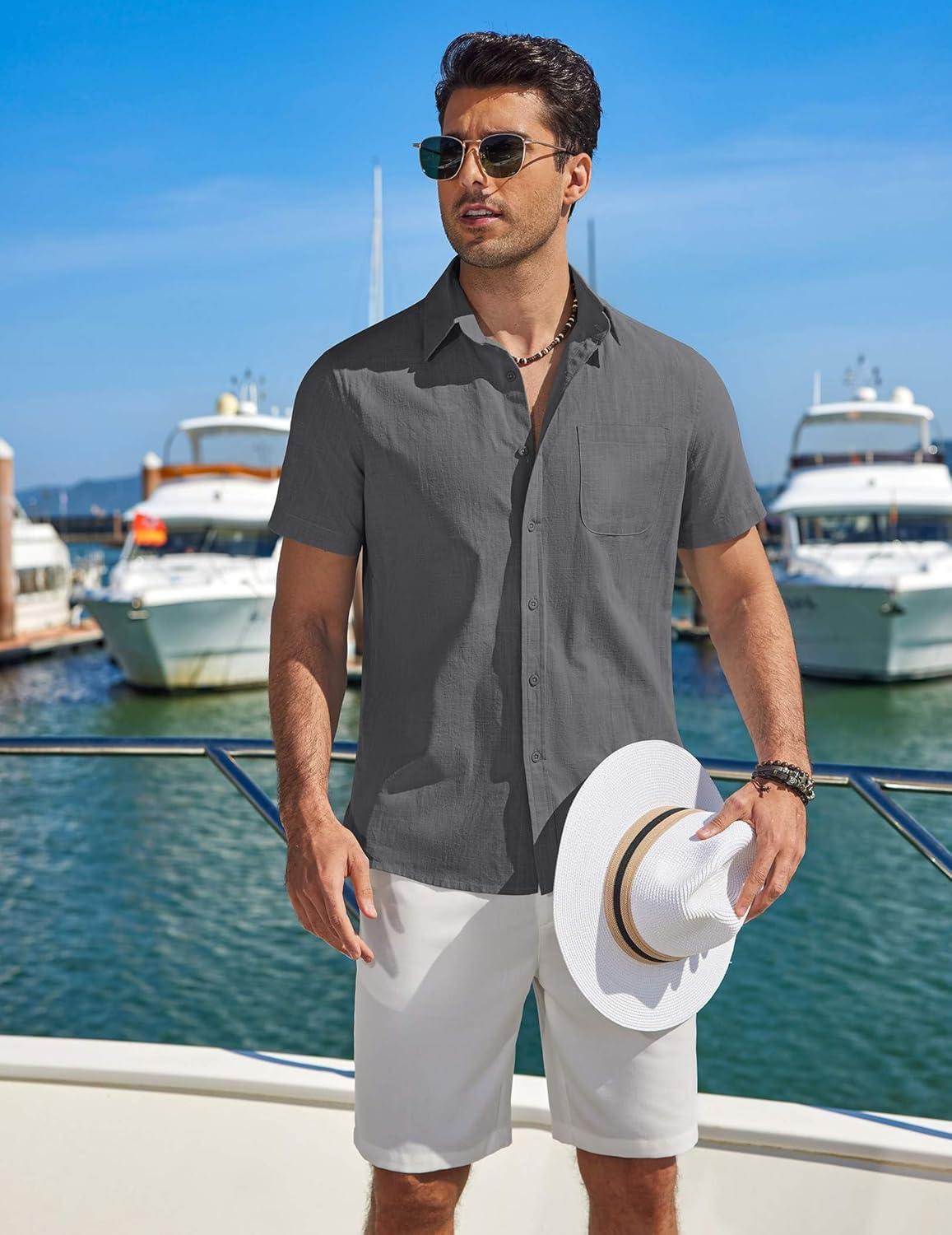 COOFANDY Mens Button Down Shirt Short Sleeve Casual Stylish Cotton Shirts Linen Textured Summer Beach Wedding Shirt(Deep Grey)