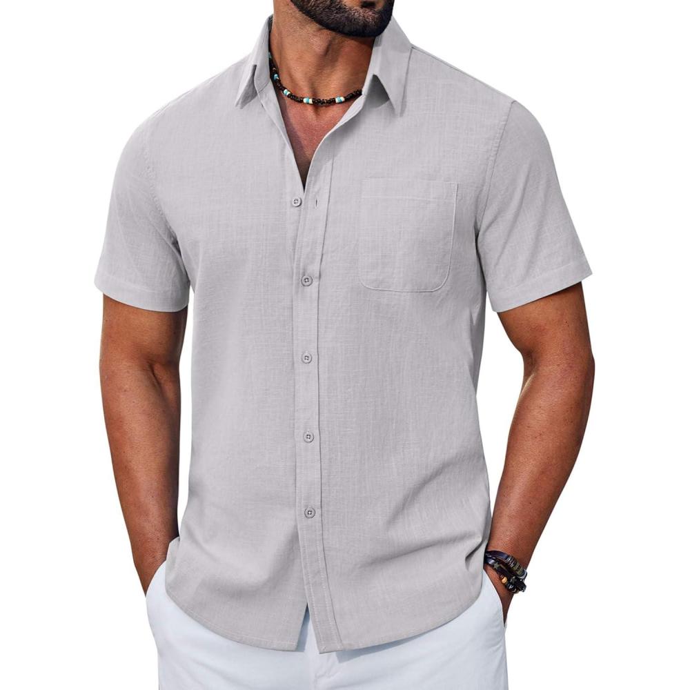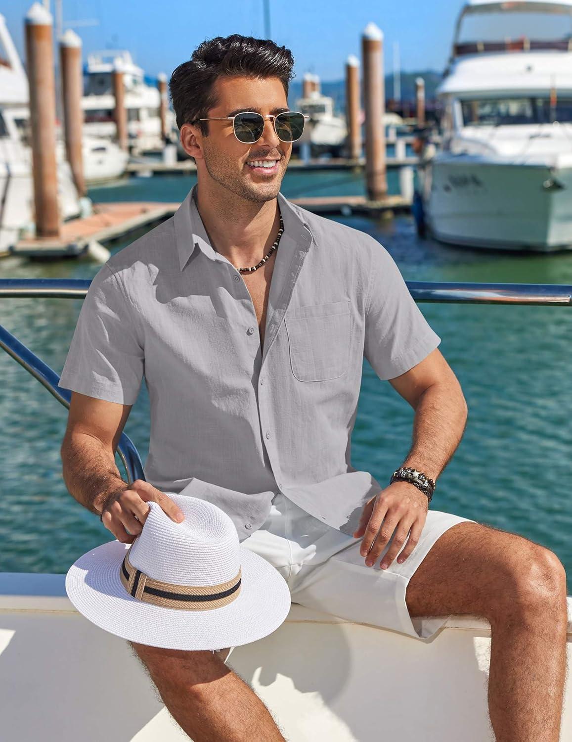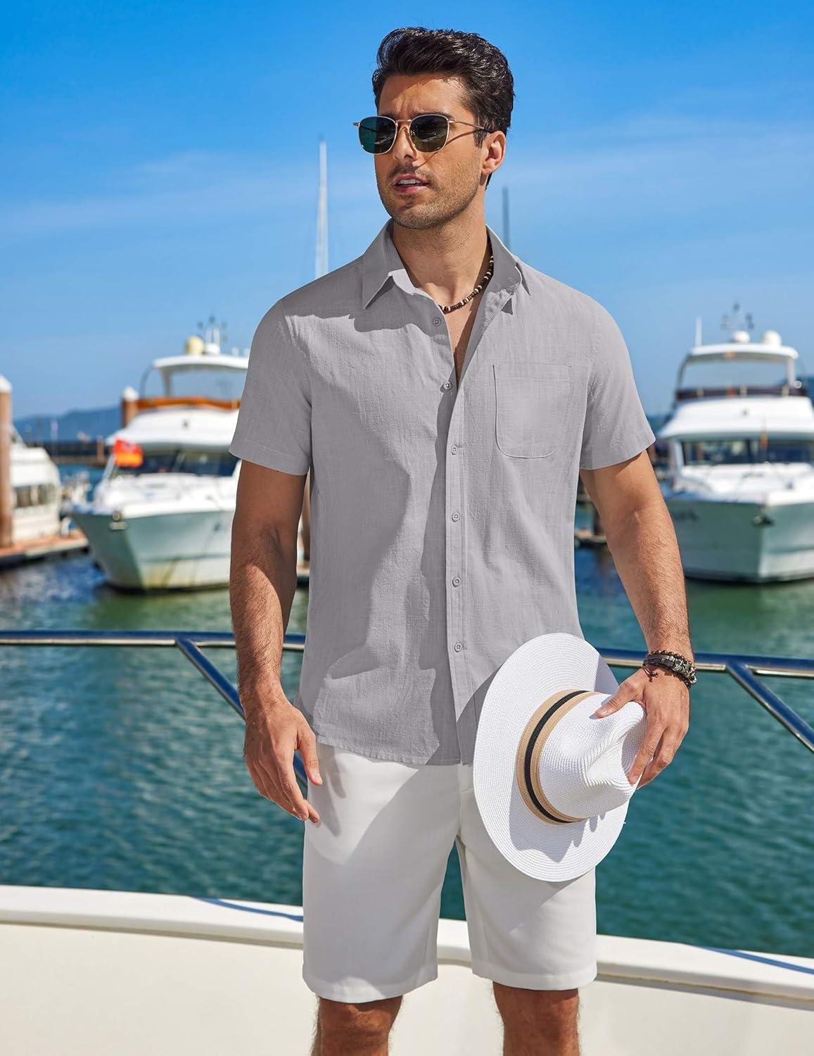 COOFANDY Mens Button Down Shirt Short Sleeve Casual Stylish Cotton Shirts Linen Textured Summer Beach Wedding Shirt(Light Grey)