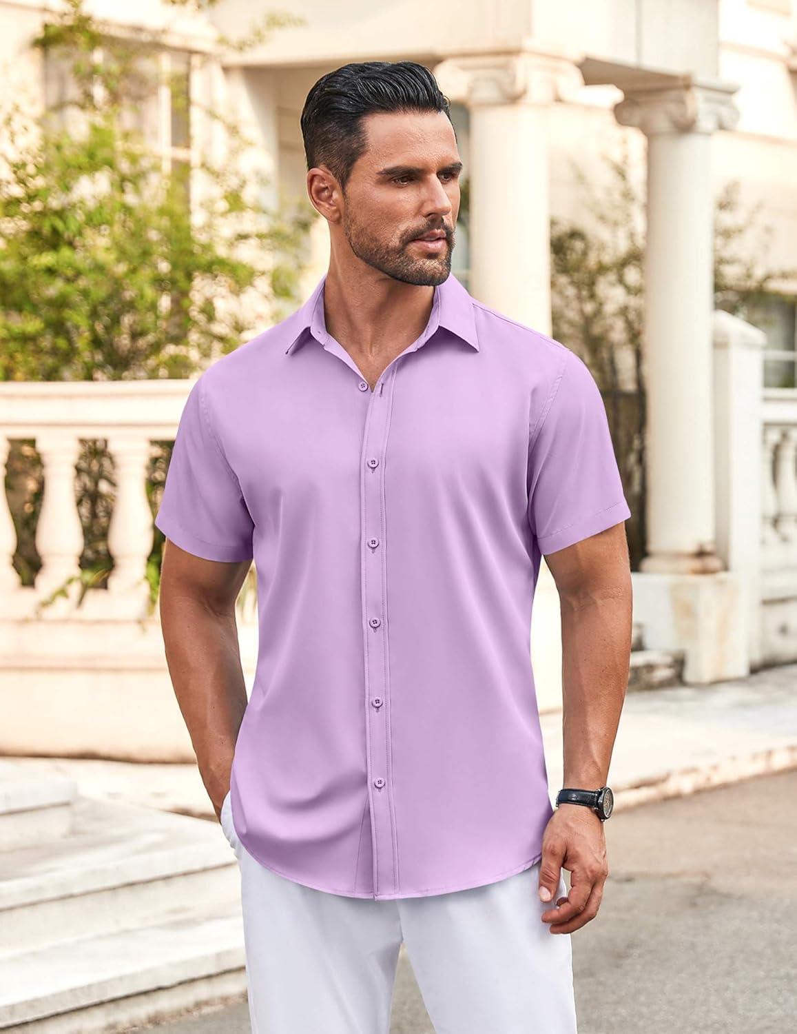 COOFANDY Men’s Button Down Shirt Short Sleeve Dress Shirt Casual Beach Summer Wedding Shirt(Lavender)