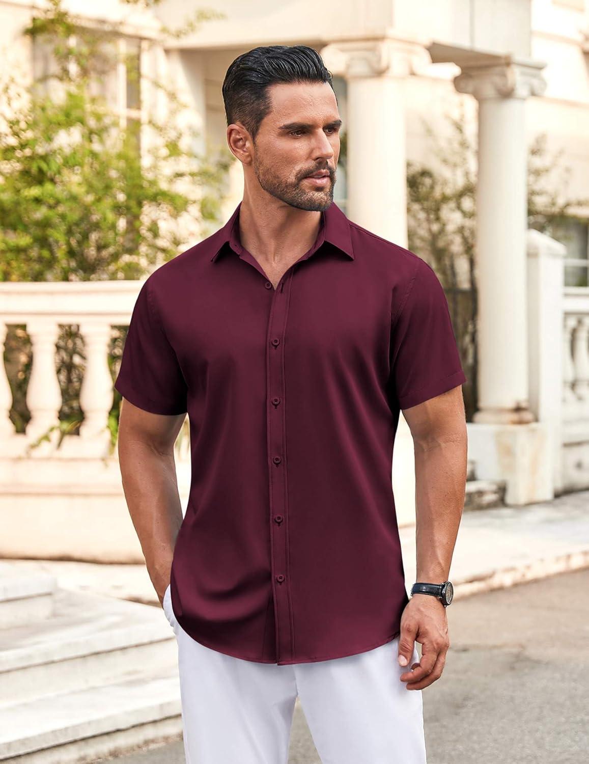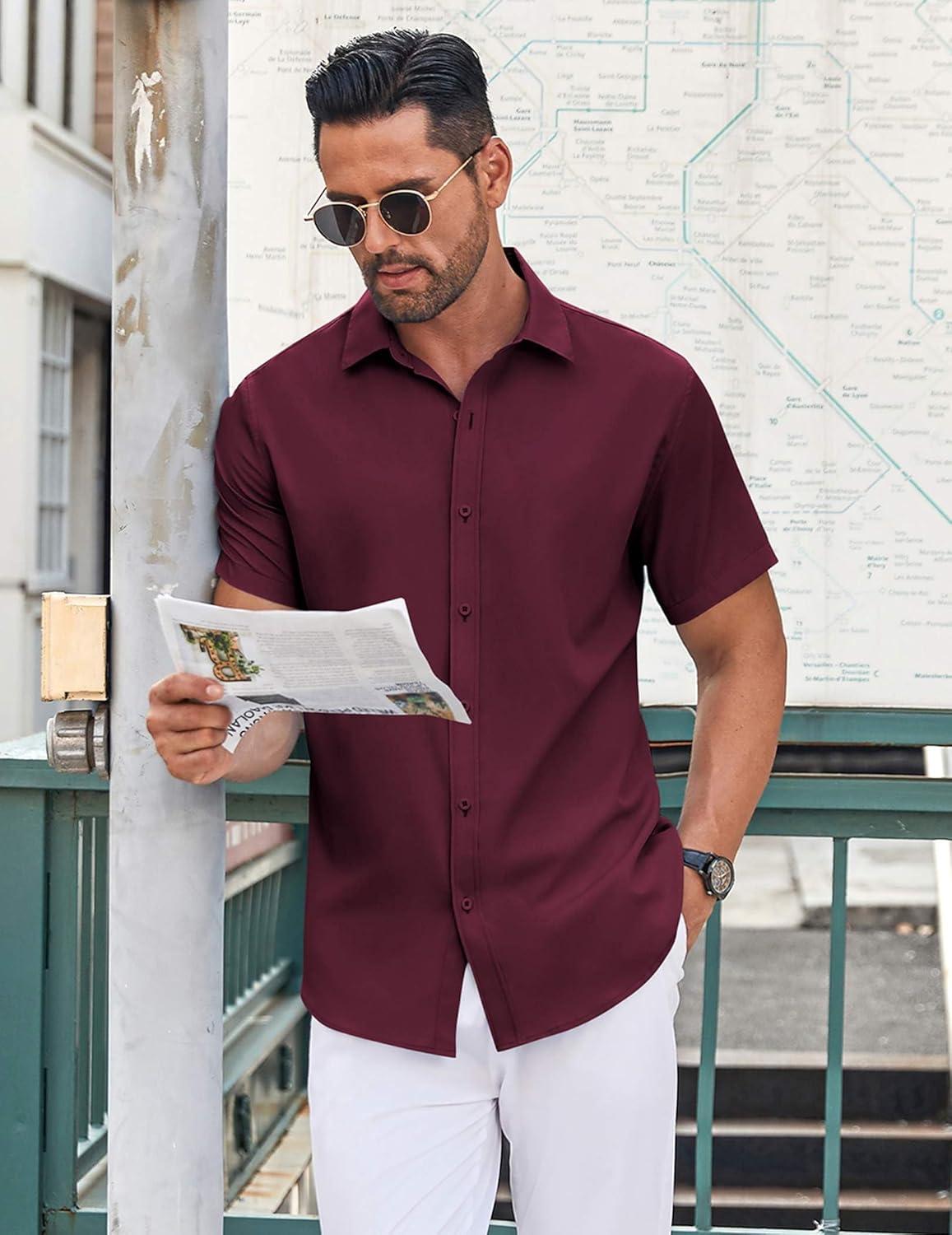 COOFANDY Men’s Button Down Shirt Short Sleeve Dress Shirt Casual Beach Summer Wedding Shirt(Wine Red)