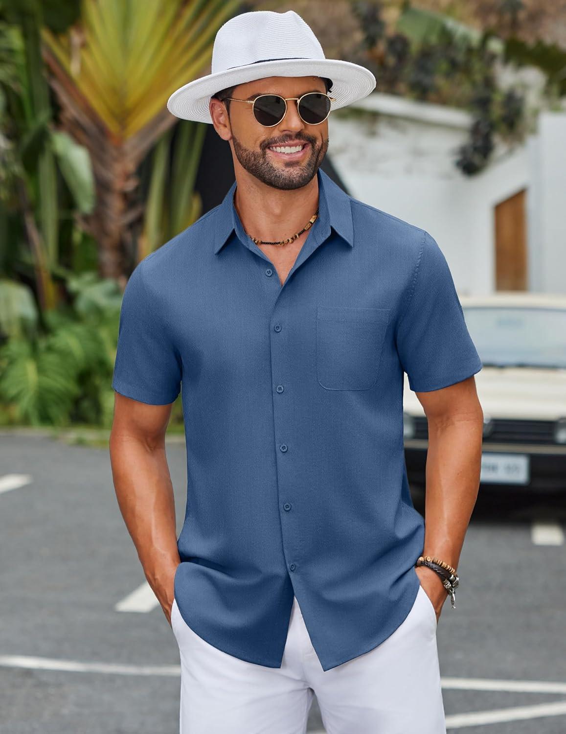 COOFANDY Mens Button Down Shirts Lightweight Breathable Short Sleeve Shirt Summer Beach Top(Denim Blue)