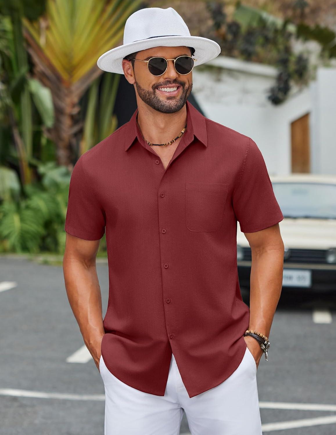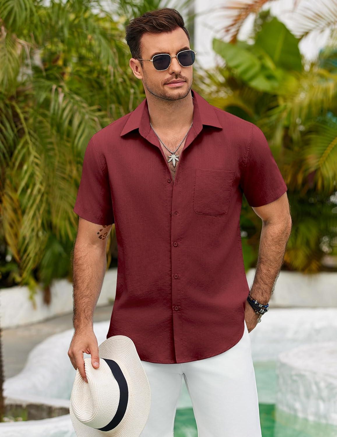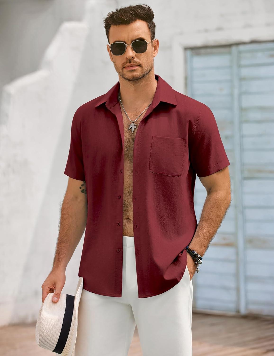 COOFANDY Mens Button Down Shirts Lightweight Breathable Short Sleeve Shirt Summer Beach Top(Wine Red)