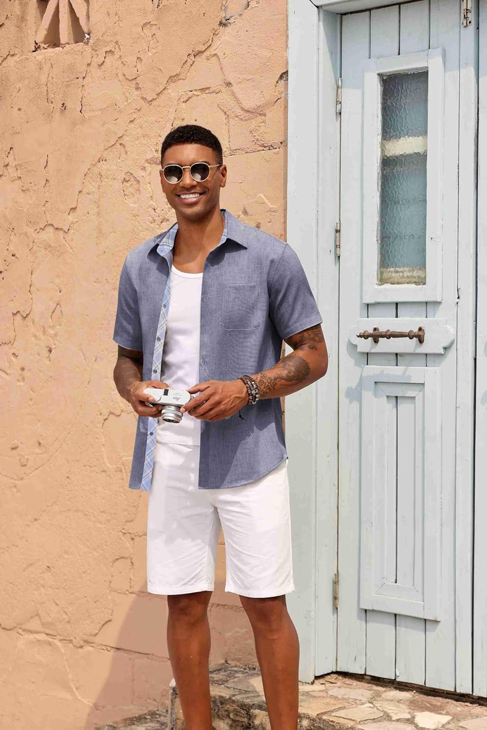 COOFANDY Mens Button Down Shirts Short Sleeve Casual Linen Shirts for Men Summer Beach Wedding Shirt(Dark Blue)