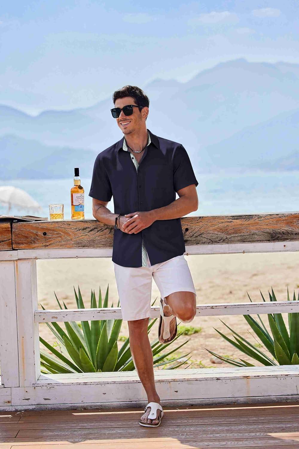 COOFANDY Mens Button Down Shirts Short Sleeve Casual Linen Shirts for Men Summer Beach Wedding Shirt(Navy Blue)