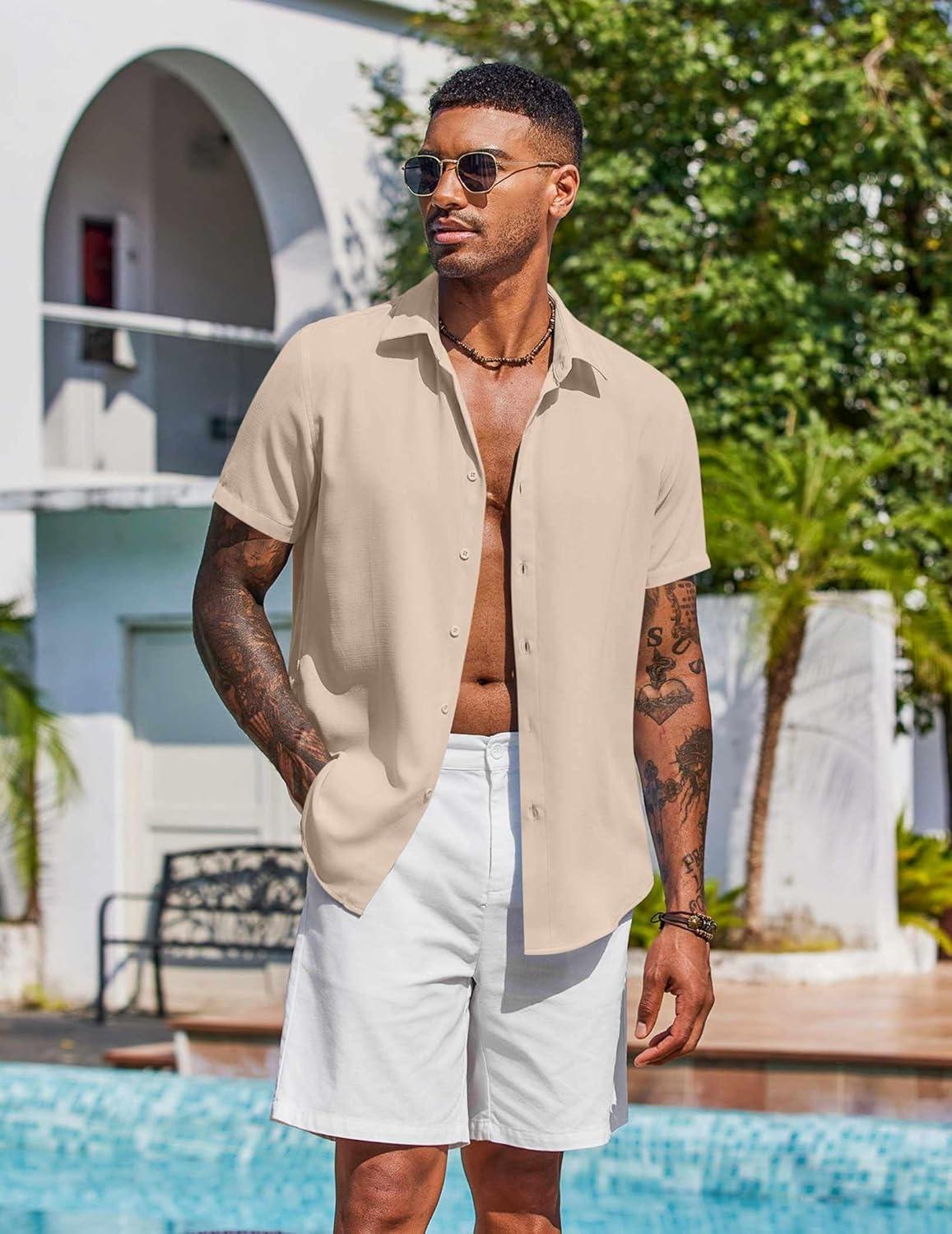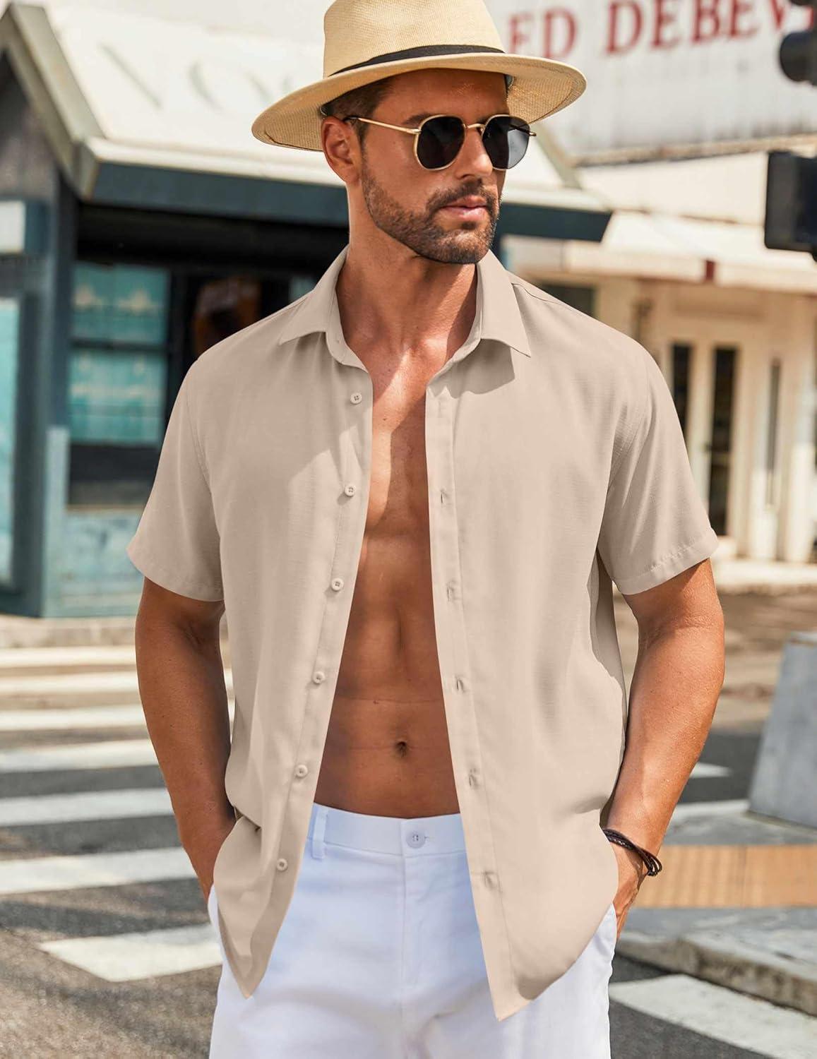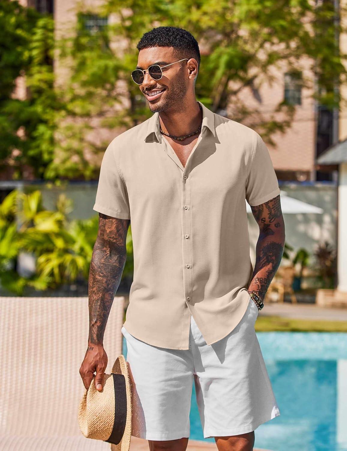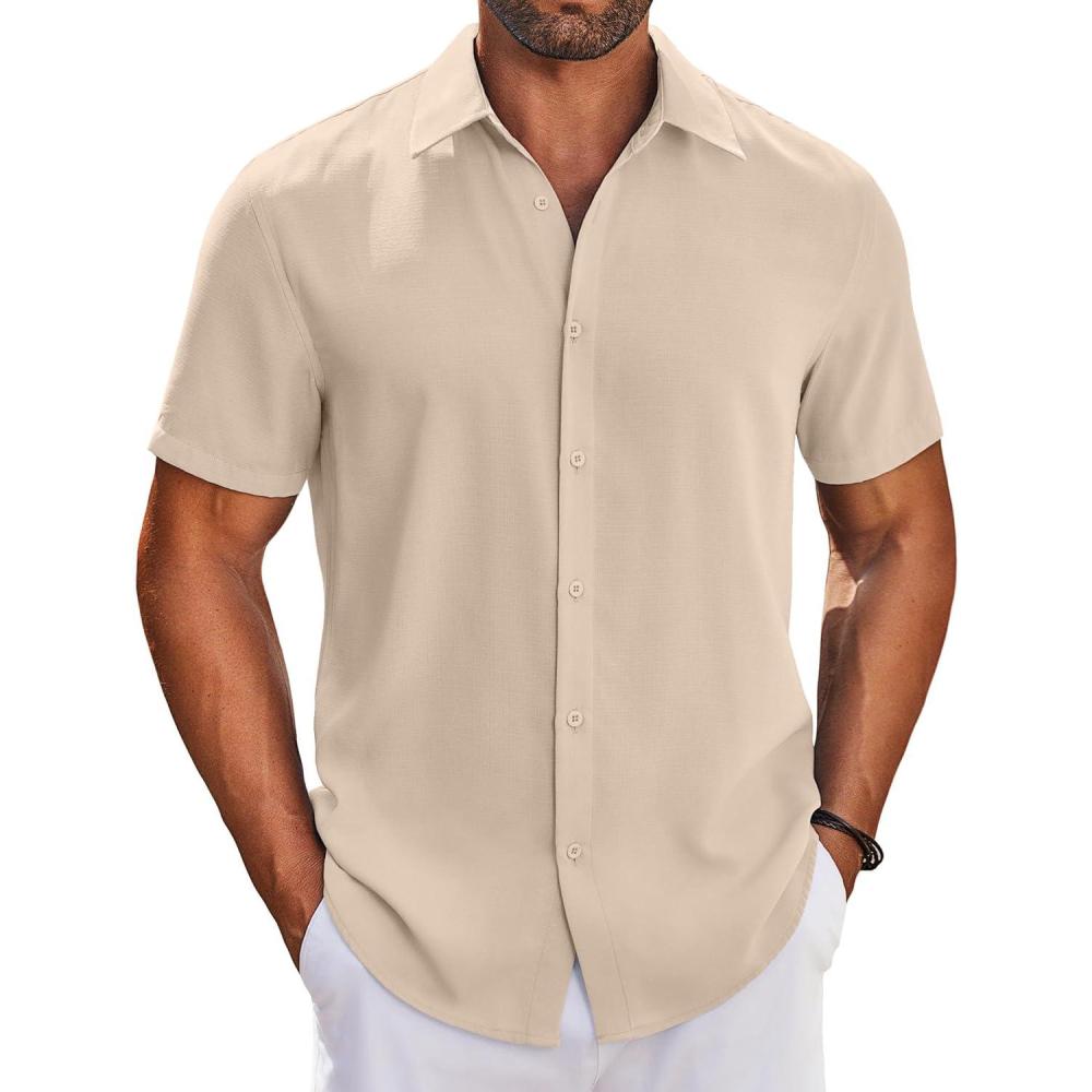 COOFANDY Mens Button Down Shirts Short Sleeve Casual Shirt Summer Beach Wedding Shirts(Khaki)