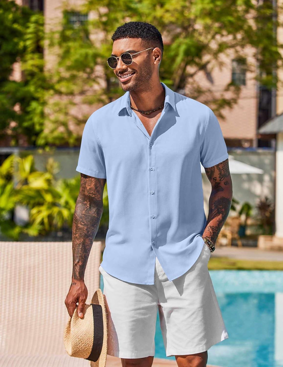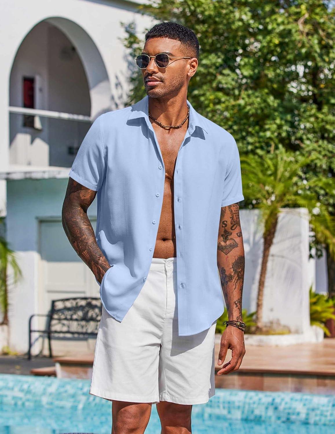 COOFANDY Mens Button Down Shirts Short Sleeve Casual Shirt Summer Beach Wedding Shirts(Light Blue)