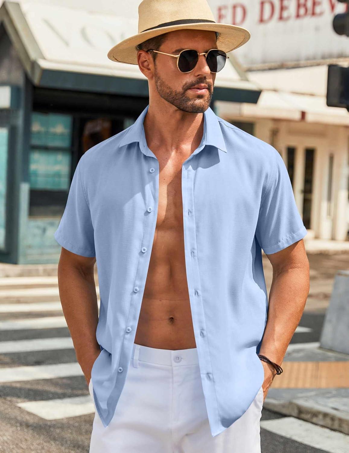 Get up to 60% off on COOFANDY Mens Button Down Shirts Short Sleeve Casual Shirt Summer Beach Wedding Shirts(Light Blue) styles during our winter sale event.