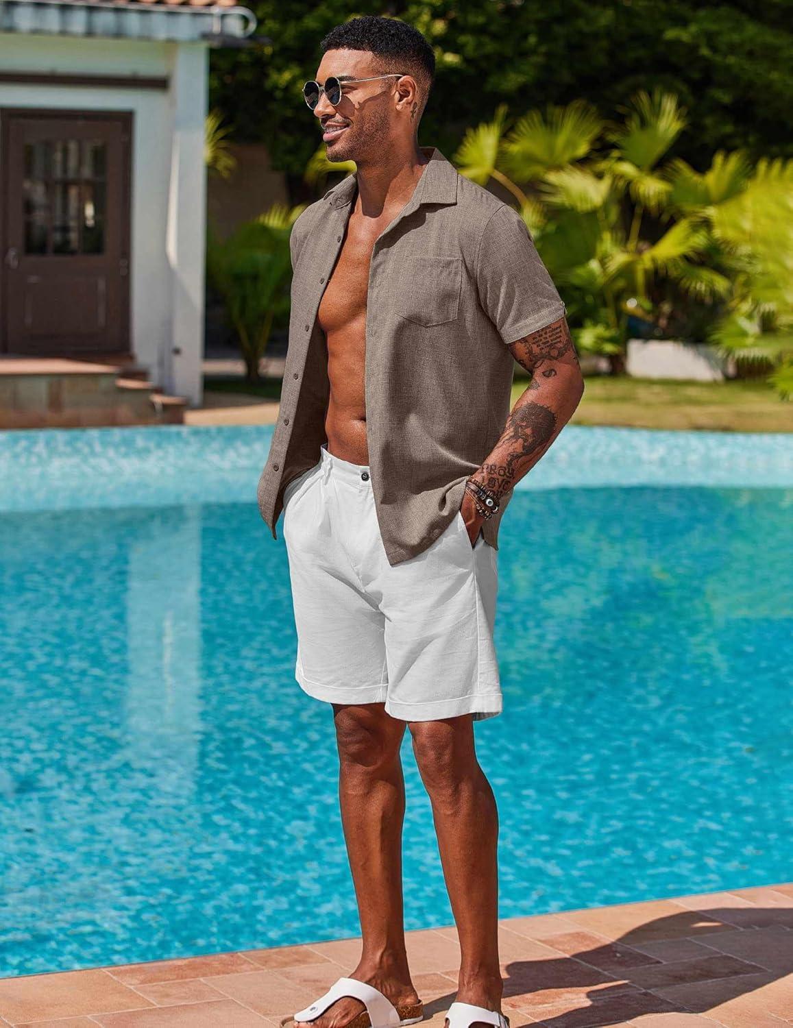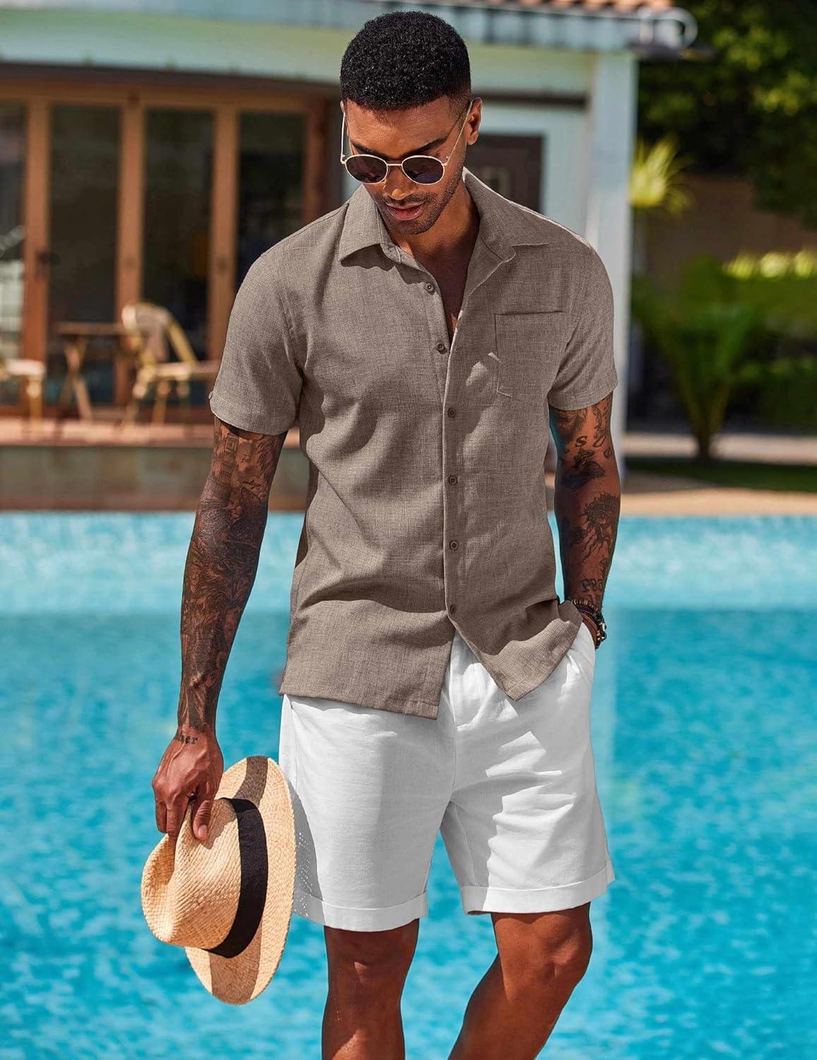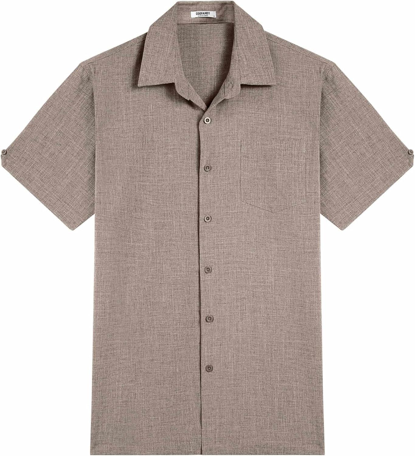 COOFANDY Men’s Button Down Shirts Short Sleeve Casual Shirts Summer Beach Linen Shirts with Pocket(Brown)