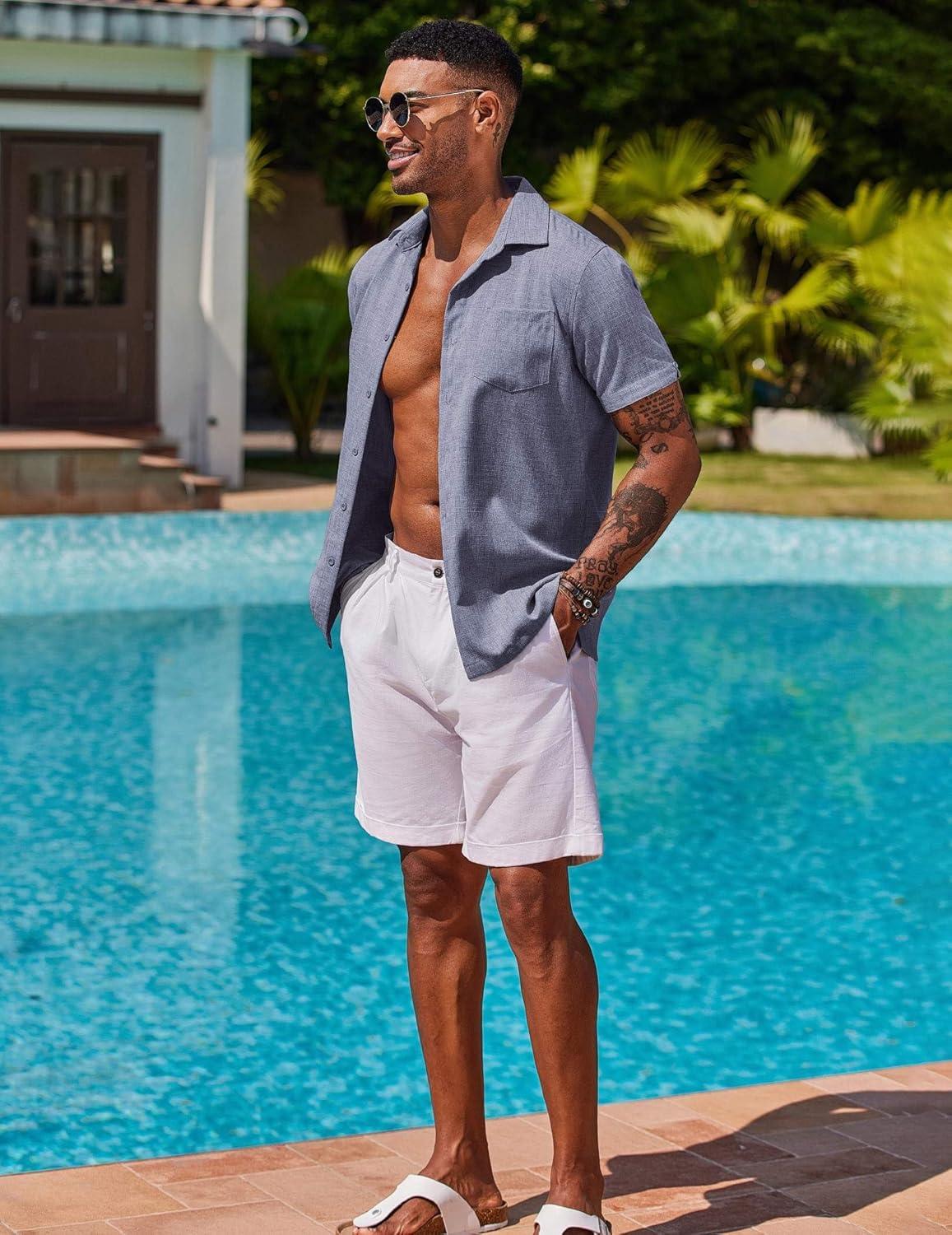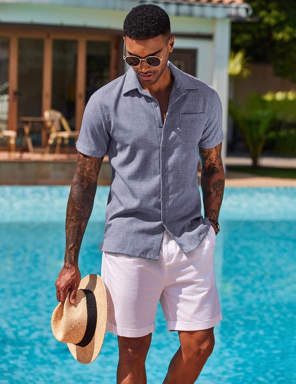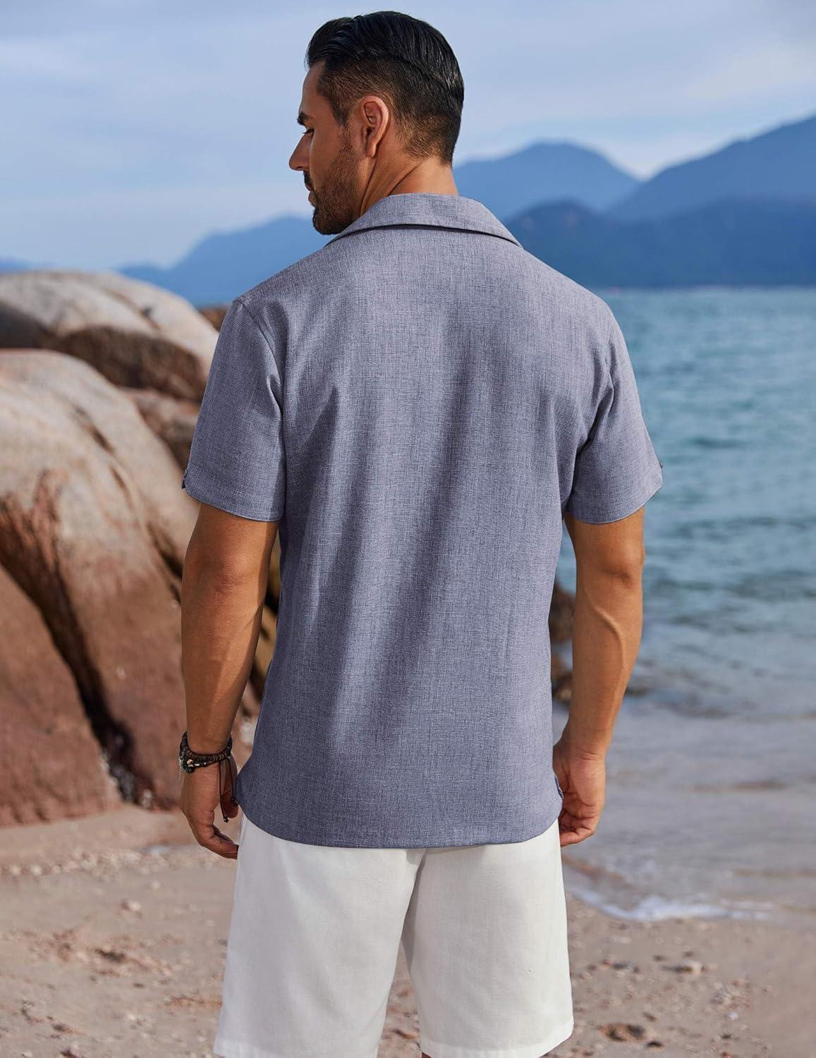 COOFANDY Men’s Button Down Shirts Short Sleeve Casual Shirts Summer Beach Linen Shirts with Pocket(Dark Blue)