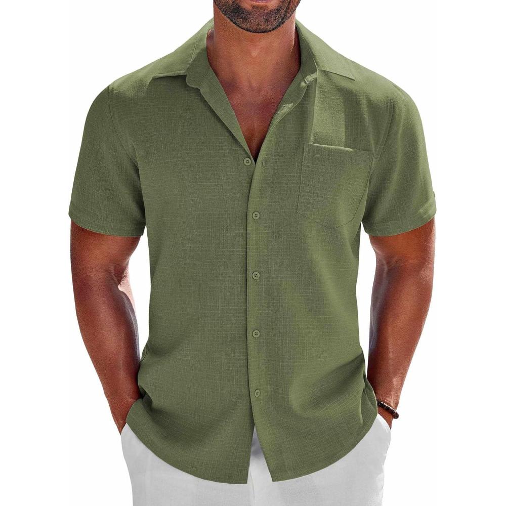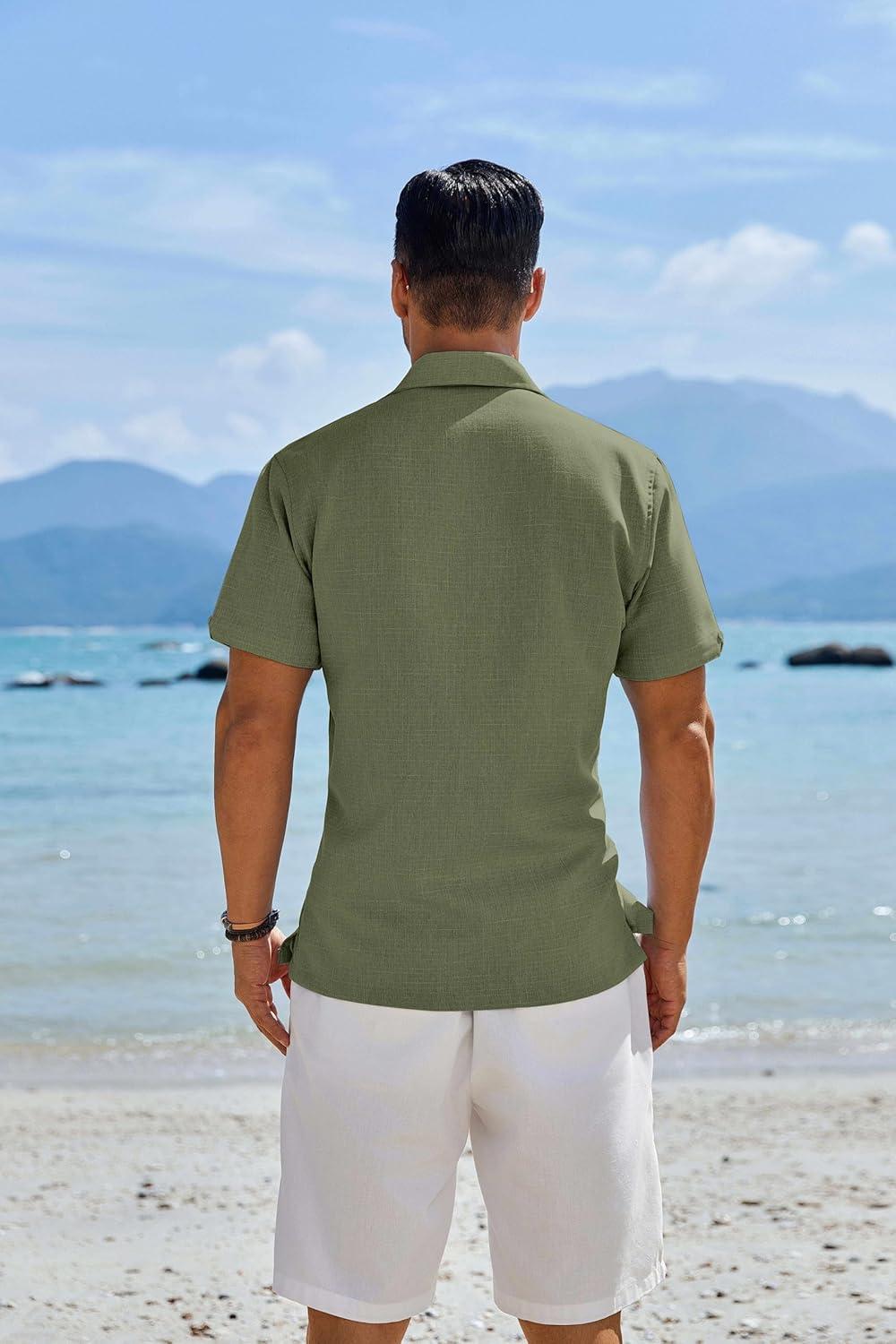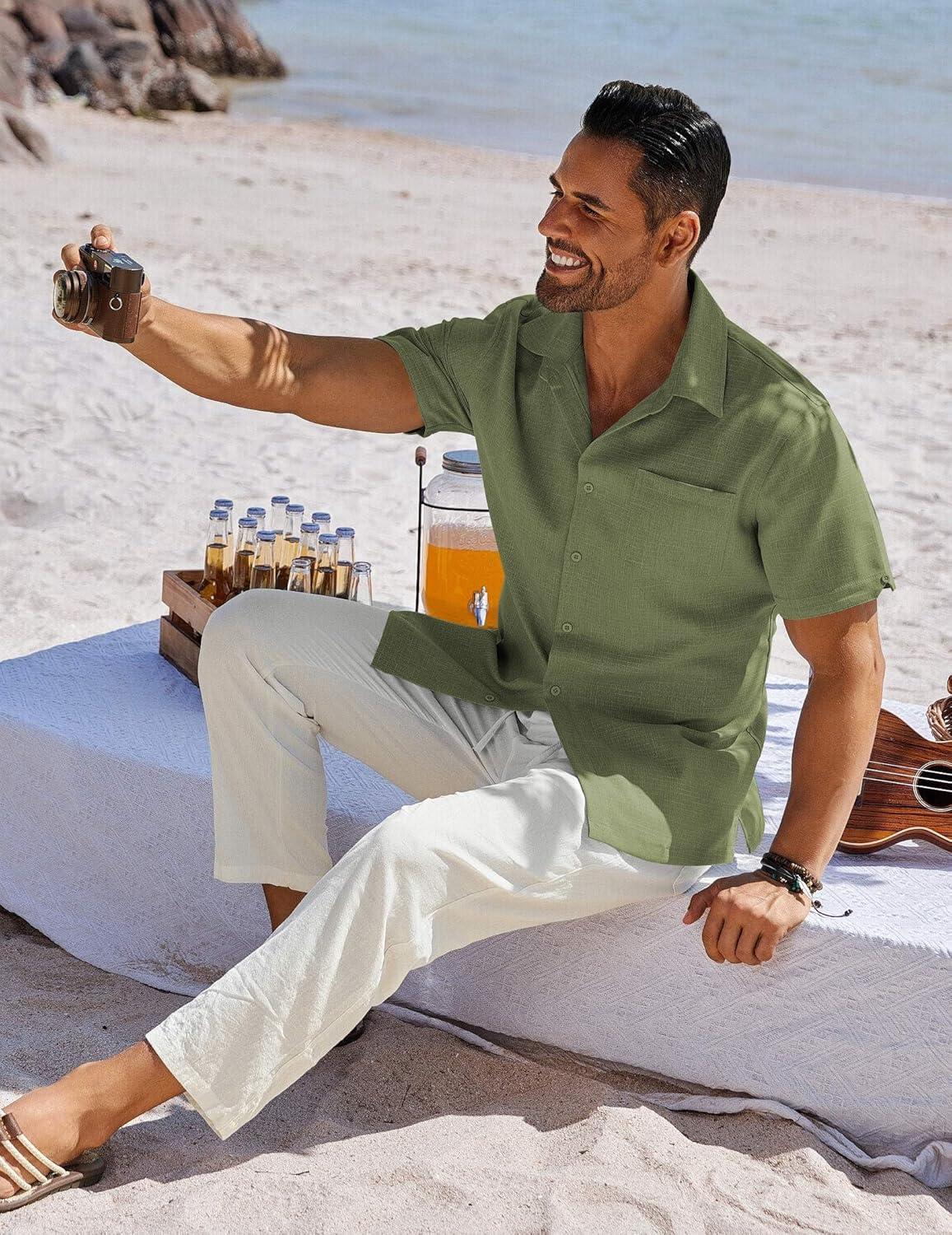 COOFANDY Men's Button Down Shirts Short Sleeve Casual Shirts Summer Beach Linen Shirts with Pocket(Olive Green)