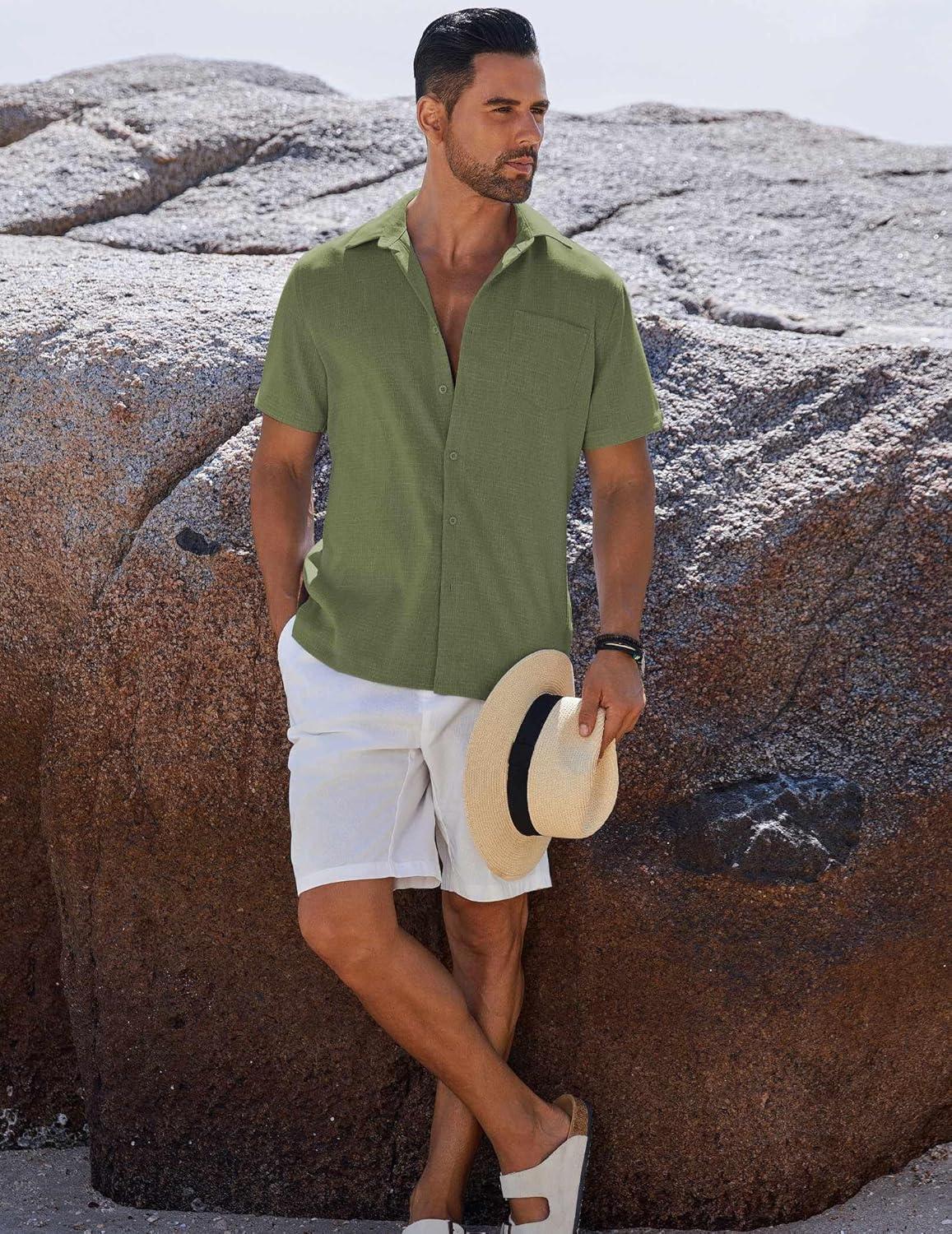 COOFANDY Men’s Button Down Shirts Short Sleeve Casual Shirts Summer Beach Linen Shirts with Pocket(Olive Green)