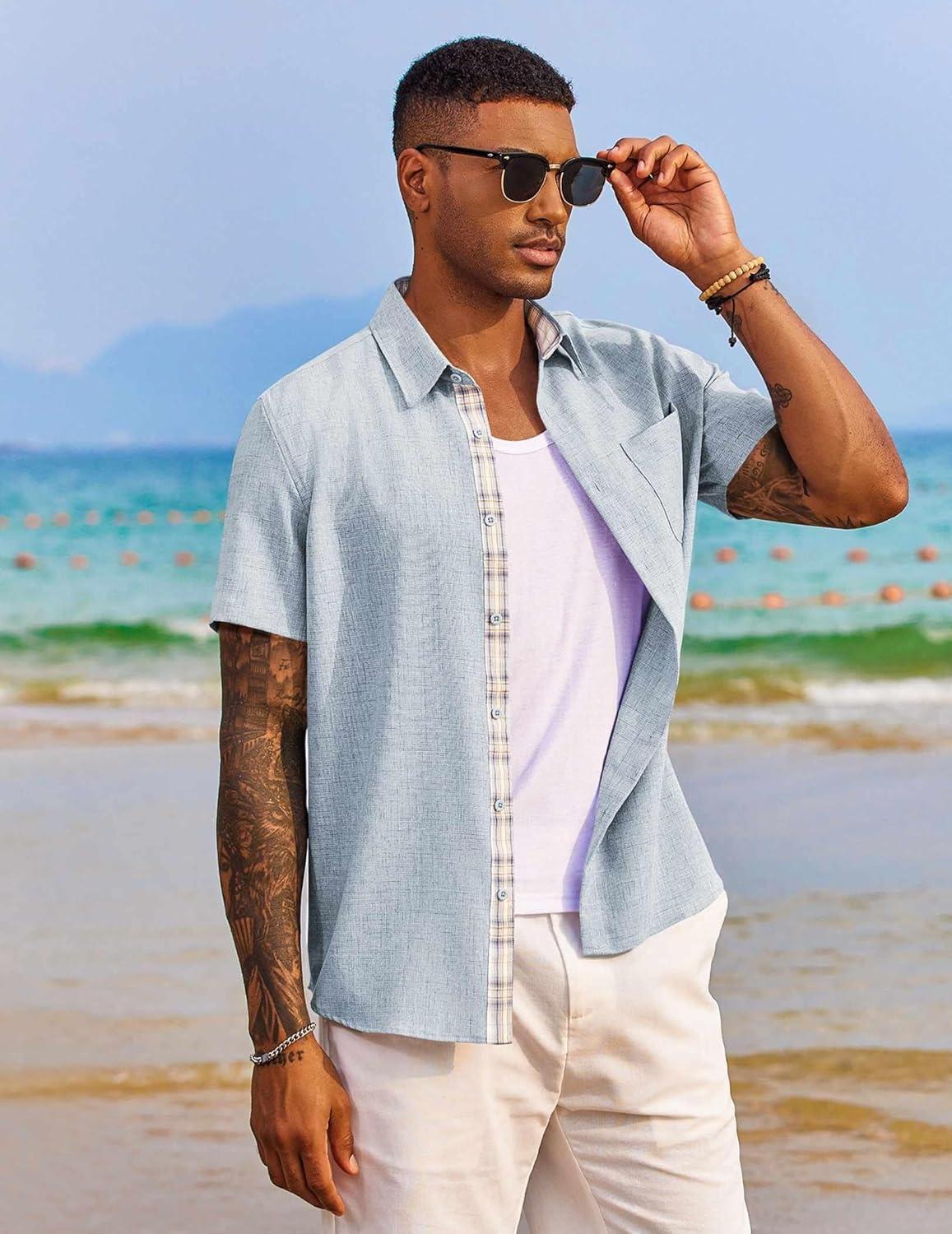 COOFANDY Men’s Button Down Shirts Short Sleeve Casual Shirts Summer Beach Shirts Vacation Wedding Shirts with Pocket(Blue)