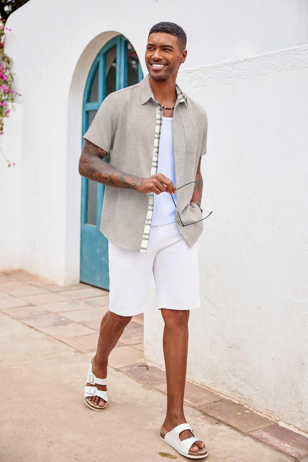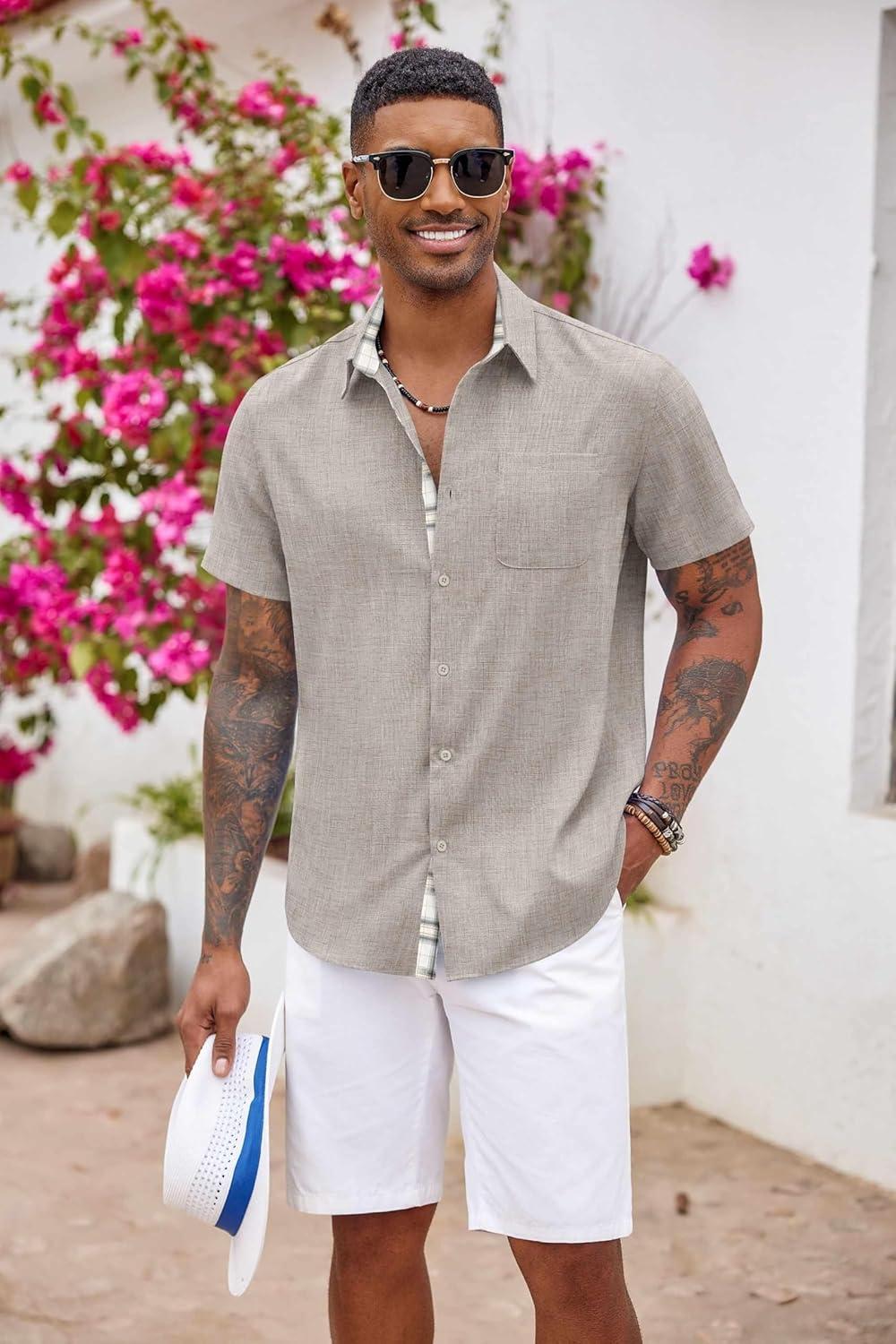 COOFANDY Men’s Button Down Shirts Short Sleeve Casual Shirts Summer Beach Shirts Vacation Wedding Shirts with Pocket(Stone)