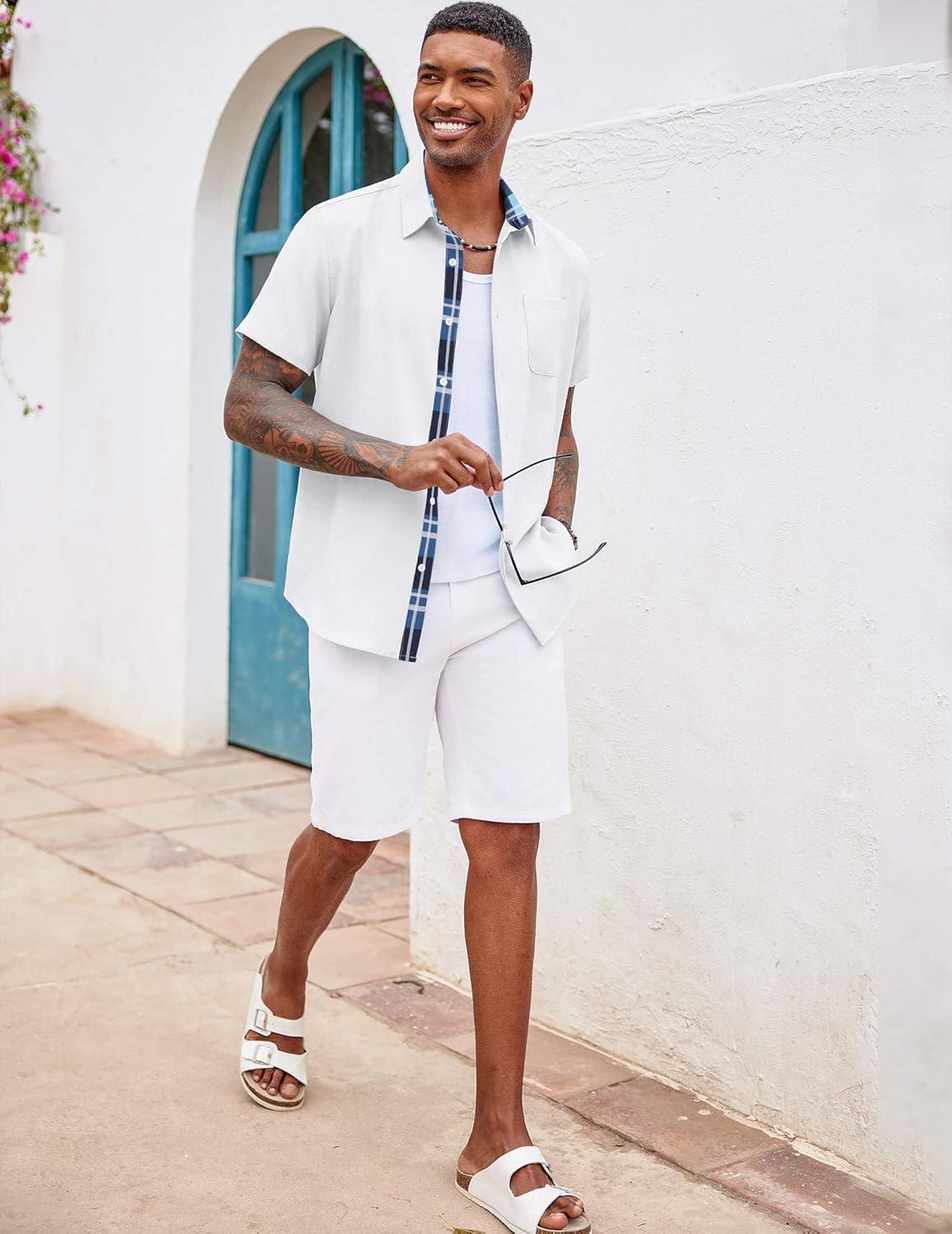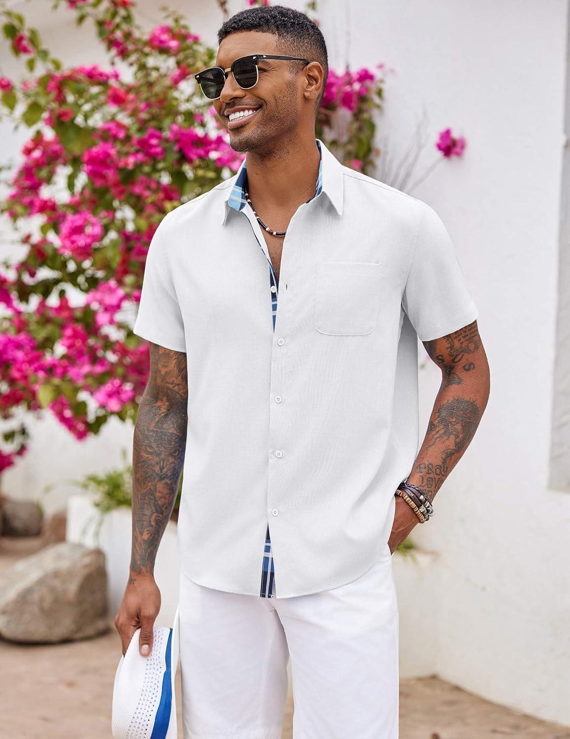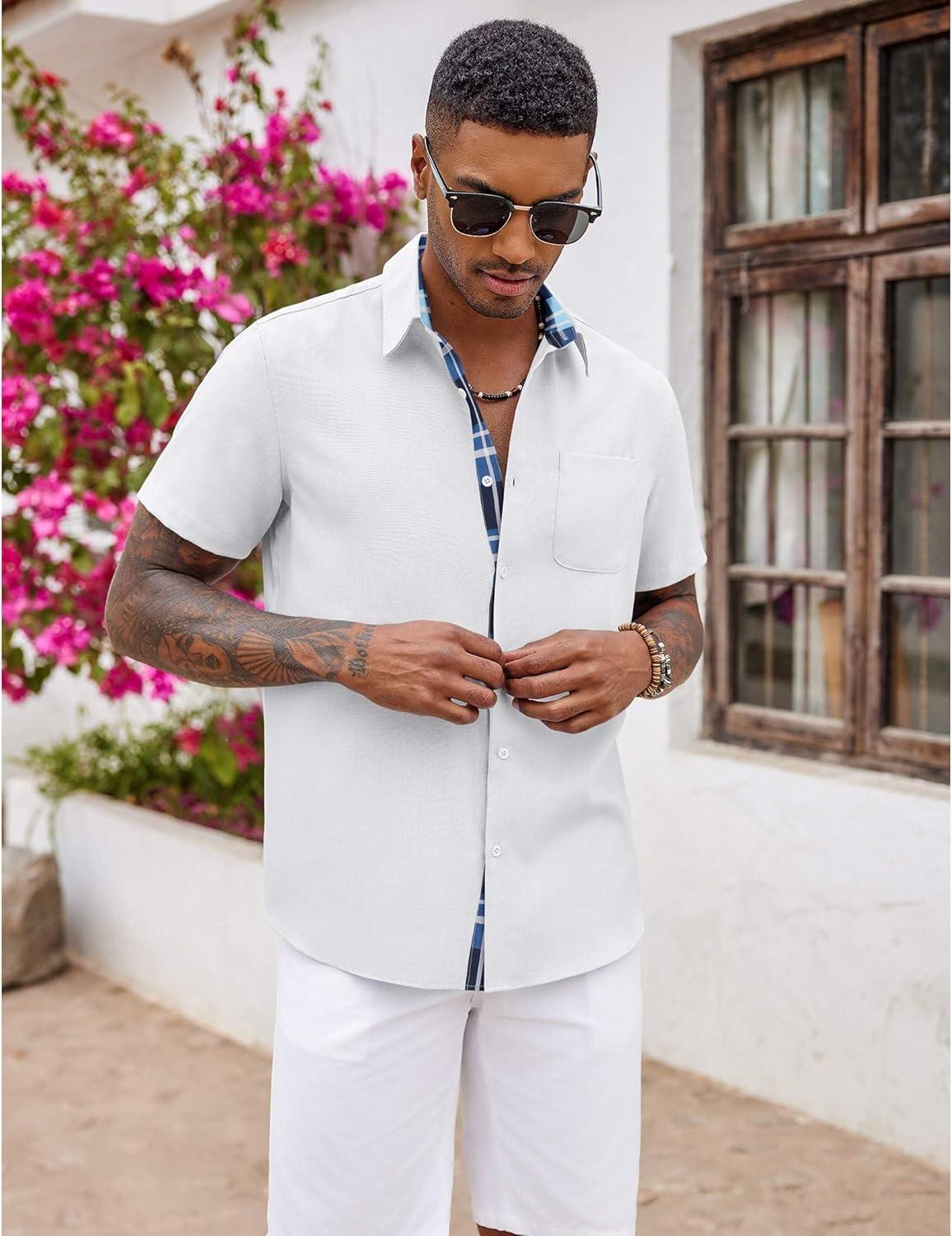 COOFANDY Men's Button Down Shirts Short Sleeve Casual Shirts Summer Beach Shirts Vacation Wedding Shirts with Pocket(White - Blue Plaid)