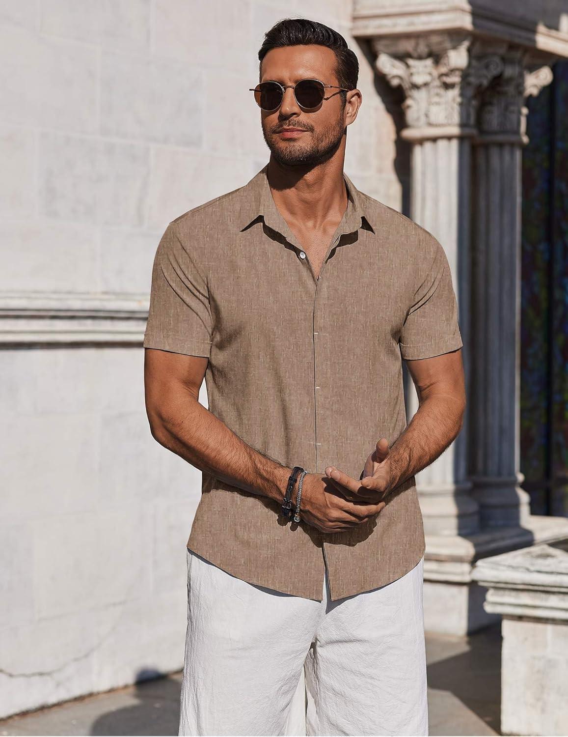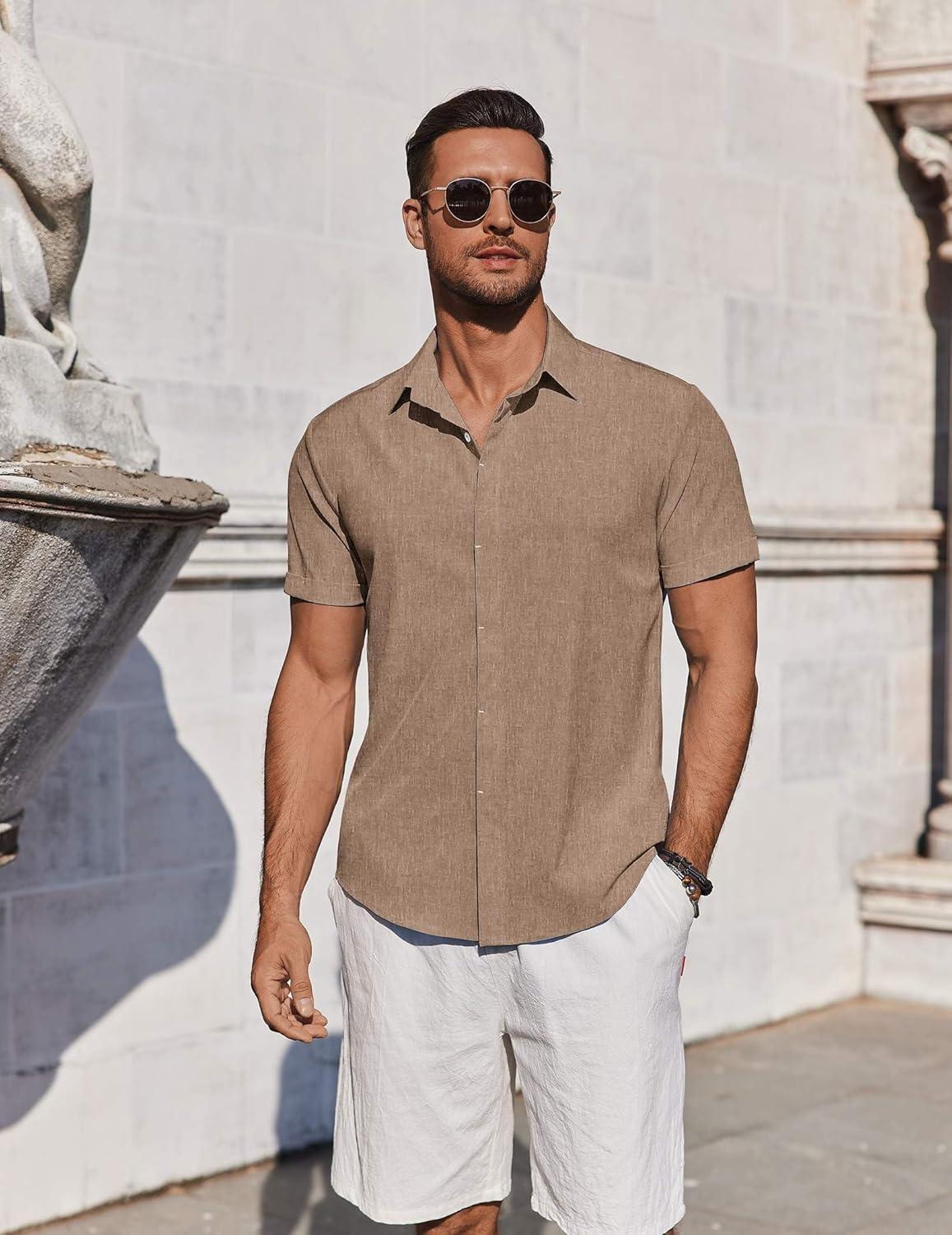 COOFANDY Mens Button Down Shirts Short Sleeve Casual Summer Beach Shirts for Men Vacation Wedding Linen Shirt(Camel)