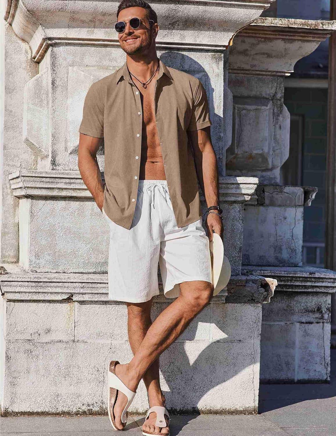 imageCOOFANDY Mens Button Down Shirts Short Sleeve Casual Summer Beach Shirts for Men Vacation Wedding Linen ShirtCamel