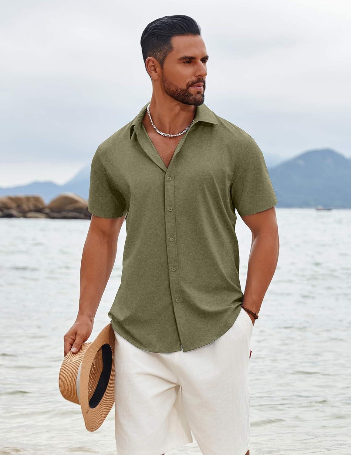 COOFANDY Men’s Button Down Shirts Short Sleeve Casual Summer Beach Shirts Vacation Wedding Shirts(Army Green)
