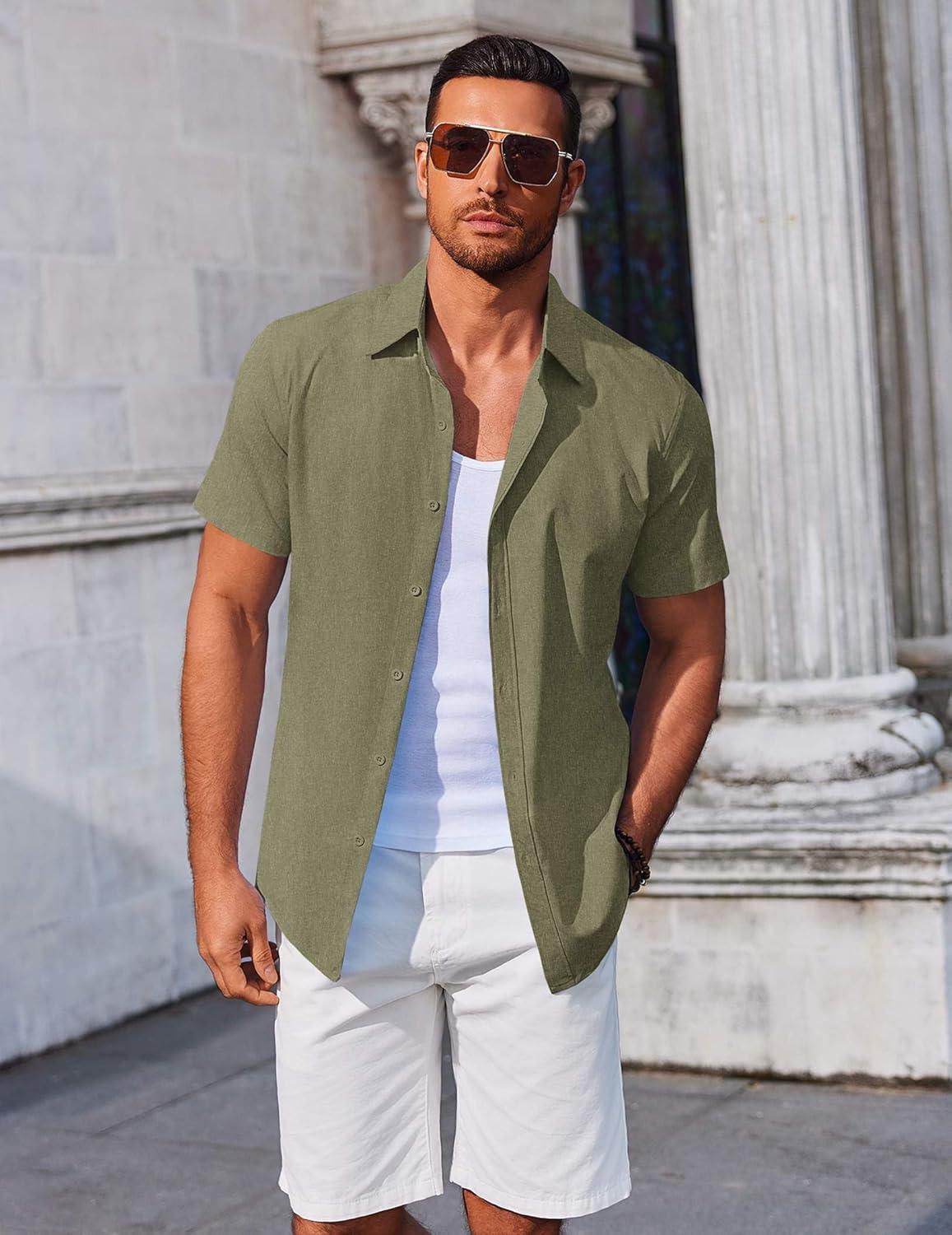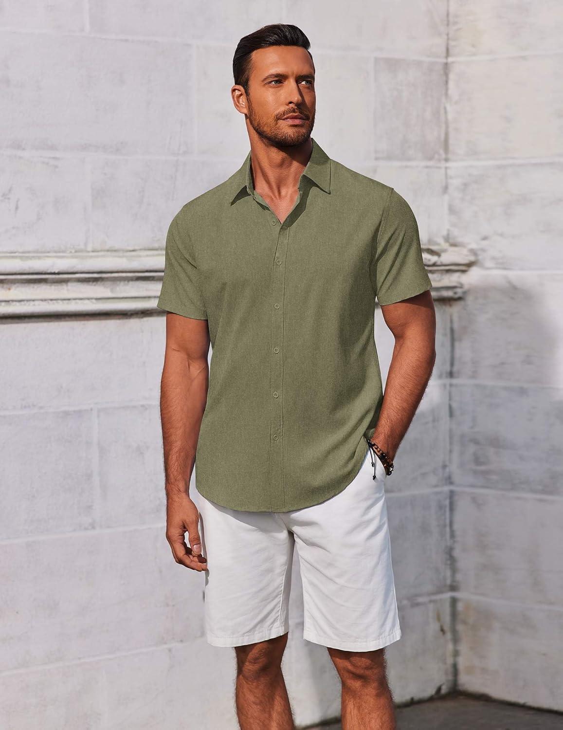 COOFANDY Men's Button Down Shirts Short Sleeve Casual Summer Beach Shirts Vacation Wedding Shirts(Army Green)