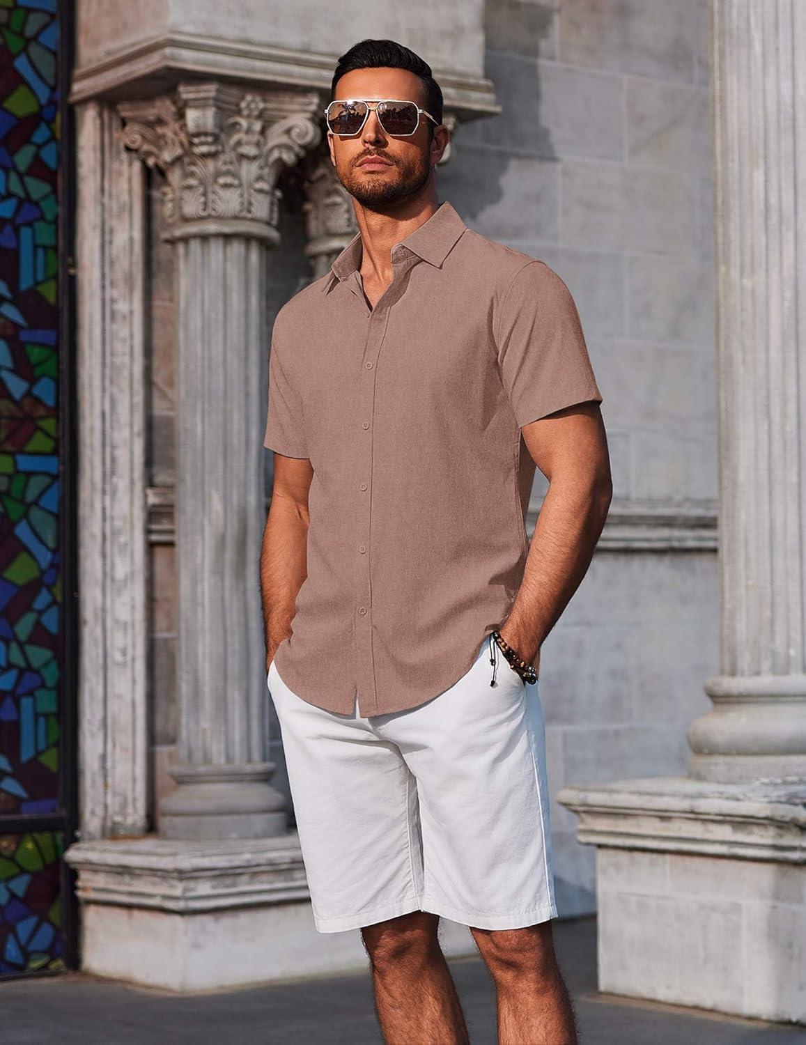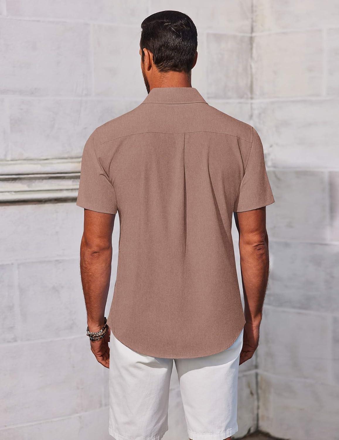 COOFANDY Men’s Button Down Shirts Short Sleeve Casual Summer Beach Shirts Vacation Wedding Shirts(Light Brown)
