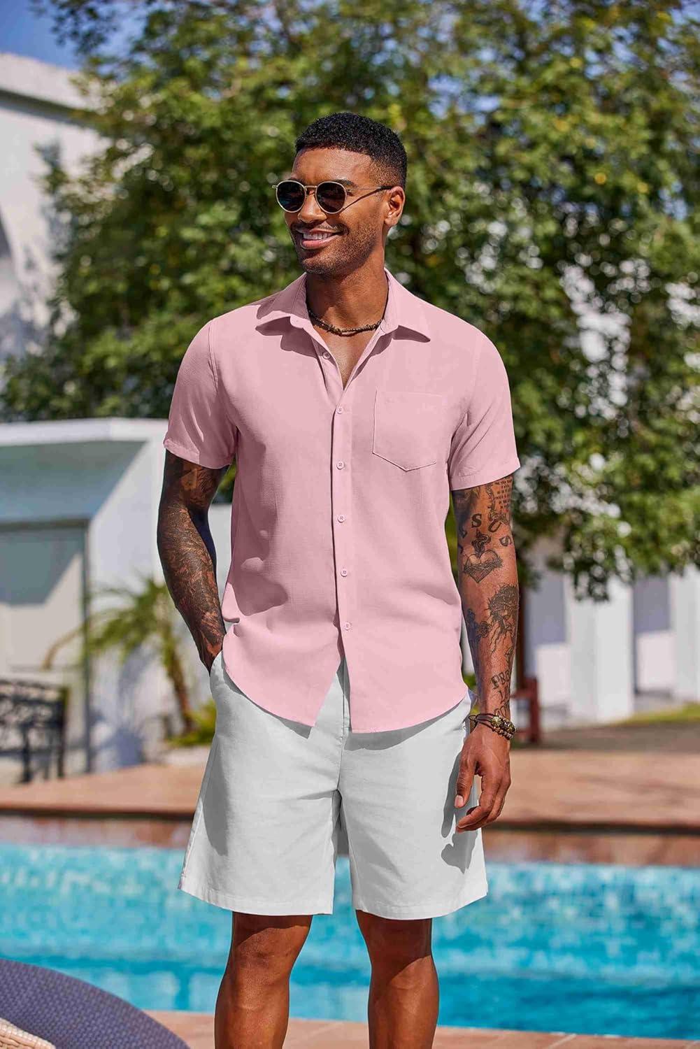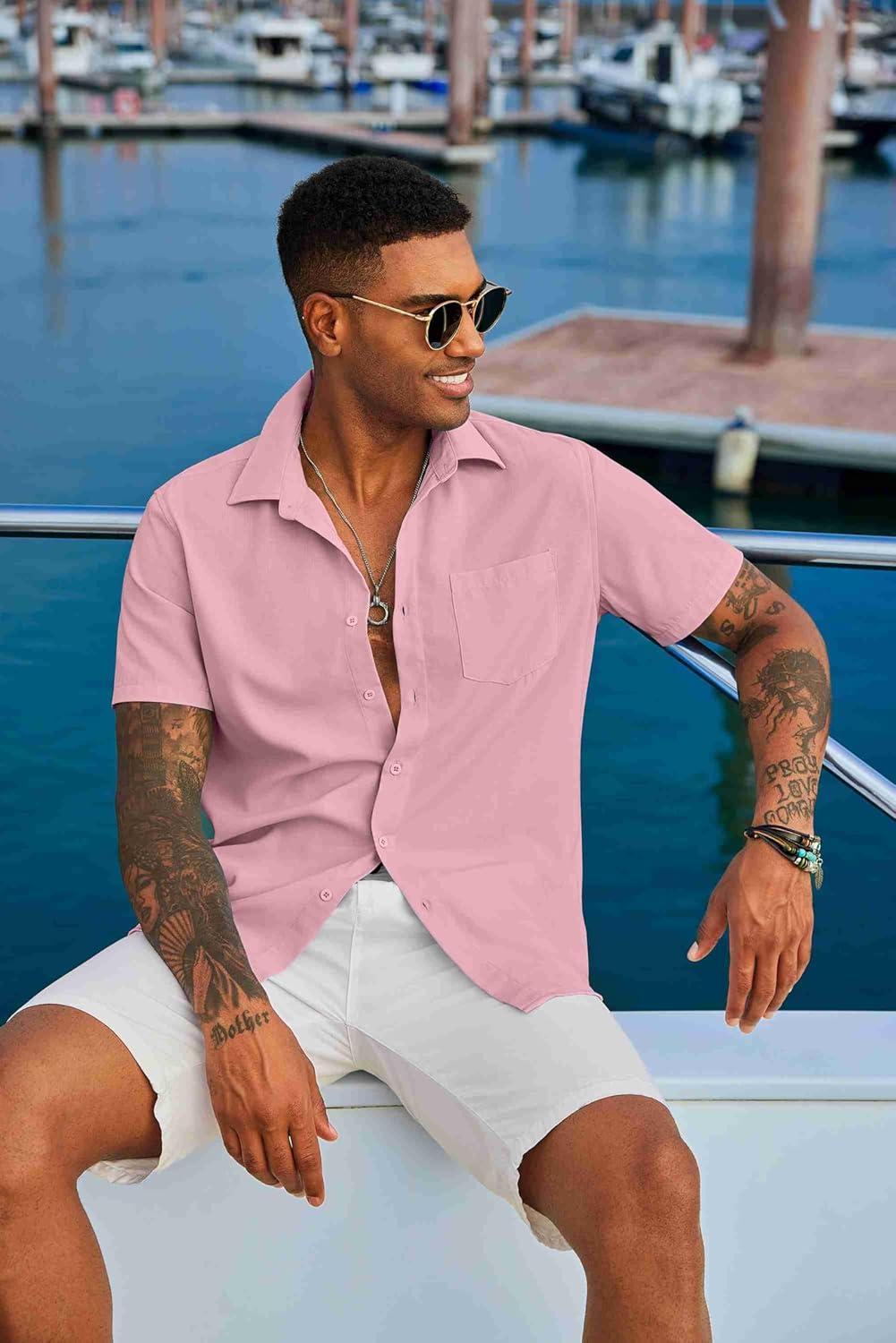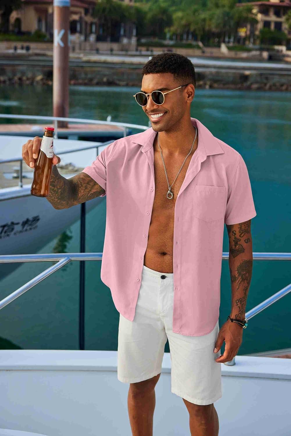 COOFANDY Men’s Button Down Shirts Short Sleeve Casual Summer Shirts Beach Wedding Shirt with Pocket(Light Pink)