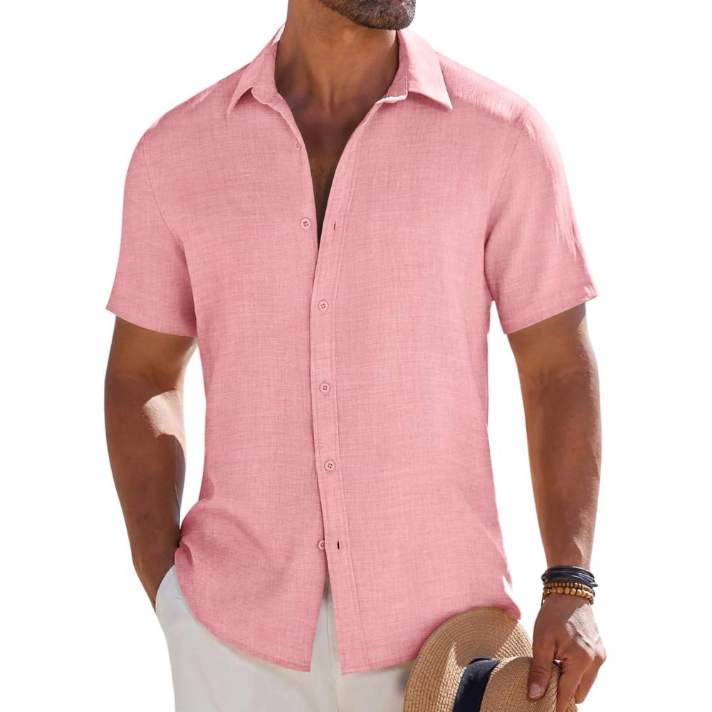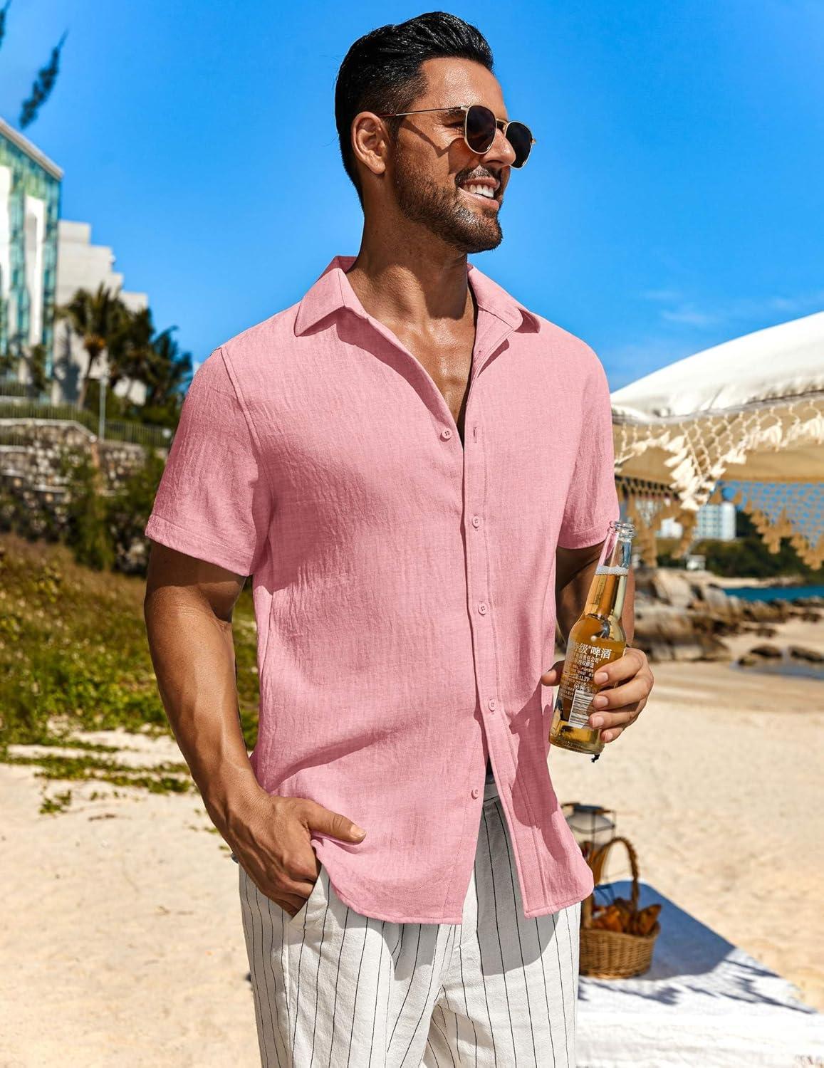 COOFANDY Mens Button Down Short Sleeve Shirt Casual Beach Shirt Summer Vacation Textured Shirts(Pink)