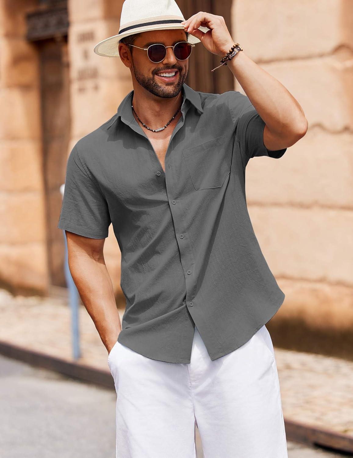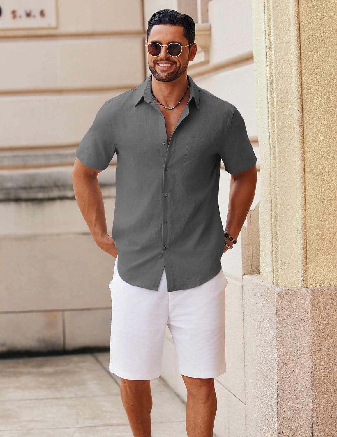 COOFANDY Men’s Button Down Short Sleeve Shirt Casual Cotton Summer Beach Linen Wedding Shirts with Pocket(Dark Grey)