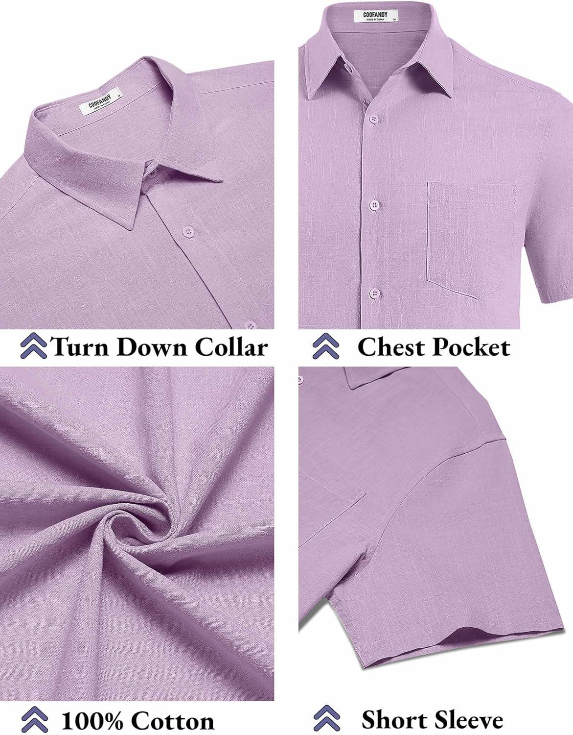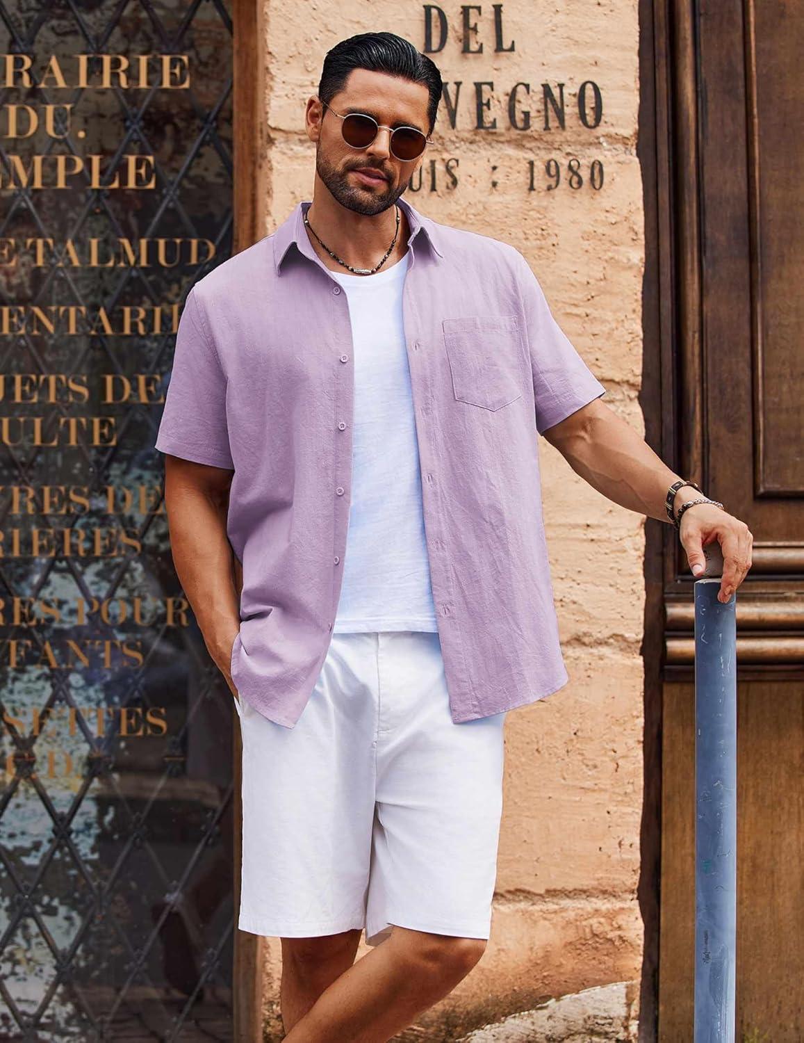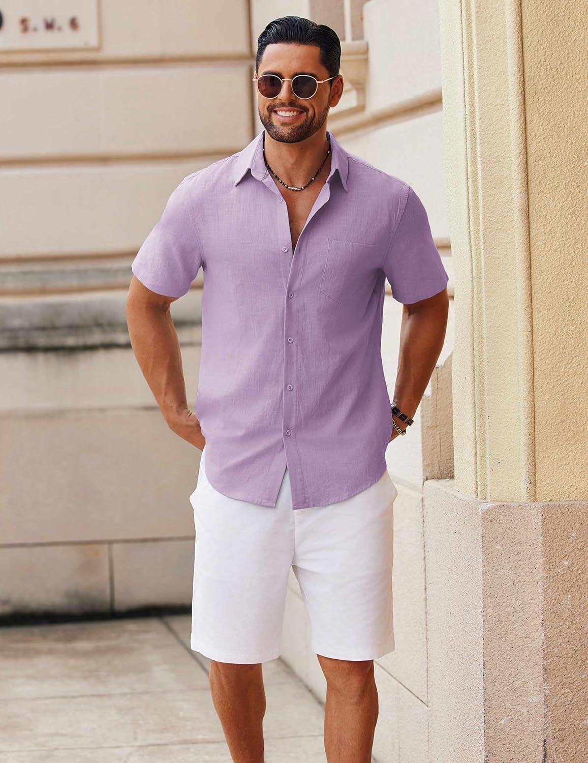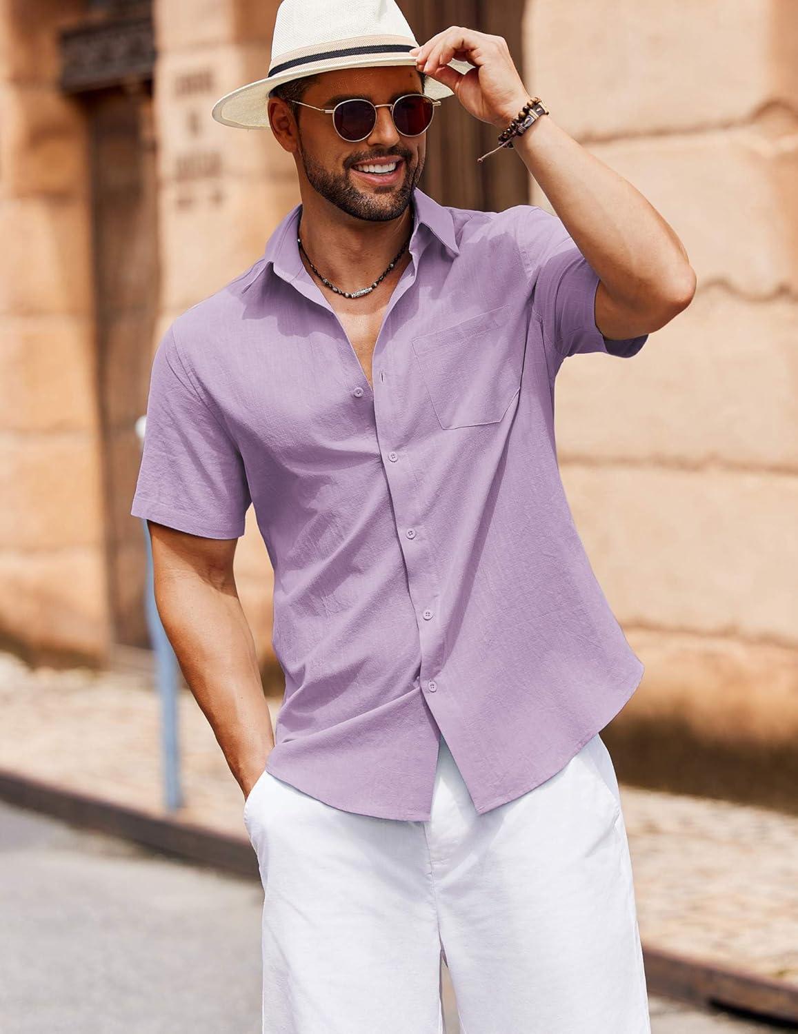 COOFANDY Men’s Button Down Short Sleeve Shirt Casual Cotton Summer Beach Linen Wedding Shirts with Pocket(Lavender)