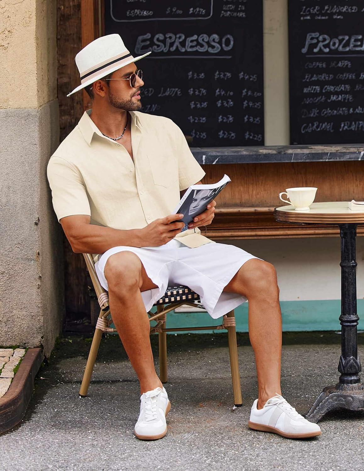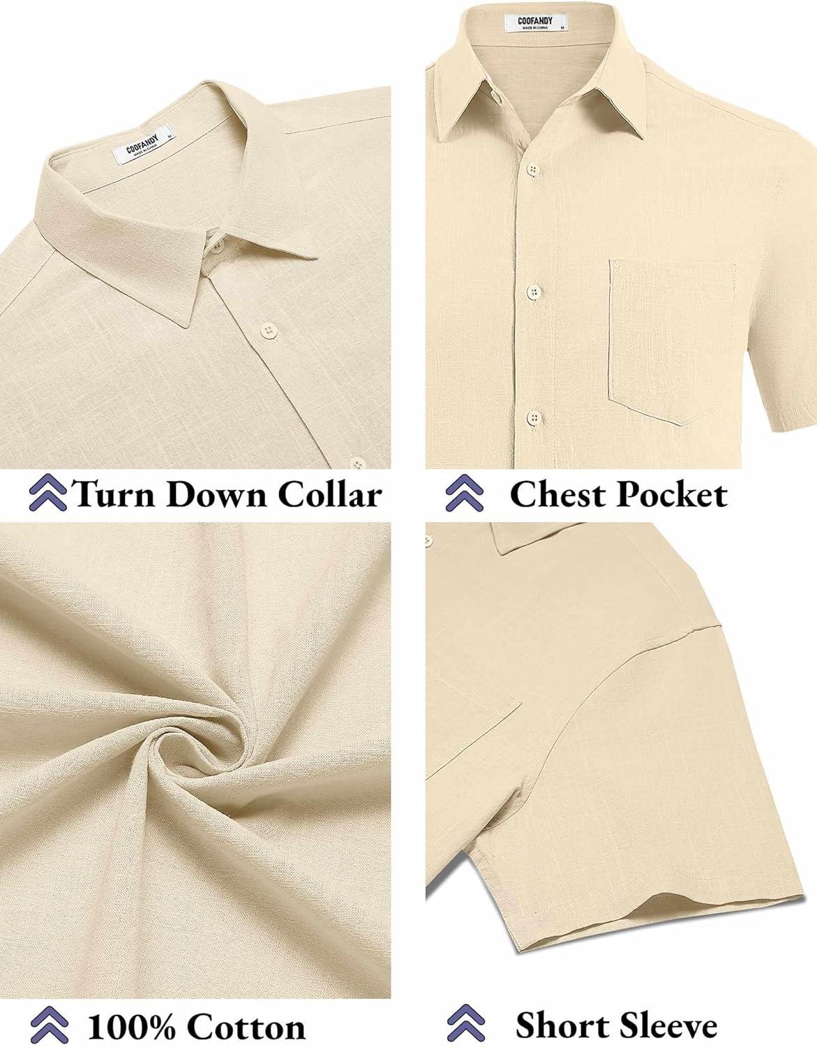 imageCOOFANDY Mens Button Down Short Sleeve Shirt Casual Cotton Summer Beach Linen Wedding Shirts with PocketLight Khaki
