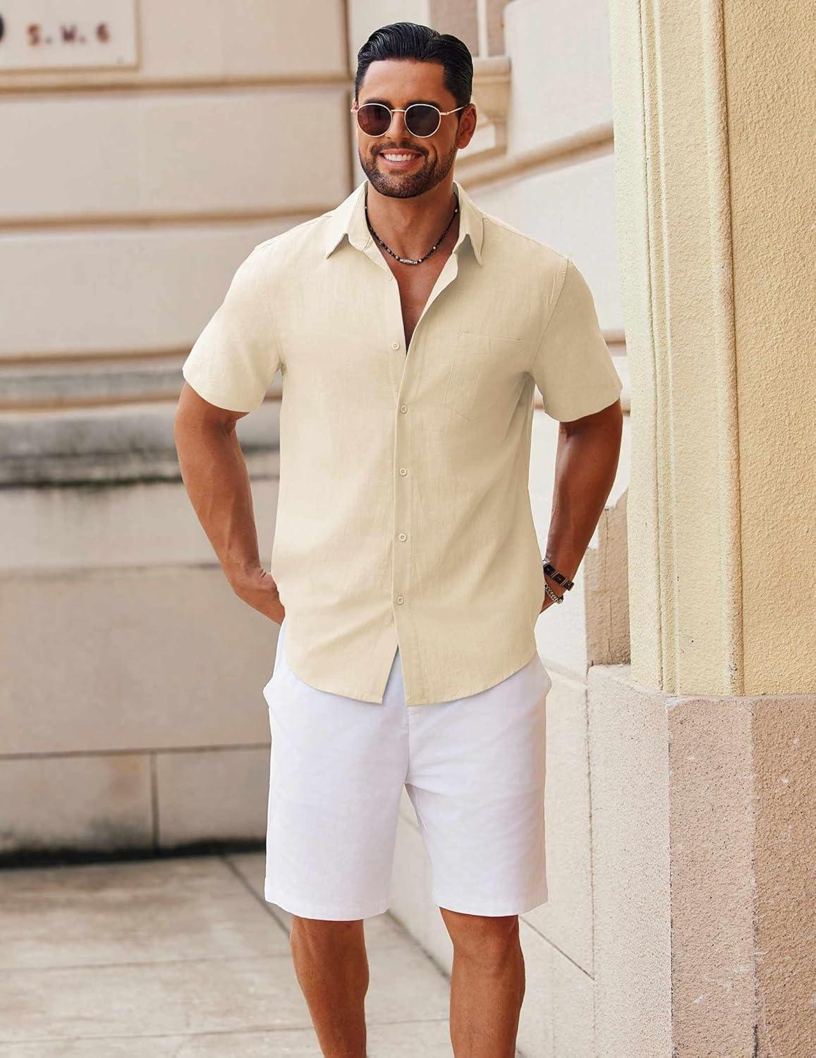 COOFANDY Men’s Button Down Short Sleeve Shirt Casual Cotton Summer Beach Linen Wedding Shirts with Pocket(Light Khaki)