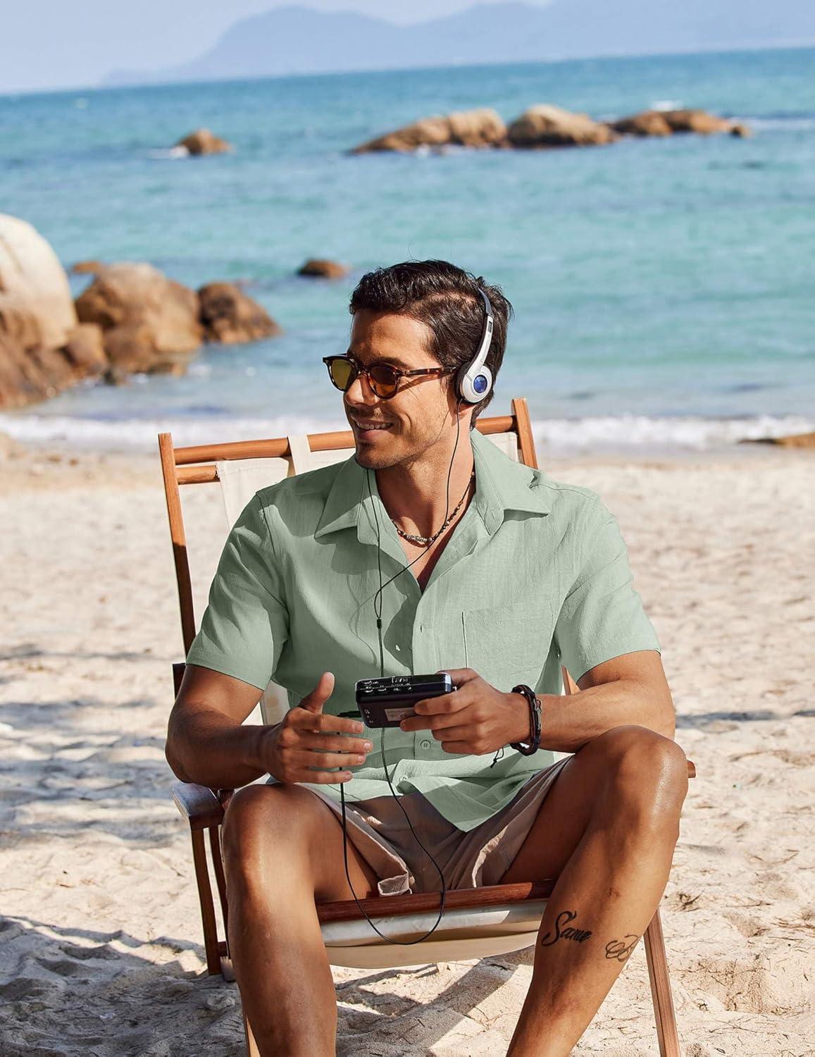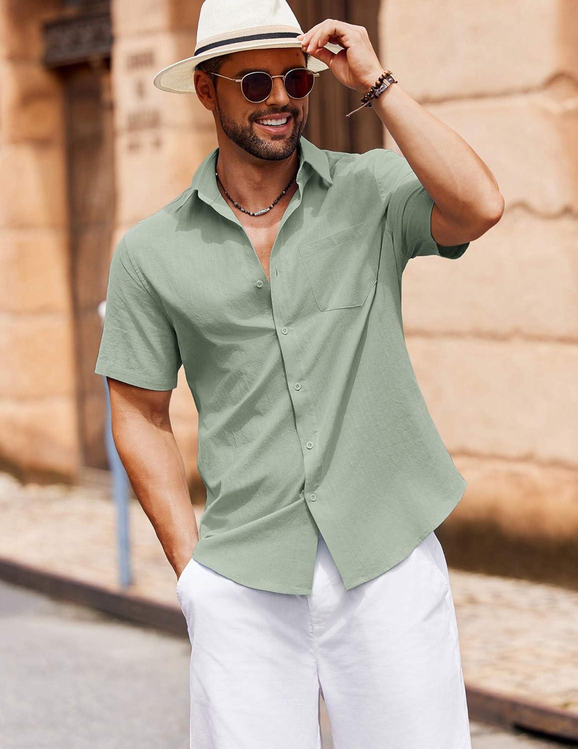 COOFANDY Men’s Button Down Short Sleeve Shirt Casual Cotton Summer Beach Linen Wedding Shirts with Pocket(Mint Green)