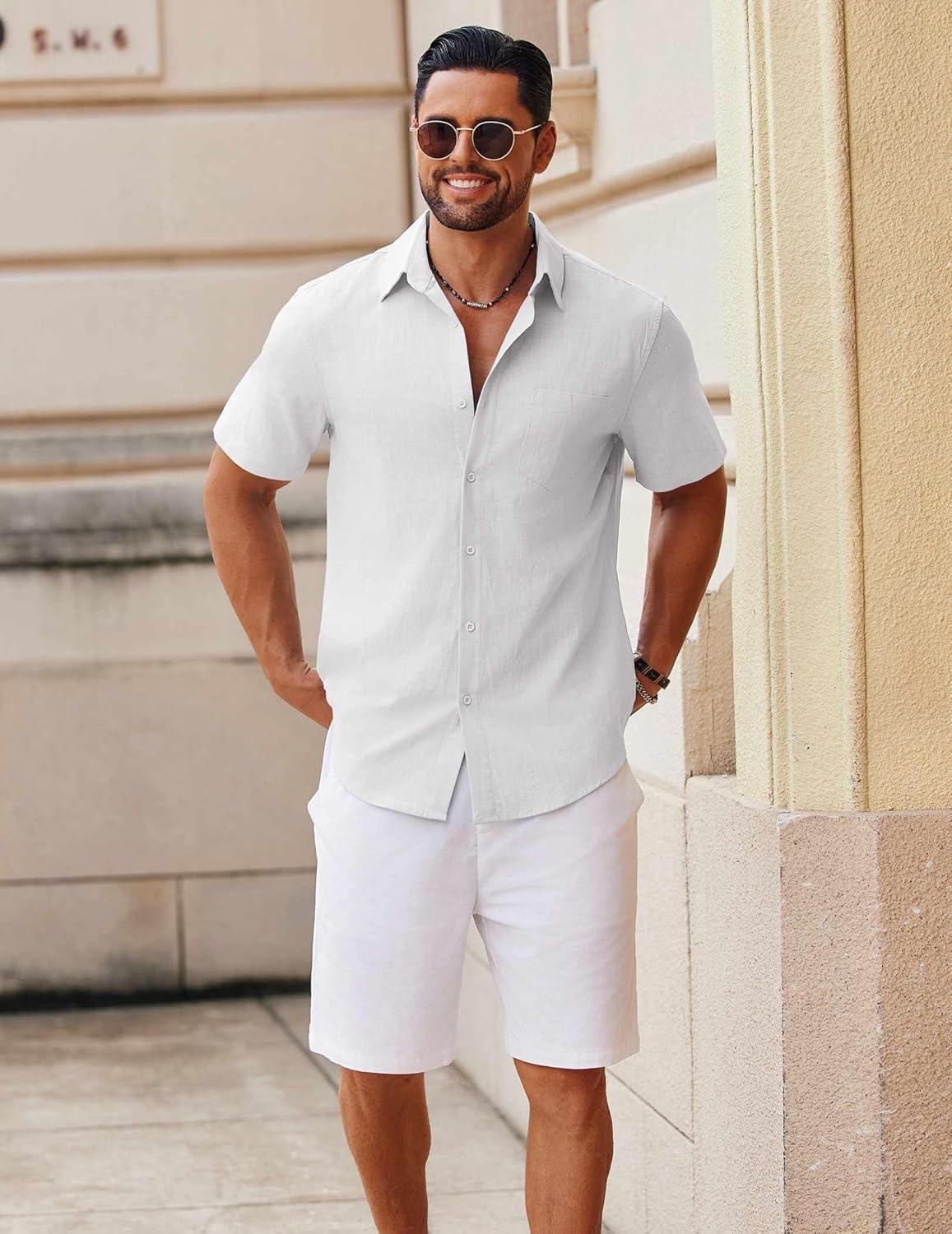 COOFANDY Men’s Button Down Short Sleeve Shirt Casual Cotton Summer Beach Linen Wedding Shirts with Pocket(White)