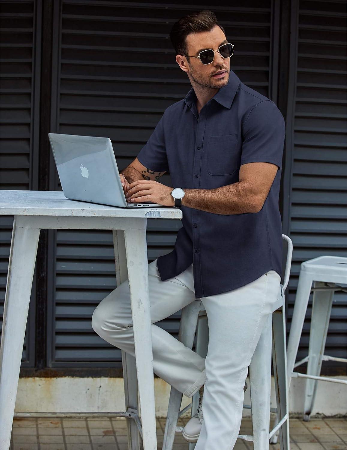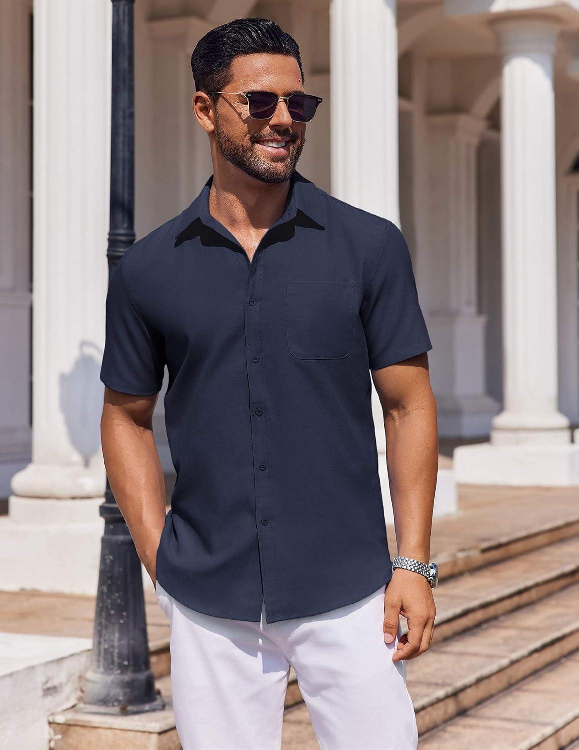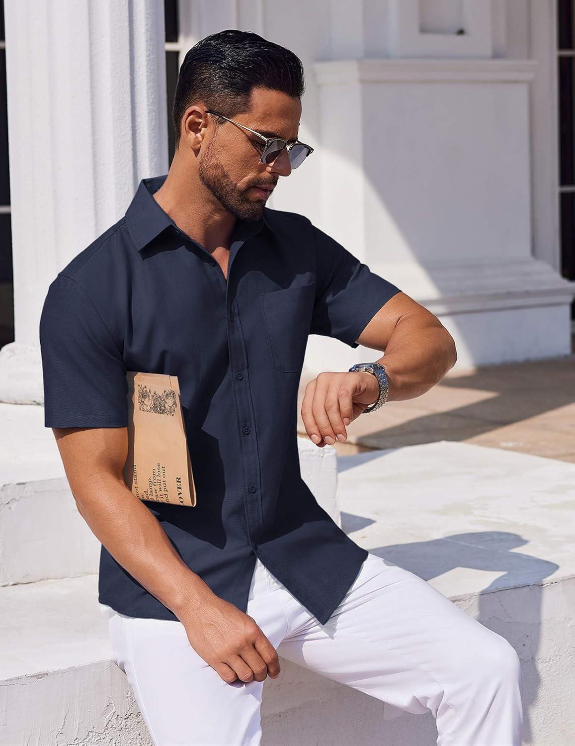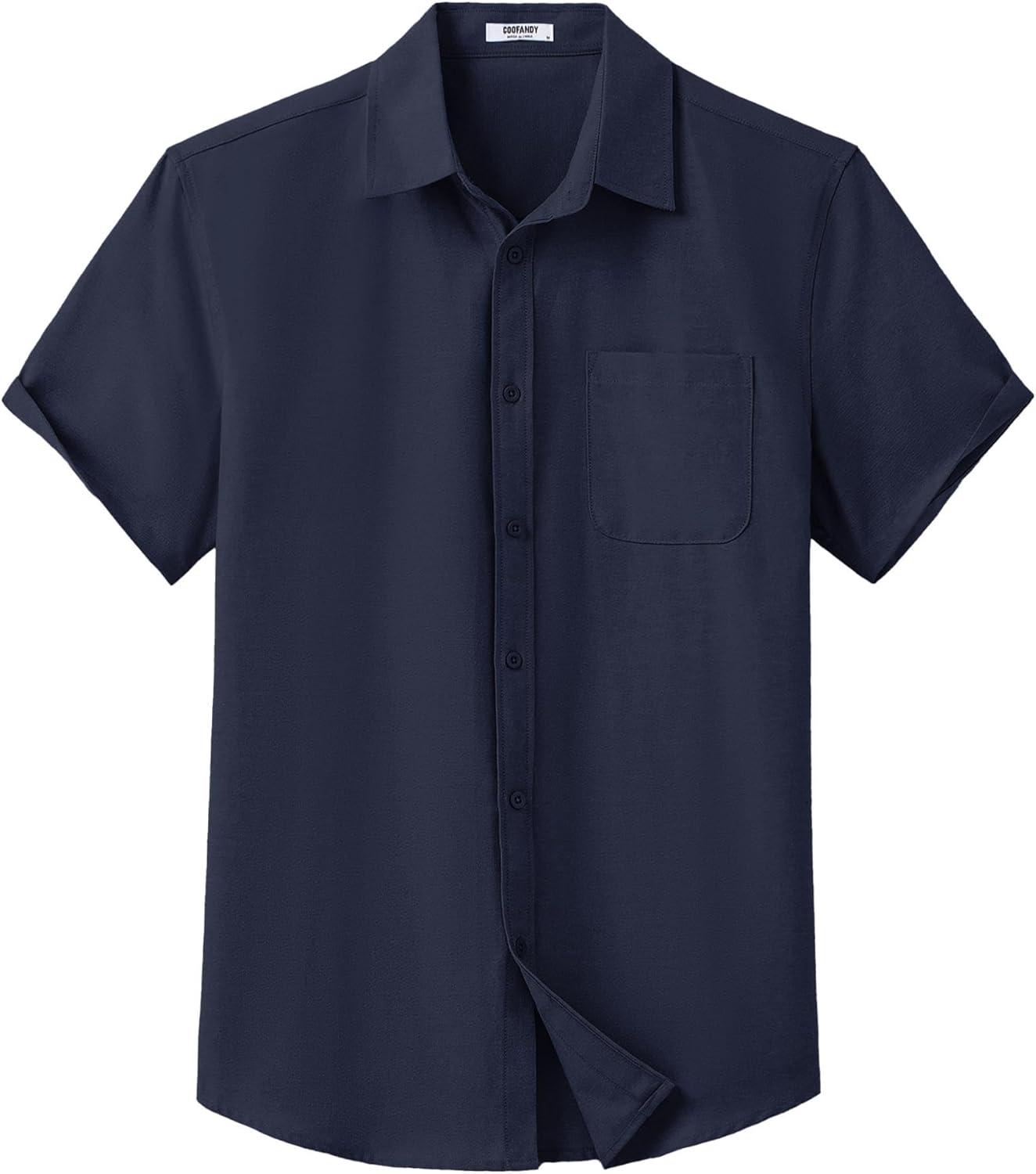 COOFANDY Mens Button Down Short Sleeve Shirt Casual Dress Shirt Untucked Summer Shirts with Pocket(Navy Blue)