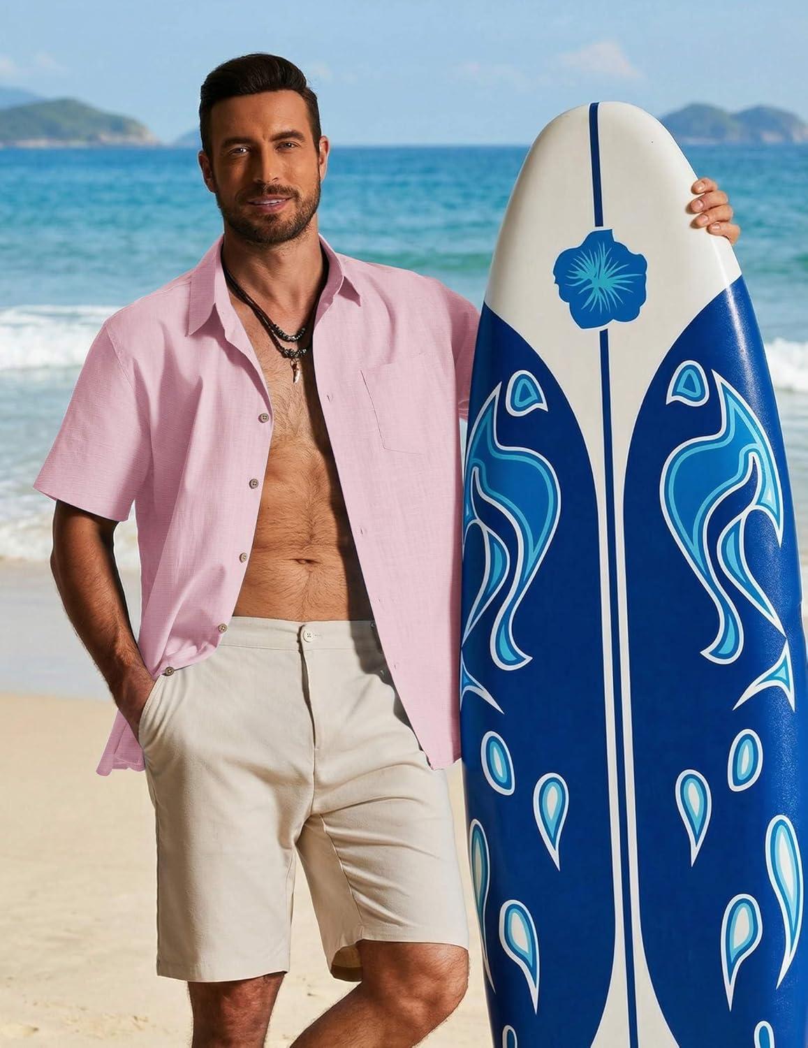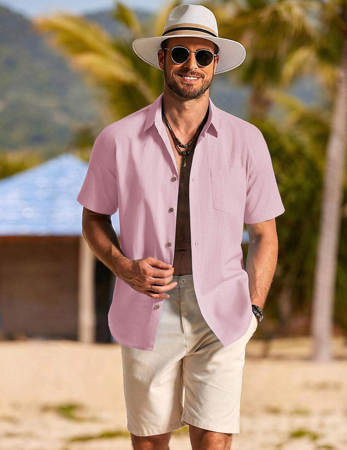 COOFANDY Men’s Button Down Short Sleeve Shirt Cotton Casual Summer Shirts Textured Beach Vacation Shirts for Men(Icy Pink)