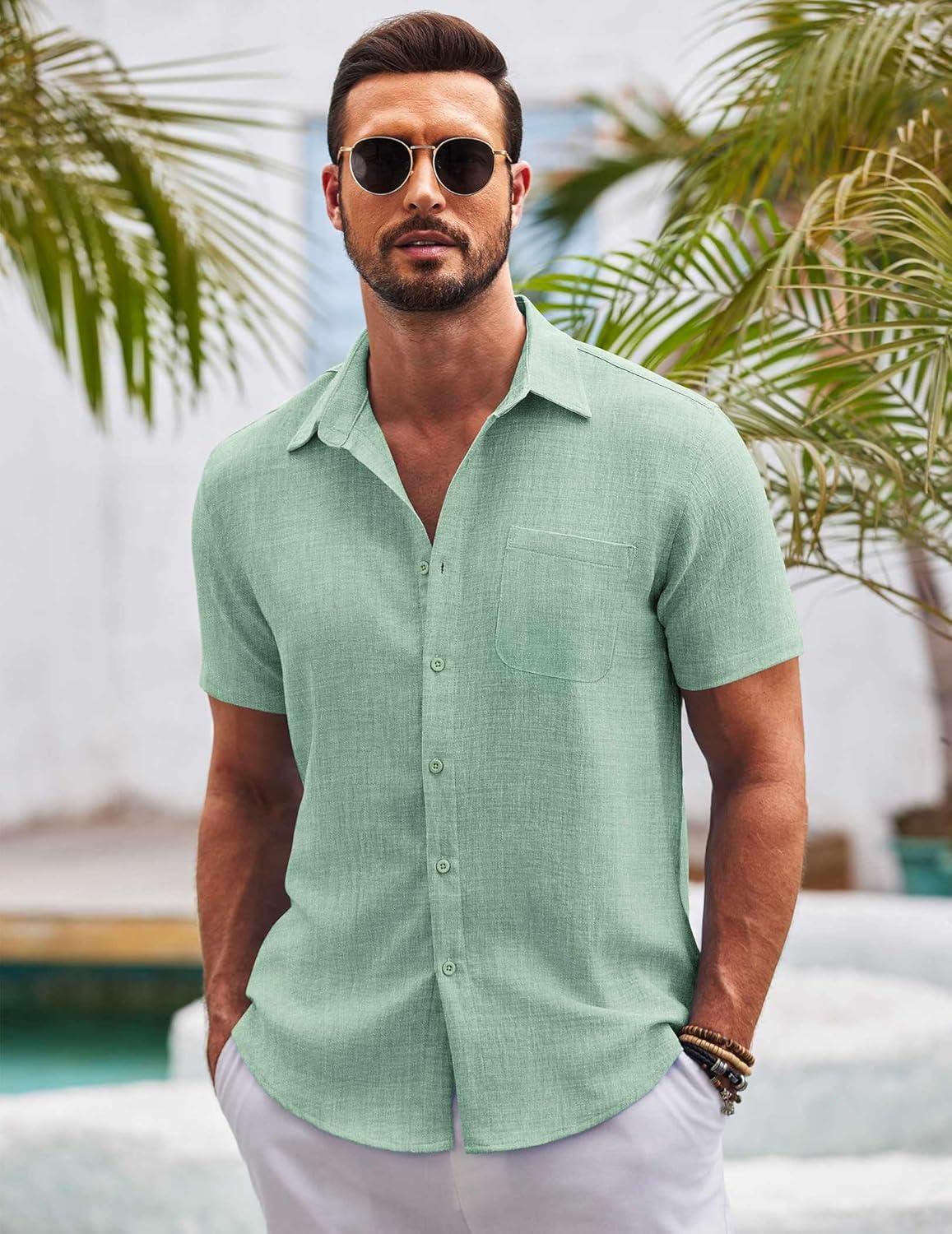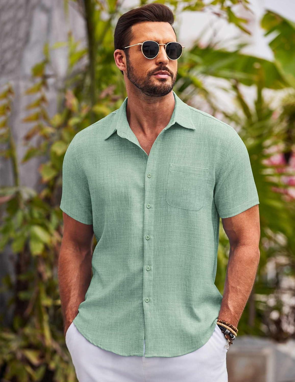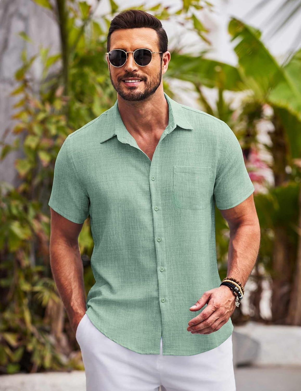 COOFANDY Mens Button Down Short Sleeve Shirts Casual Textured Shirt with Pocket Summer Beach Wedding Shirts(Ice Green)
