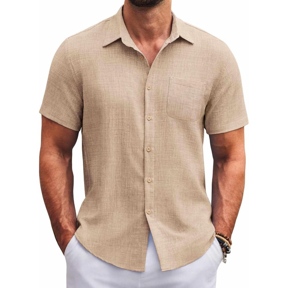 imageCOOFANDY Mens Button Down Short Sleeve Shirts Casual Textured Shirt with Pocket Summer Beach Wedding ShirtsKhaki