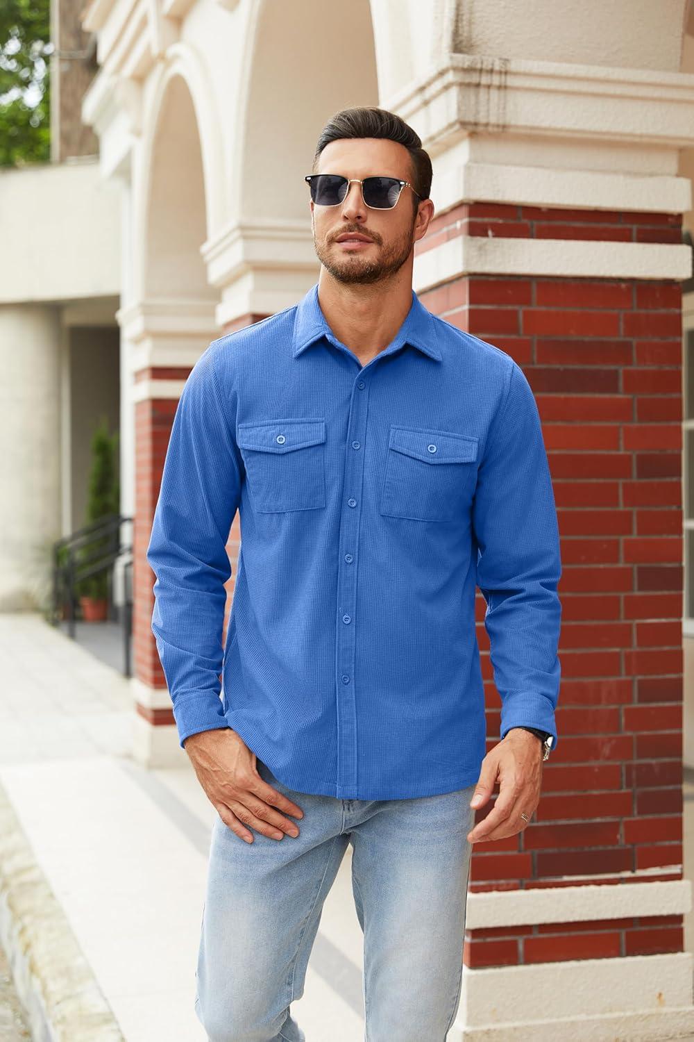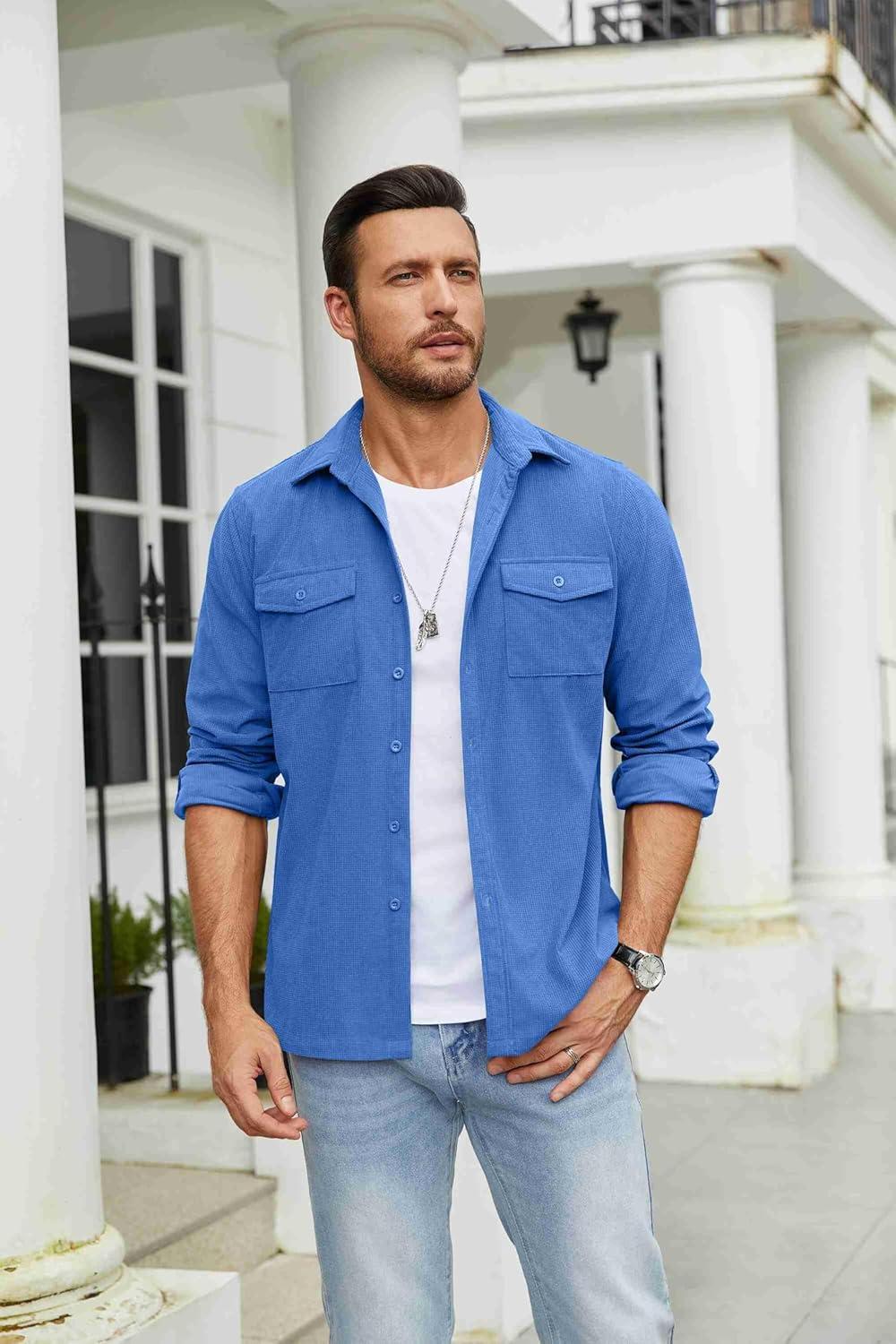 COOFANDY Men’s Button Down Waffle Shirt Jacket Casual Long Sleeve Shacket Lightweight Overshirts with Flap Pockets(Blue)